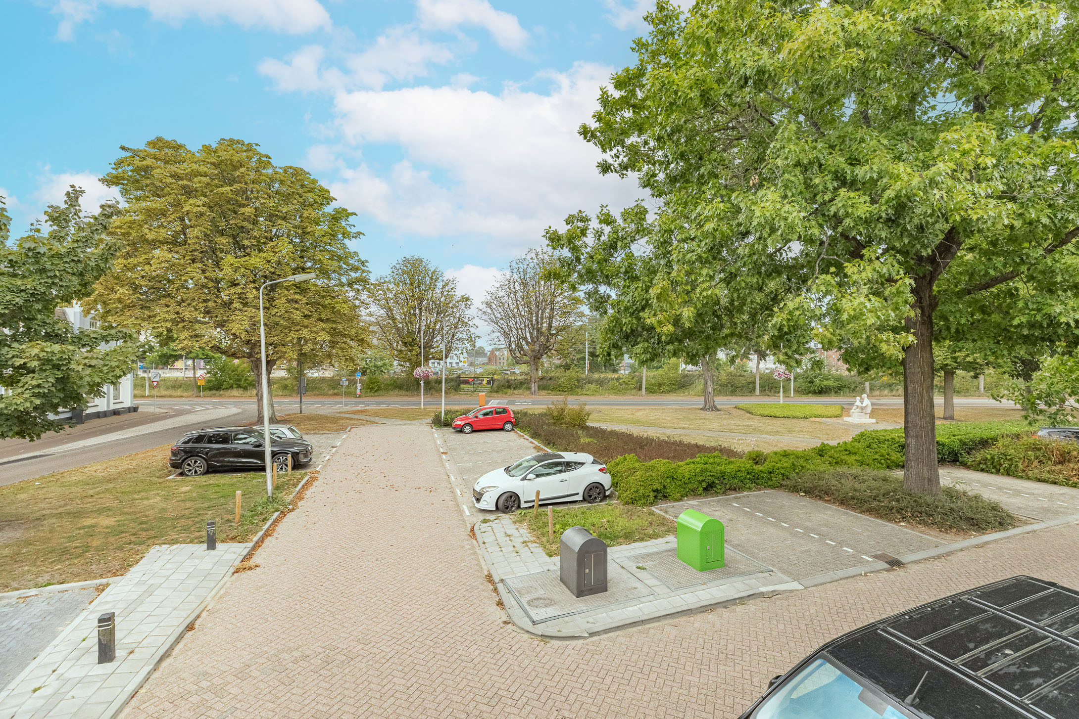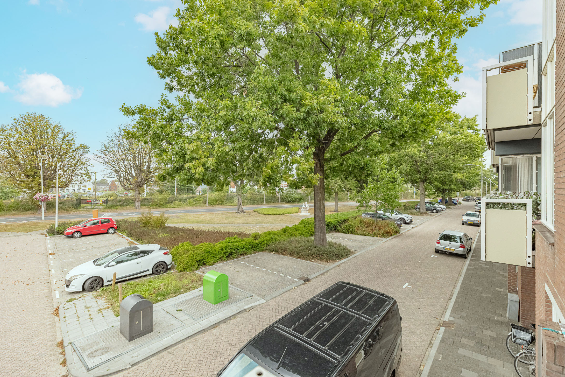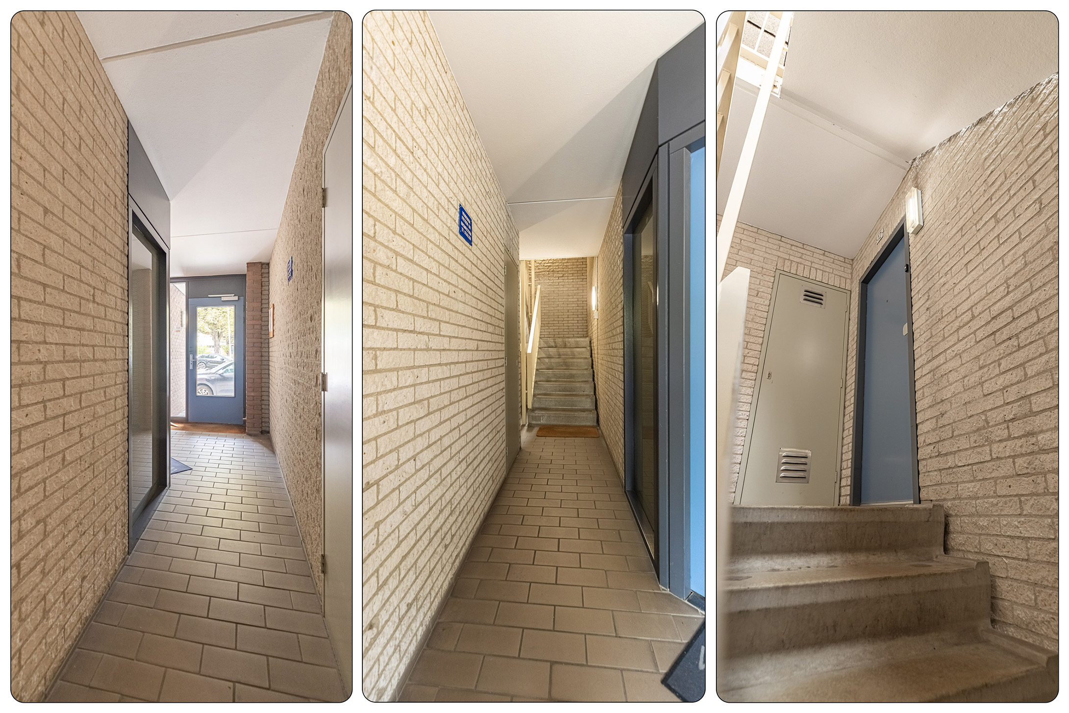 U kunt uw auto parkeren in een van de parkeervakken voor het appartementencomplex, waar vrijwel altijd plaats is. Via de centrale entree, met de brievenbussen en het bellenplateau, bereikt u de trapopgang naar het appartement.