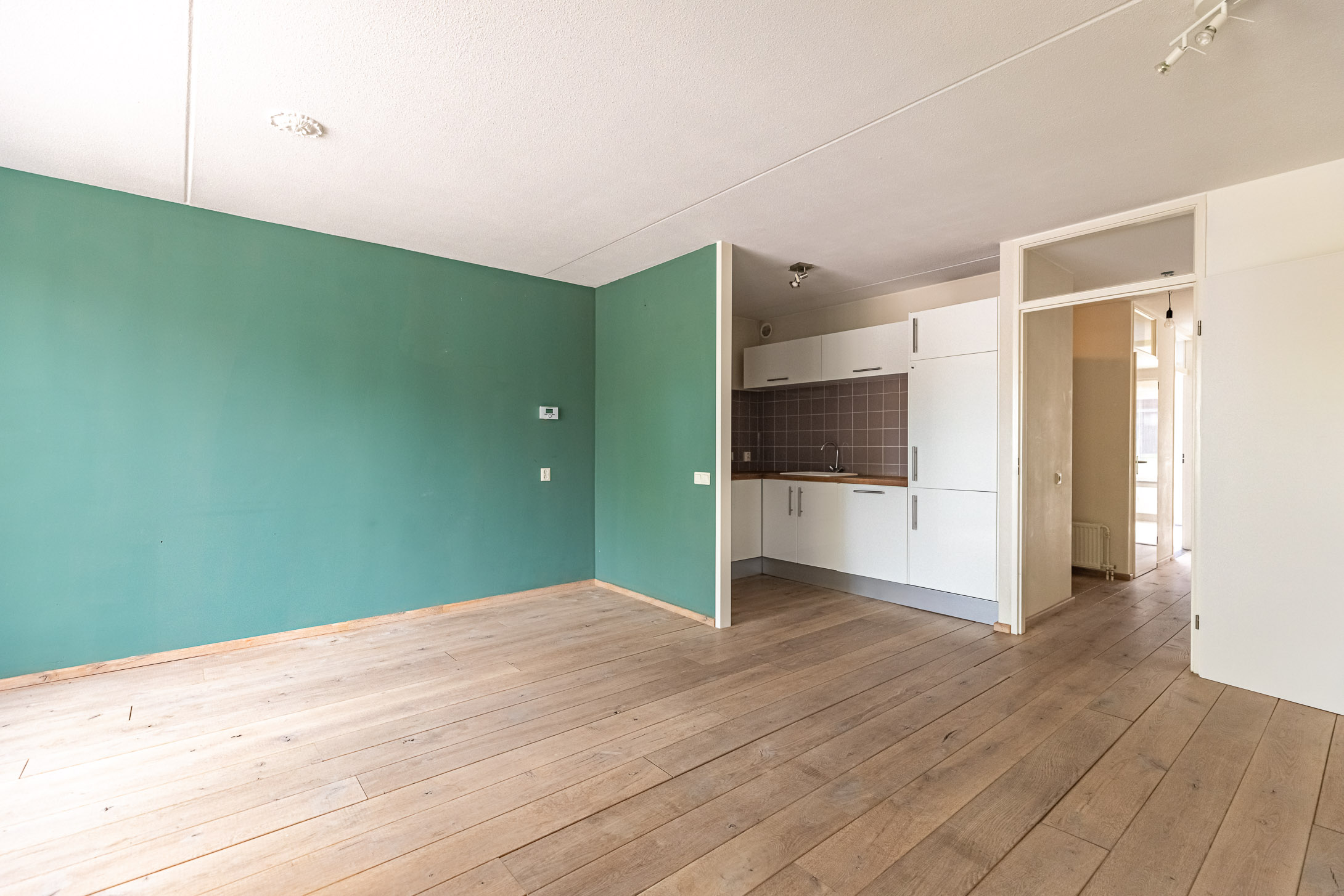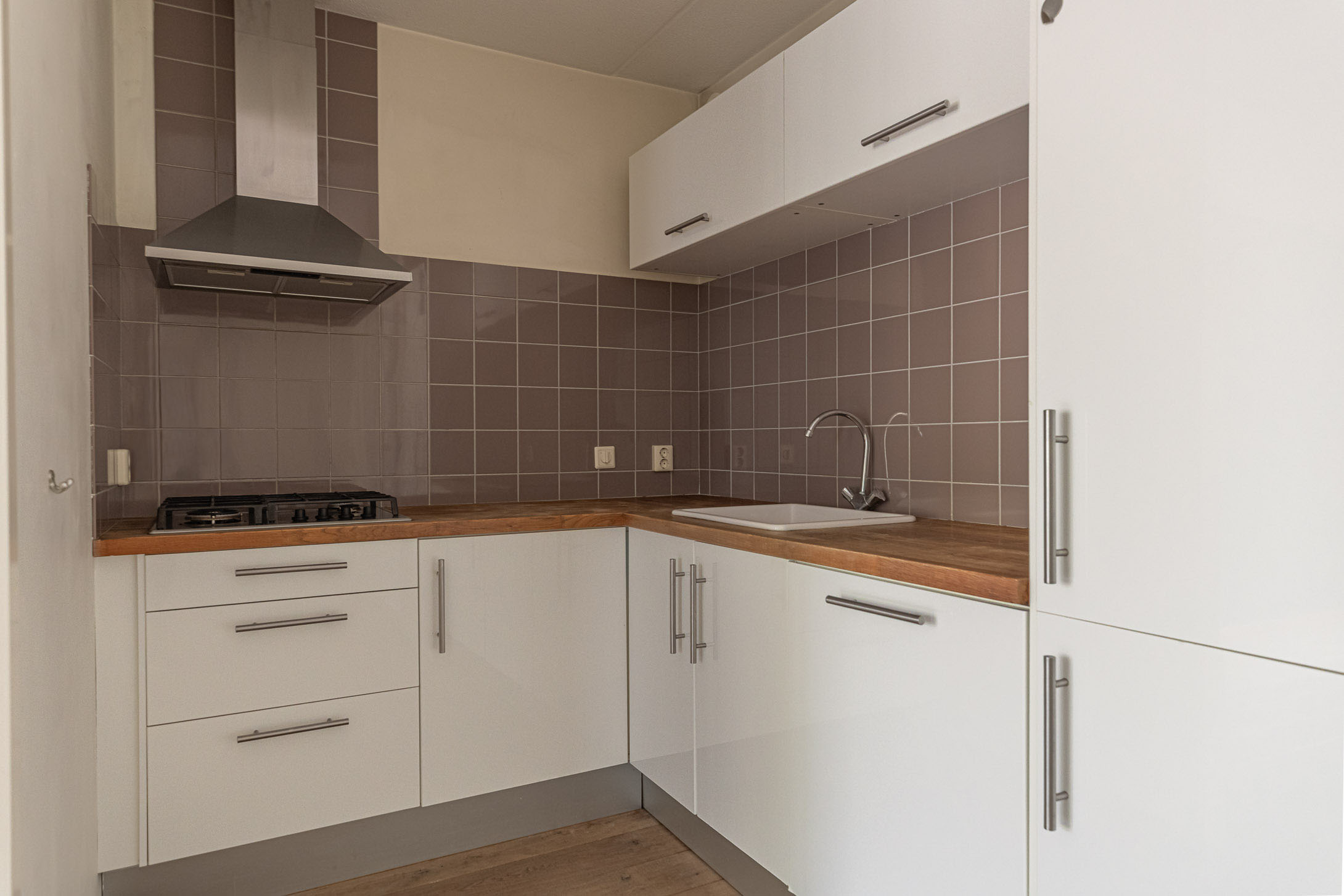 De woonkamer is voorzien van een houten vloer en stucwerk wandafwerking. De grote raampartijen zorgen voor voldoende lichtinval. Vanuit de woonkamer is er toegang tot het balkon, waar het heerlijk vertoeven is. De moderne open keuken is voorzien van een kookplaat met afzuigkap, koelvries-combinatie en vaatwasser. Er is genoeg kastruimte voor het opbergen van al uw keukenspullen.