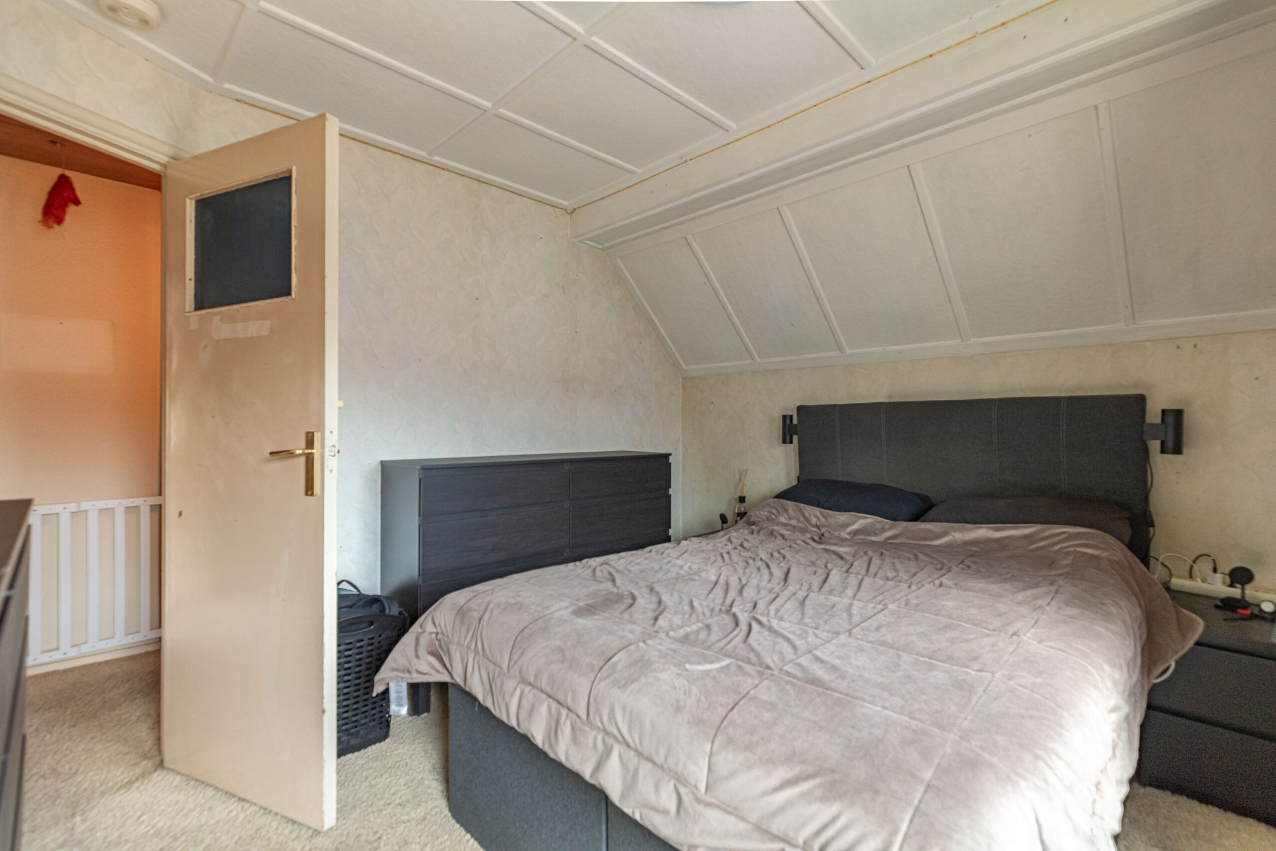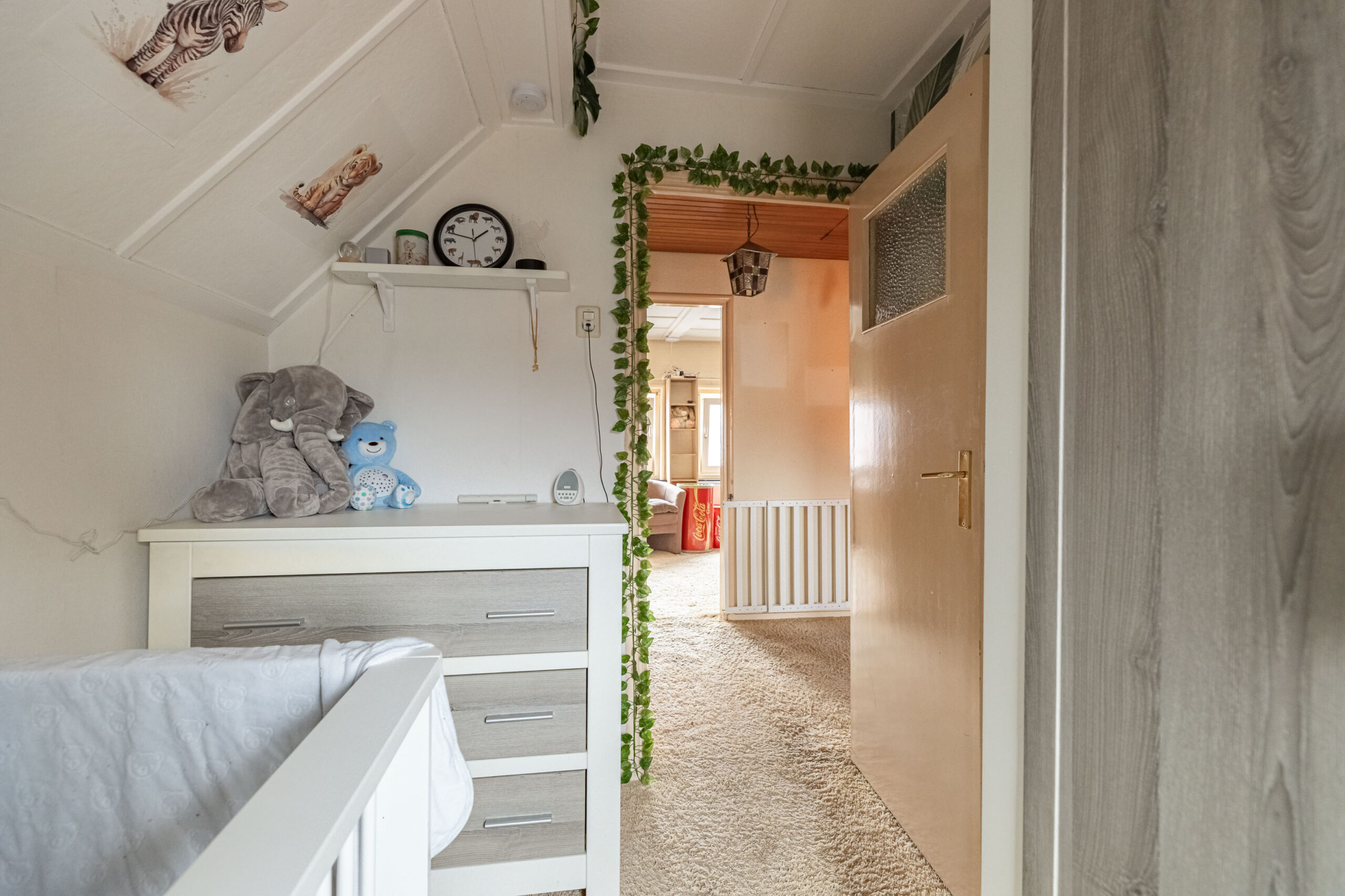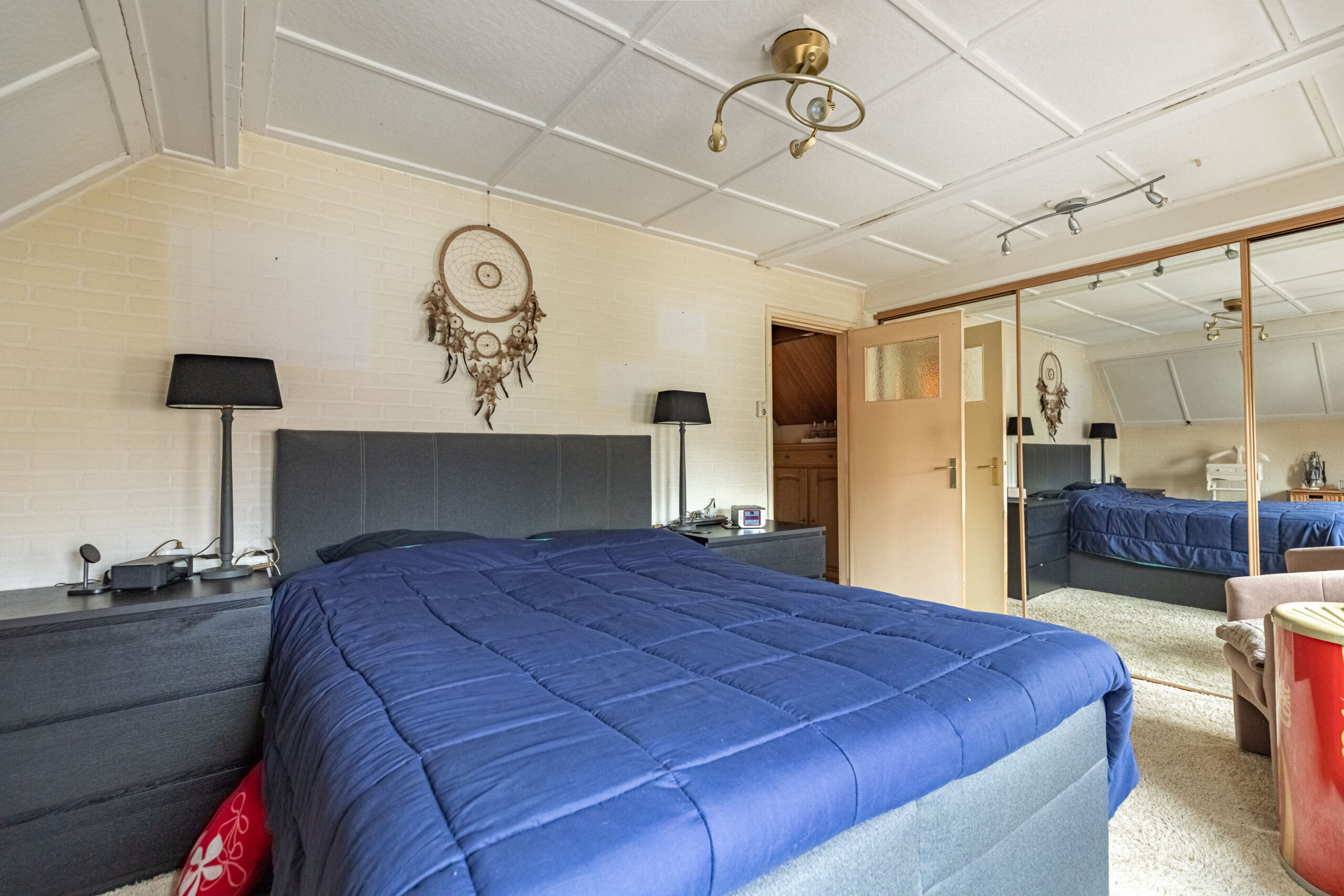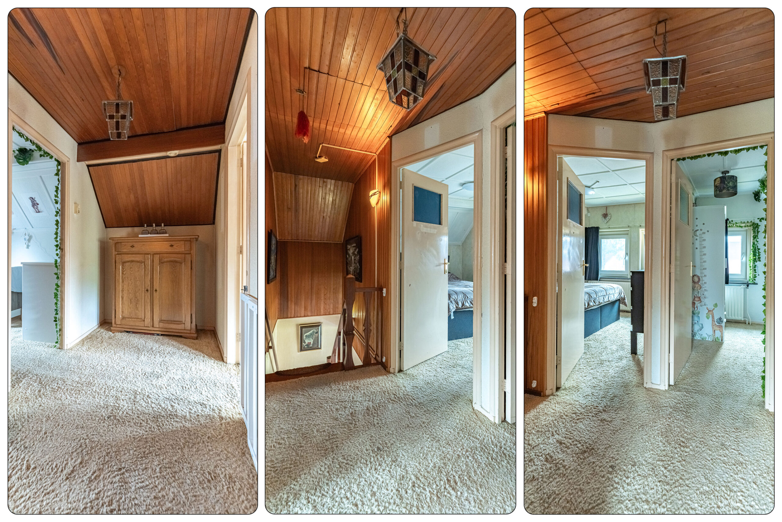 Via de trapopgang in de woonkamer kom je op de eerste verdieping. Hier bevinden zich drie slaapkamers, allemaal voorzien van vloerbedekking en een nette vliesbehangafwerking. Op de overloop bevindt zich een vlizotrap die toegang biedt tot de ruime bergzolder — ideaal voor extra opslagruimte.