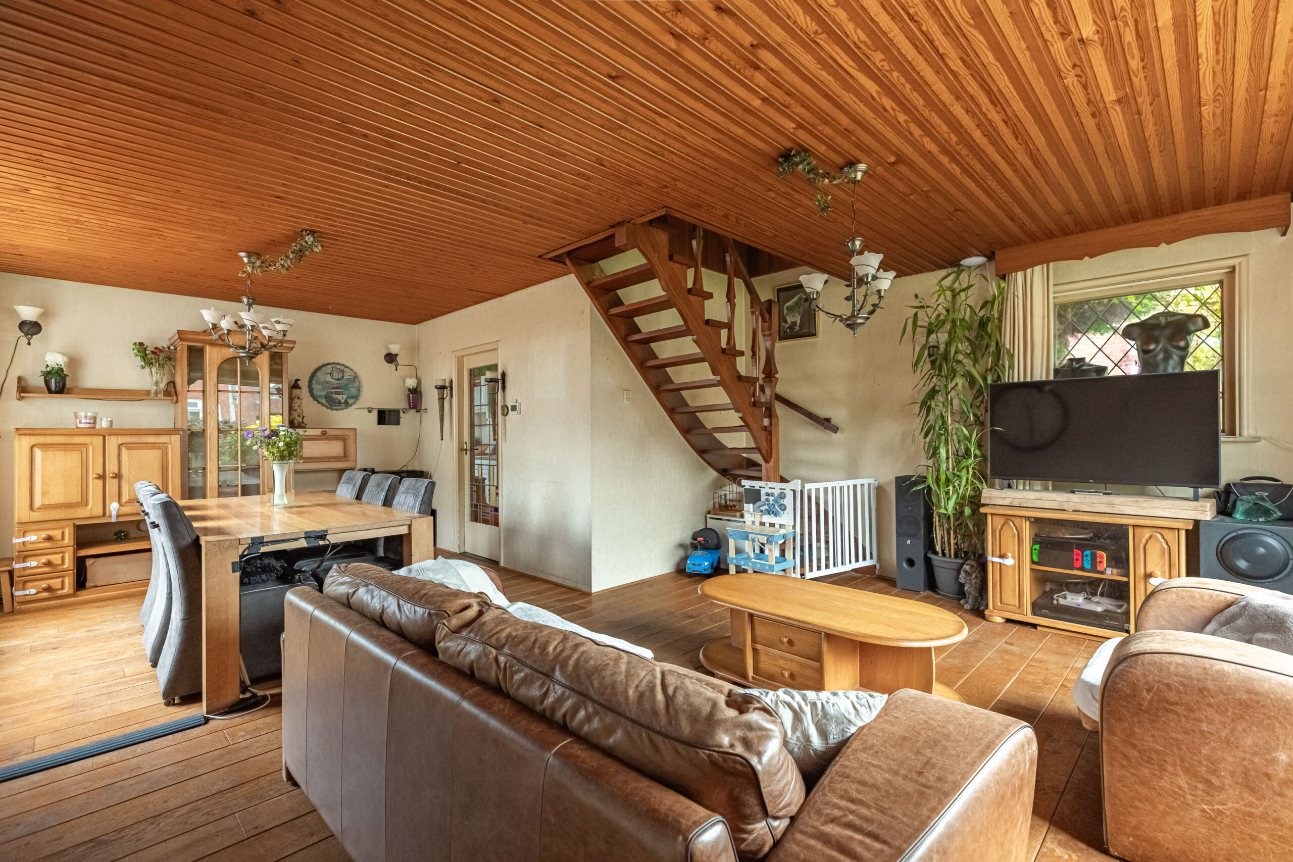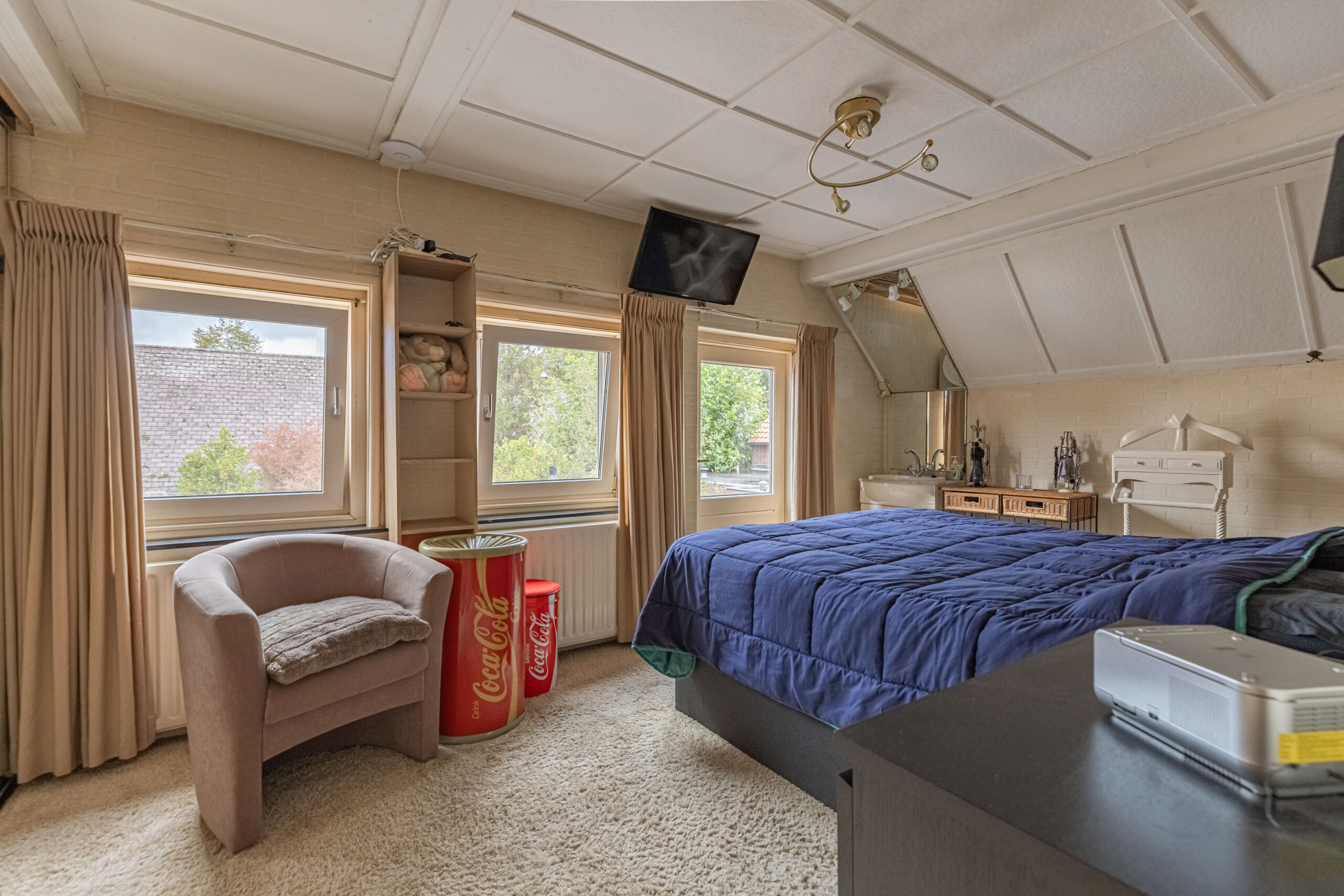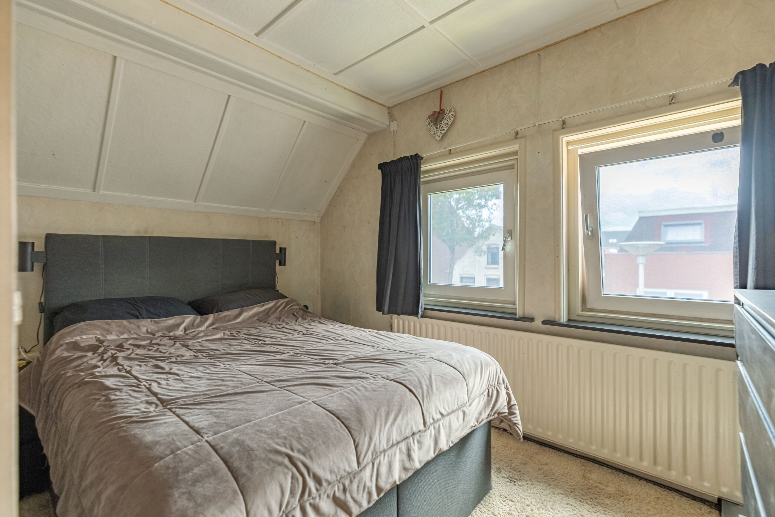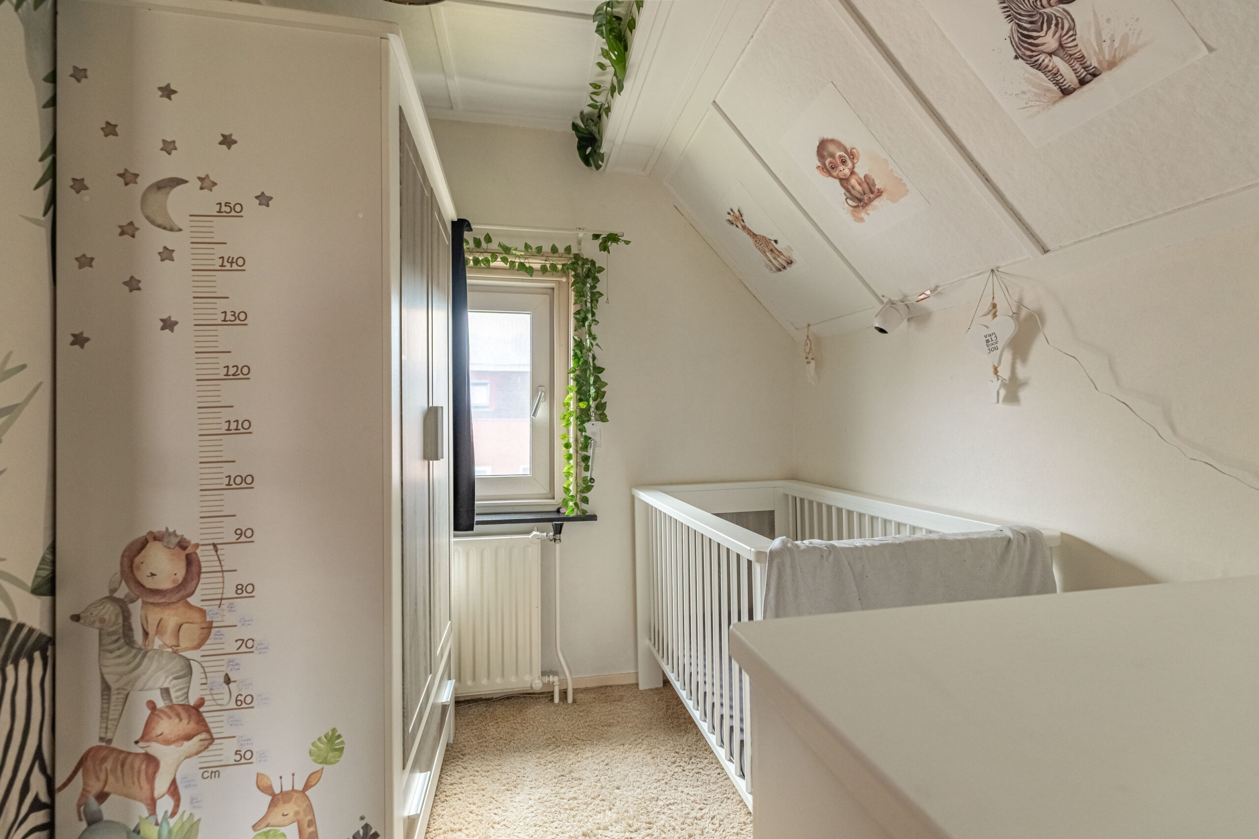 Via de trapopgang in de woonkamer kom je op de eerste verdieping. Hier bevinden zich drie slaapkamers, allemaal voorzien van vloerbedekking en een nette vliesbehangafwerking. Op de overloop bevindt zich een vlizotrap die toegang biedt tot de ruime bergzolder — ideaal voor extra opslagruimte.