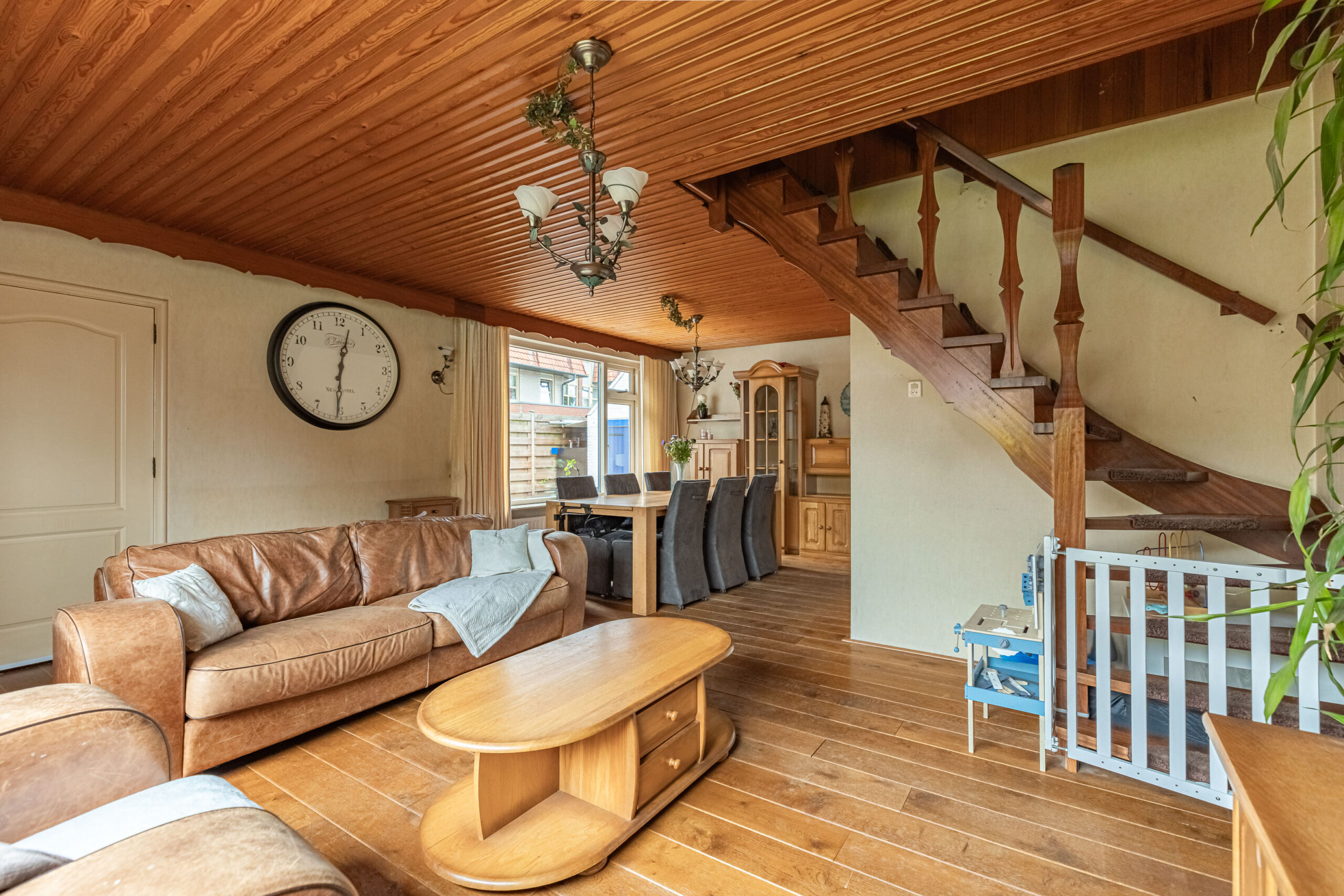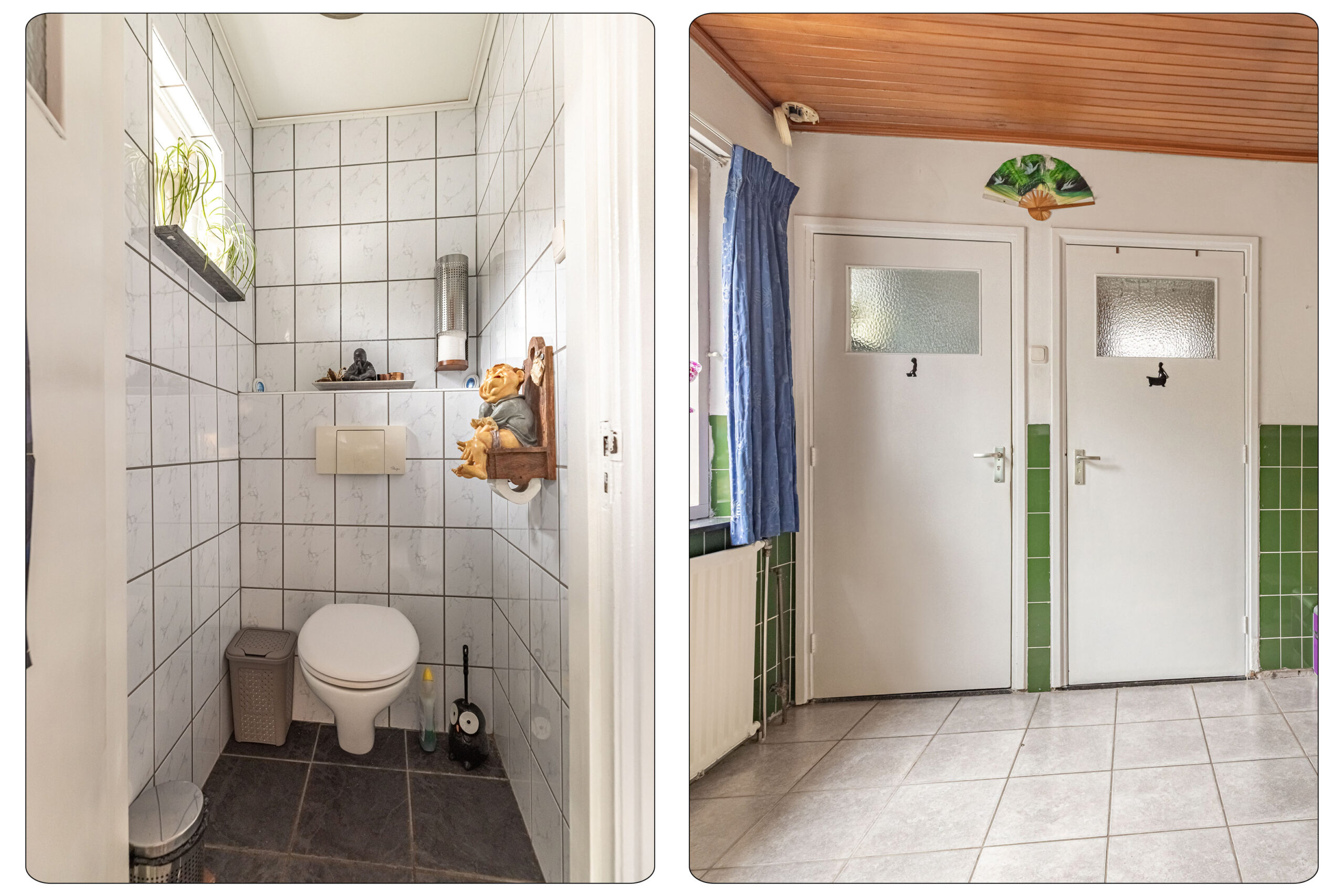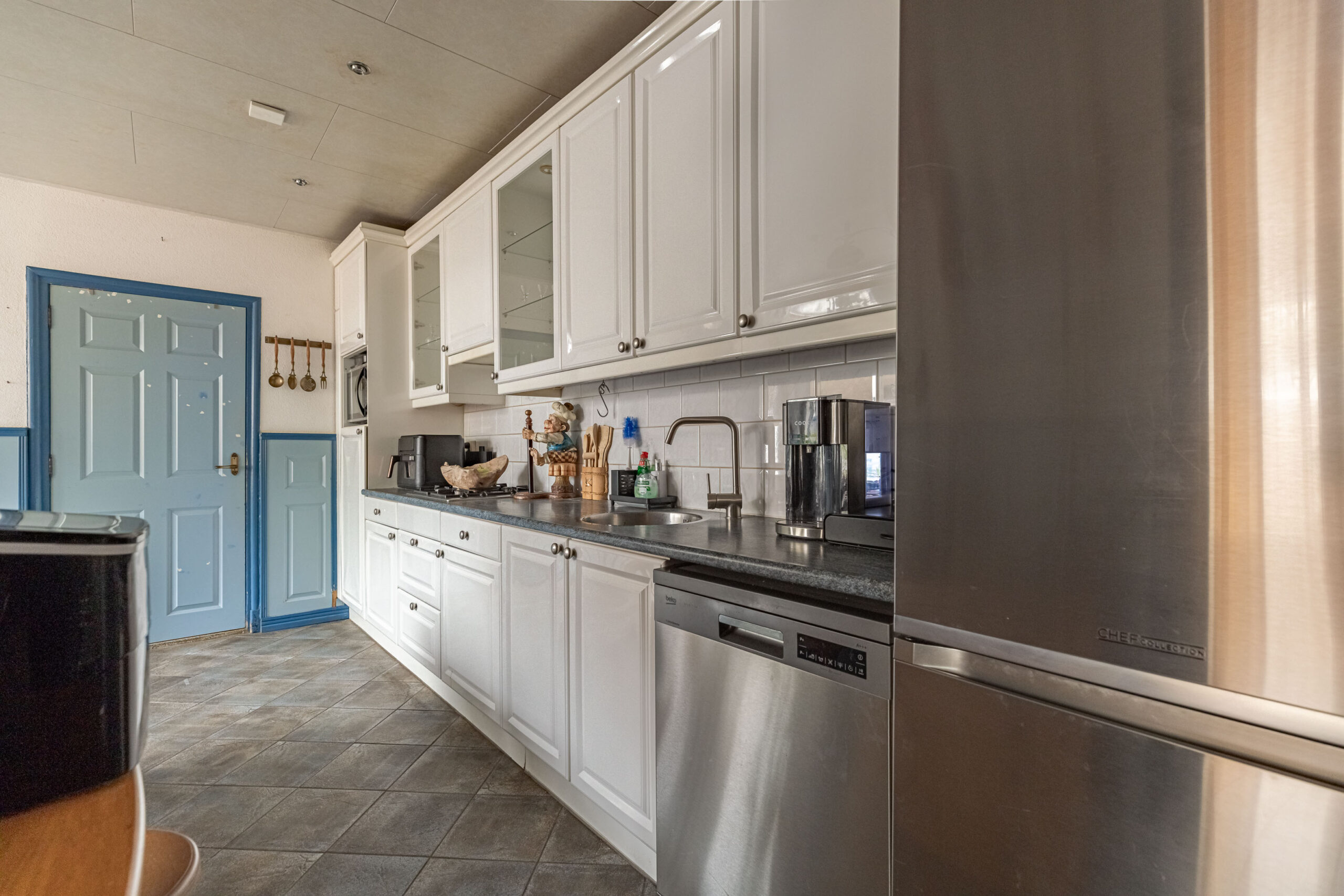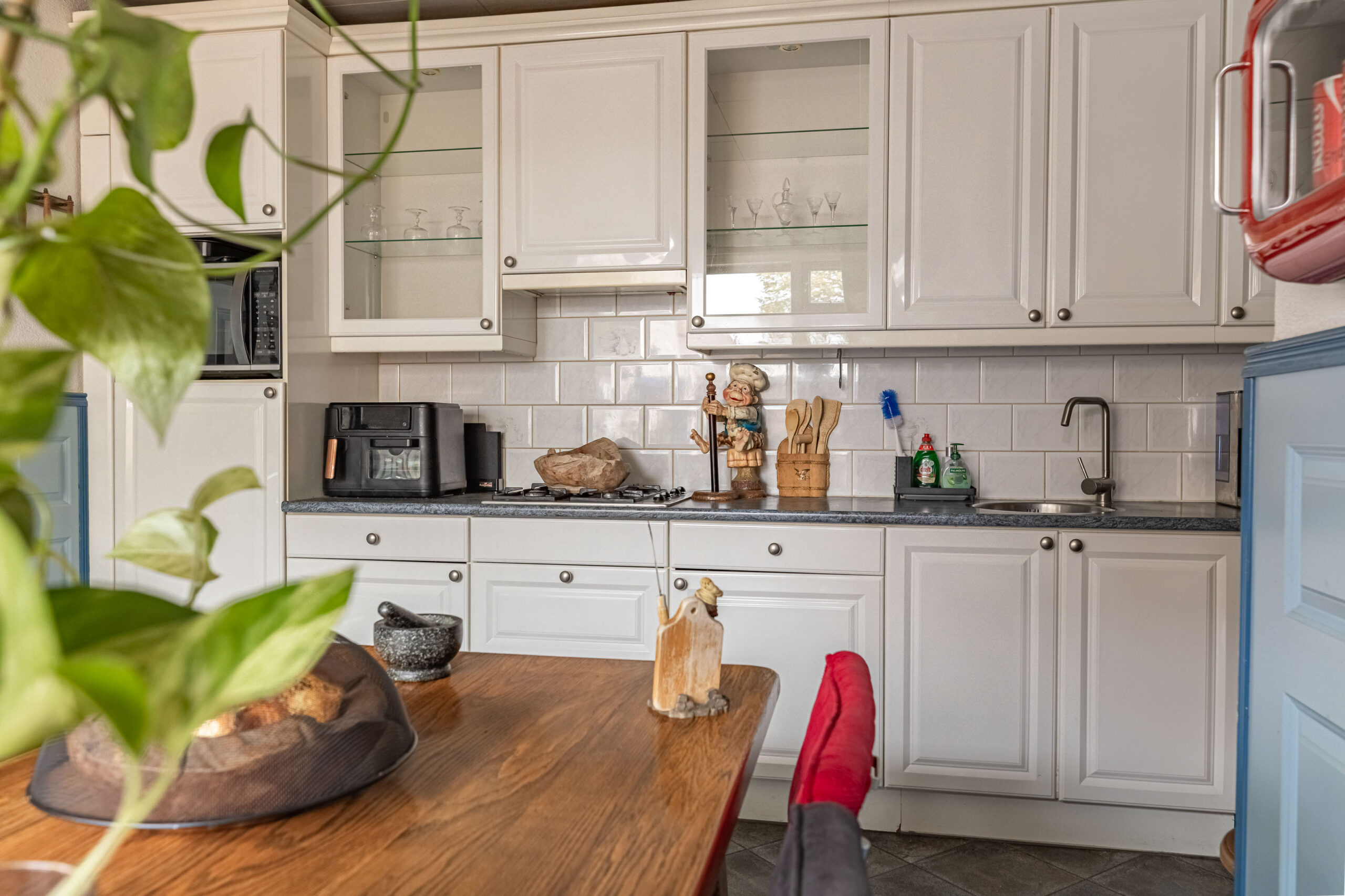 De woonkamer is in een L-opstelling en loopt over in de ruime woonkeuken. Hier ligt een tegelvloer en ook hier valt het licht mooi naar binnen door het grote raam. De keuken is een fijne plek om samen te koken of uitgebreid te tafelen met familie en vrienden. Er is bovendien een handige opbergkast aanwezig. Aansluitend aan de keuken ligt de bijkeuken met de aansluitingen voor wasmachine en droger en de opstelling van de cv-ketel. Vanuit hier bereik je ook het geheel betegelde toilet en de badkamer, voorzien van een bad, douche en wastafel met meubel.