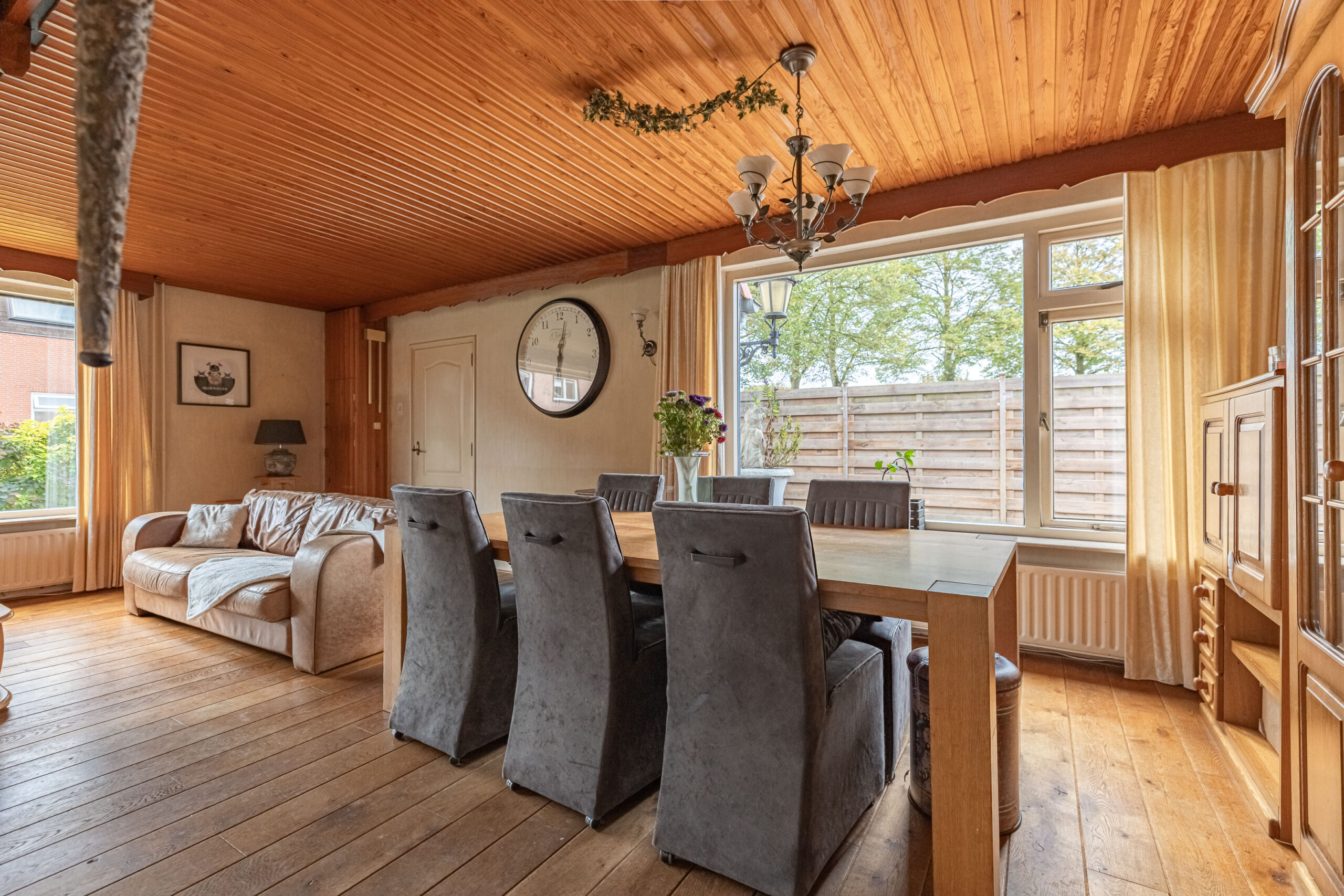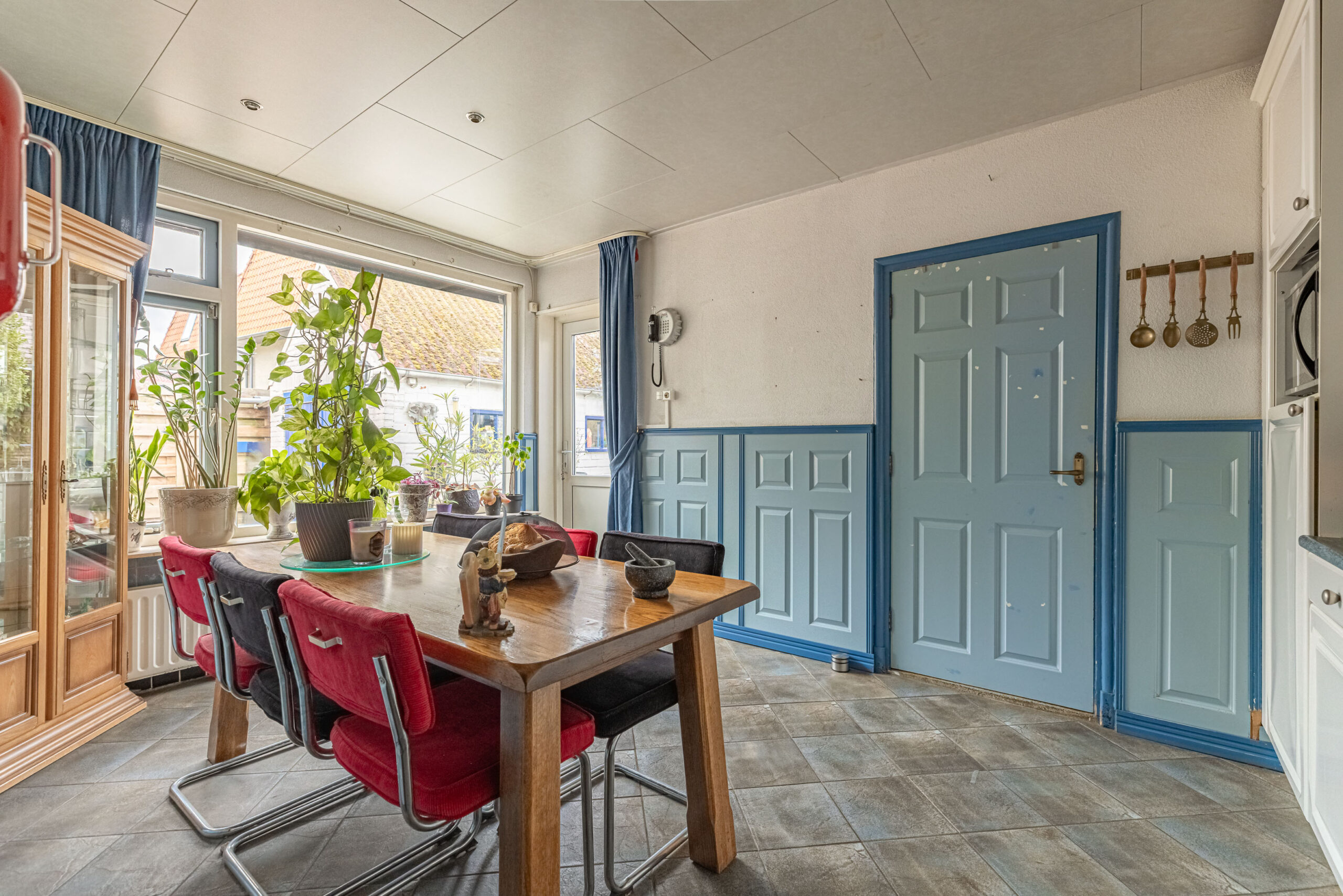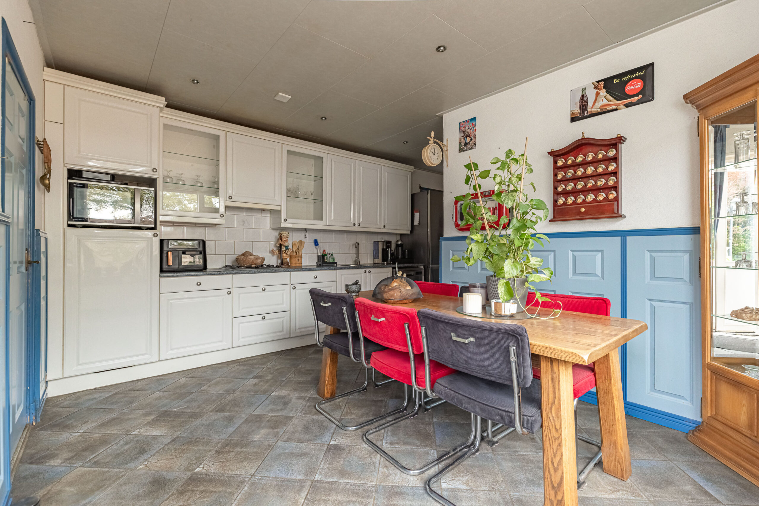 De woonkamer is in een L-opstelling en loopt over in de ruime woonkeuken. Hier ligt een tegelvloer en ook hier valt het licht mooi naar binnen door het grote raam. De keuken is een fijne plek om samen te koken of uitgebreid te tafelen met familie en vrienden. Er is bovendien een handige opbergkast aanwezig. Aansluitend aan de keuken ligt de bijkeuken met de aansluitingen voor wasmachine en droger en de opstelling van de cv-ketel. Vanuit hier bereik je ook het geheel betegelde toilet en de badkamer, voorzien van een bad, douche en wastafel met meubel.