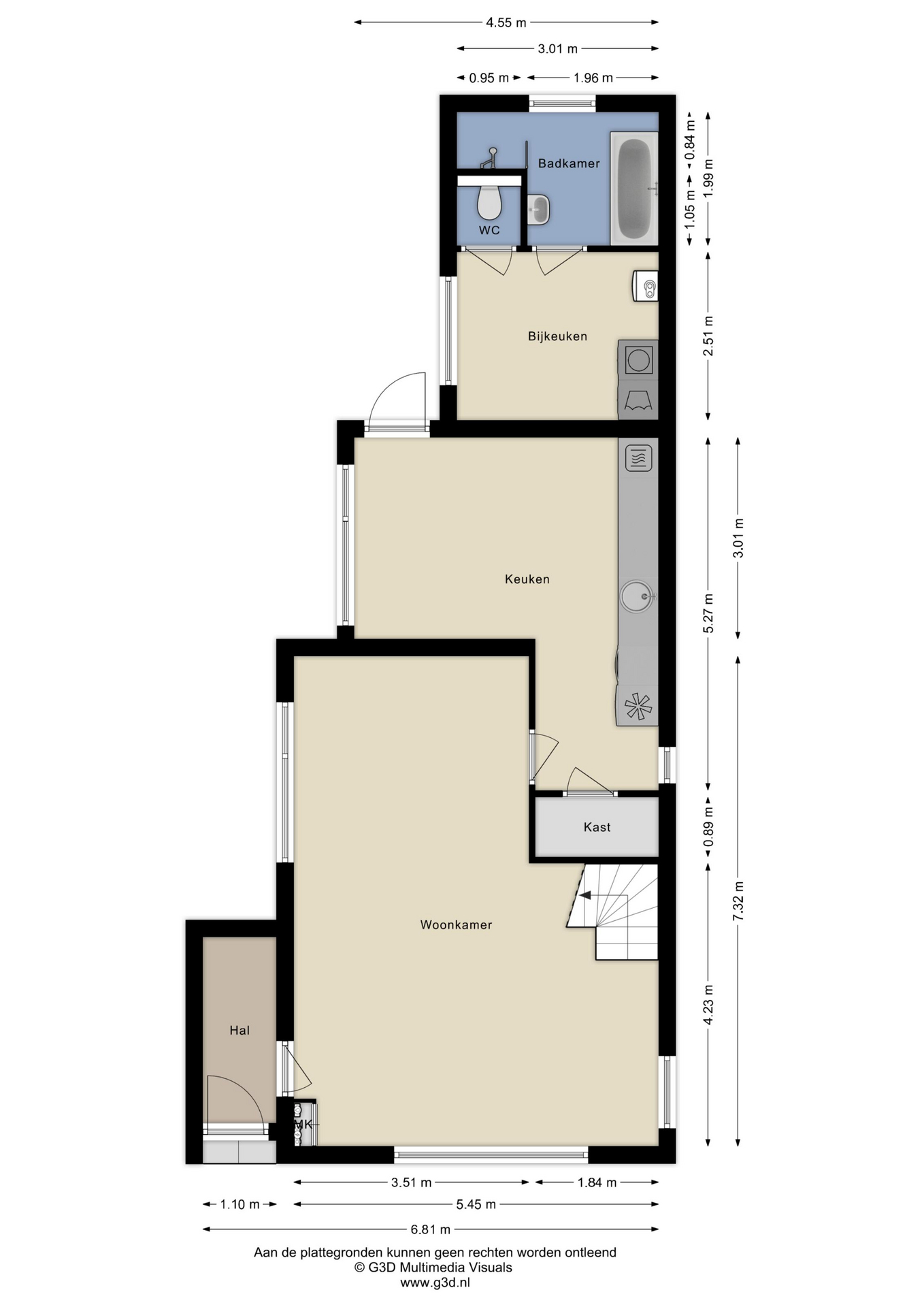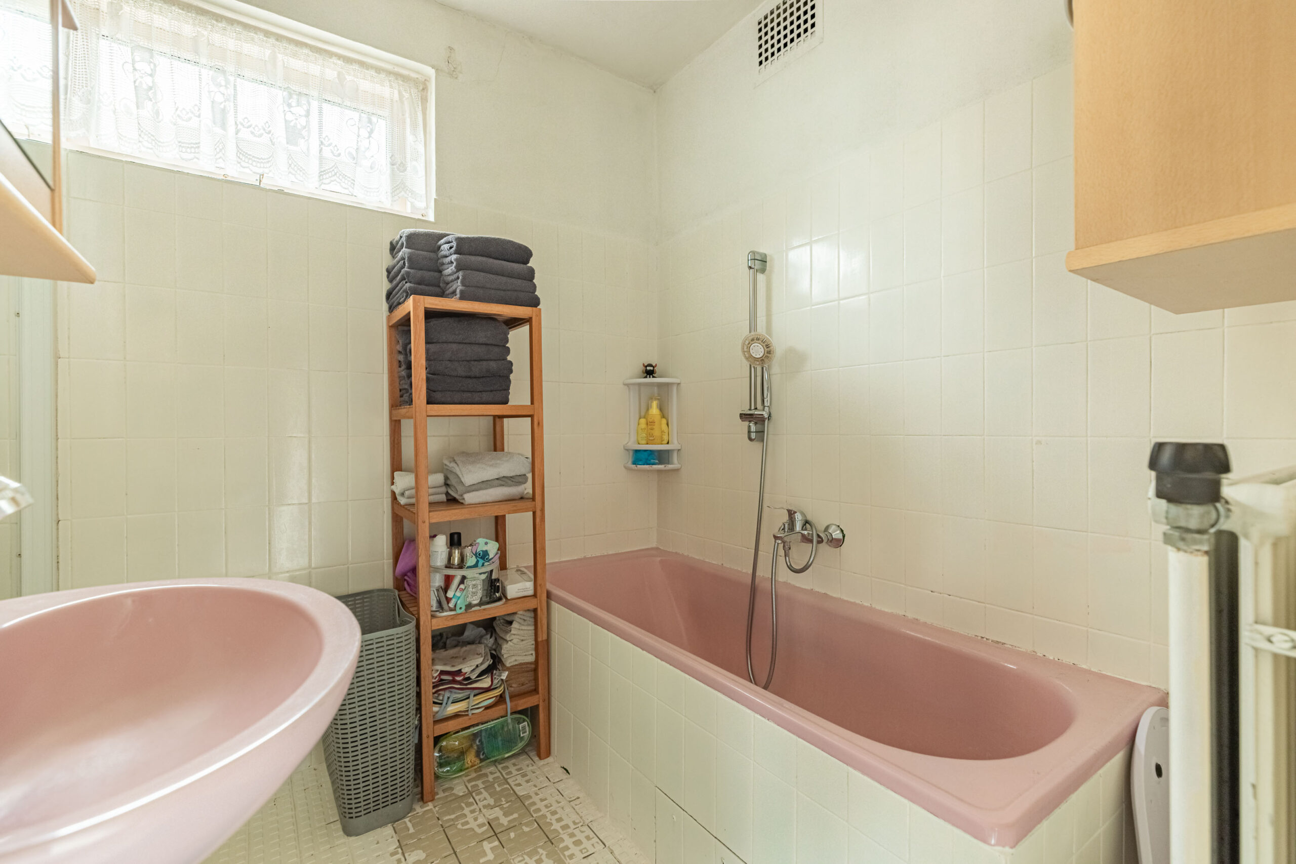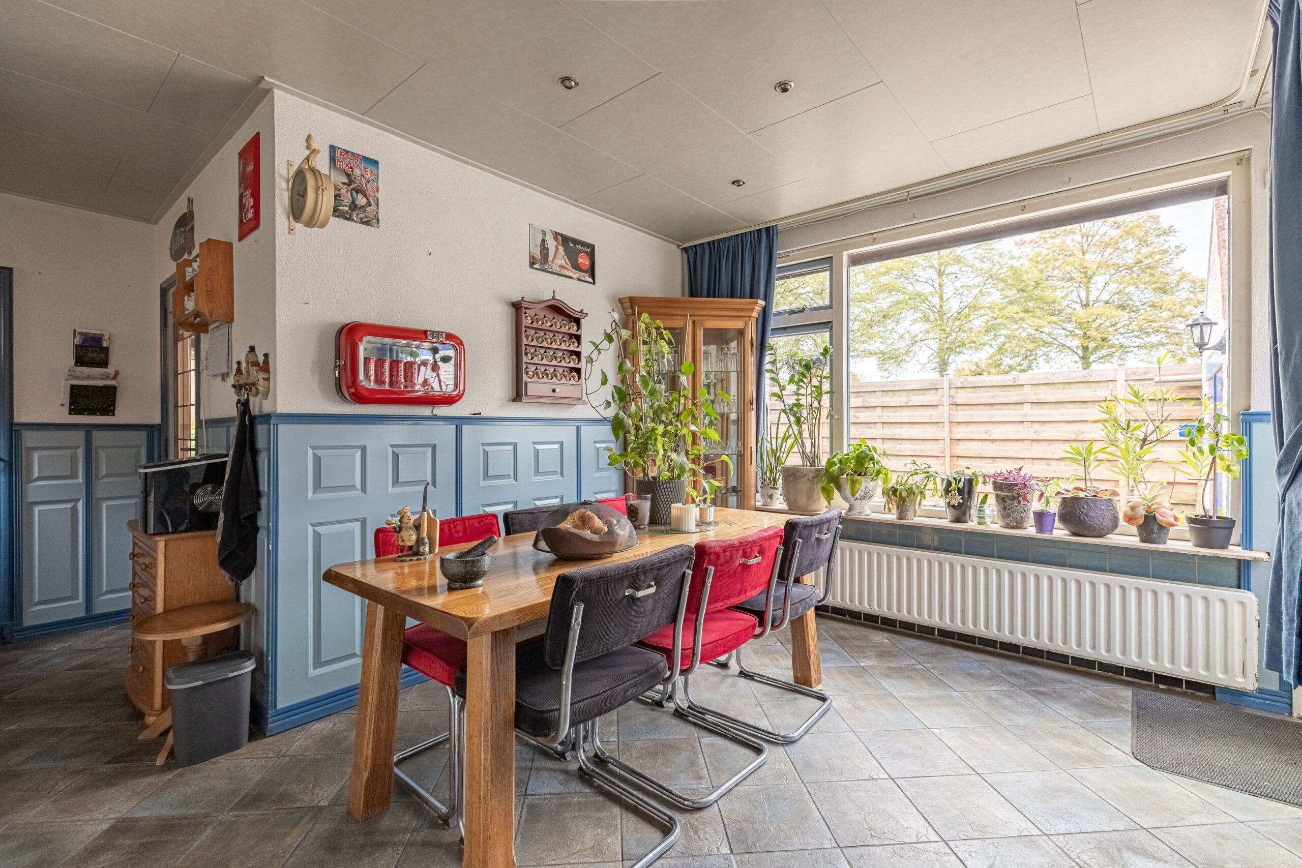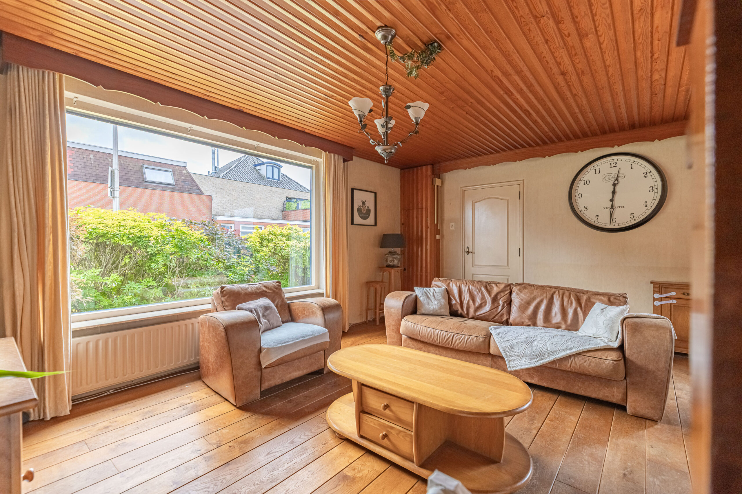 De woonkamer is in een L-opstelling en loopt over in de ruime woonkeuken. Hier ligt een tegelvloer en ook hier valt het licht mooi naar binnen door het grote raam. De keuken is een fijne plek om samen te koken of uitgebreid te tafelen met familie en vrienden. Er is bovendien een handige opbergkast aanwezig. Aansluitend aan de keuken ligt de bijkeuken met de aansluitingen voor wasmachine en droger en de opstelling van de cv-ketel. Vanuit hier bereik je ook het geheel betegelde toilet en de badkamer, voorzien van een bad, douche en wastafel met meubel.