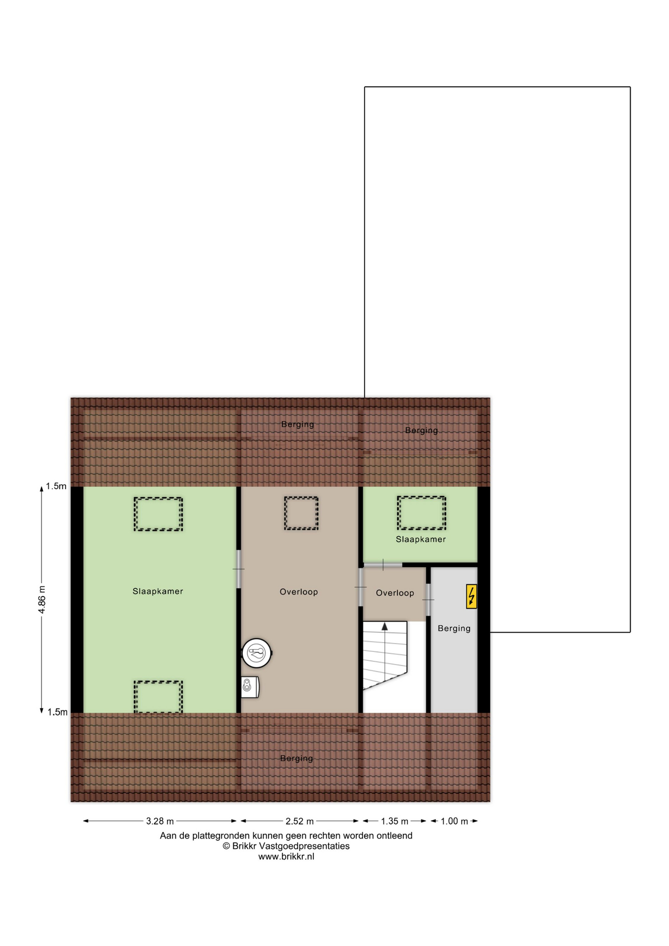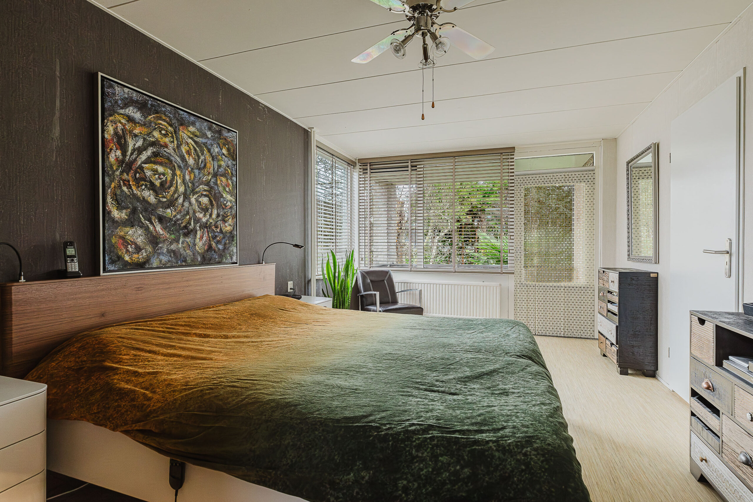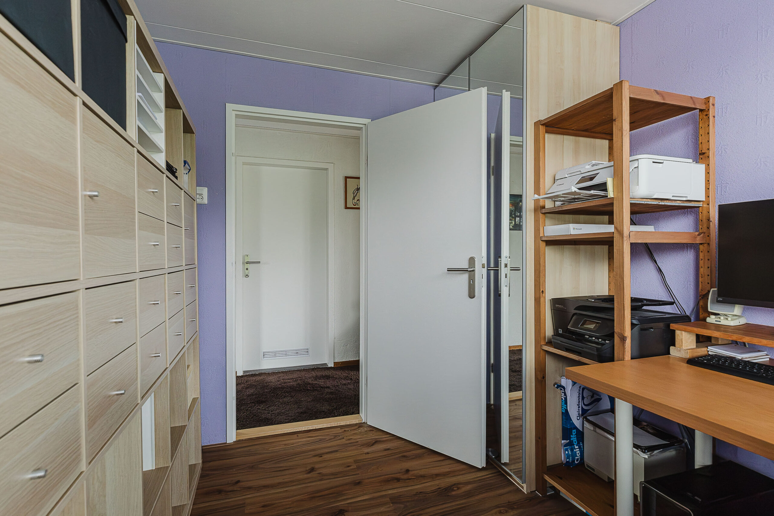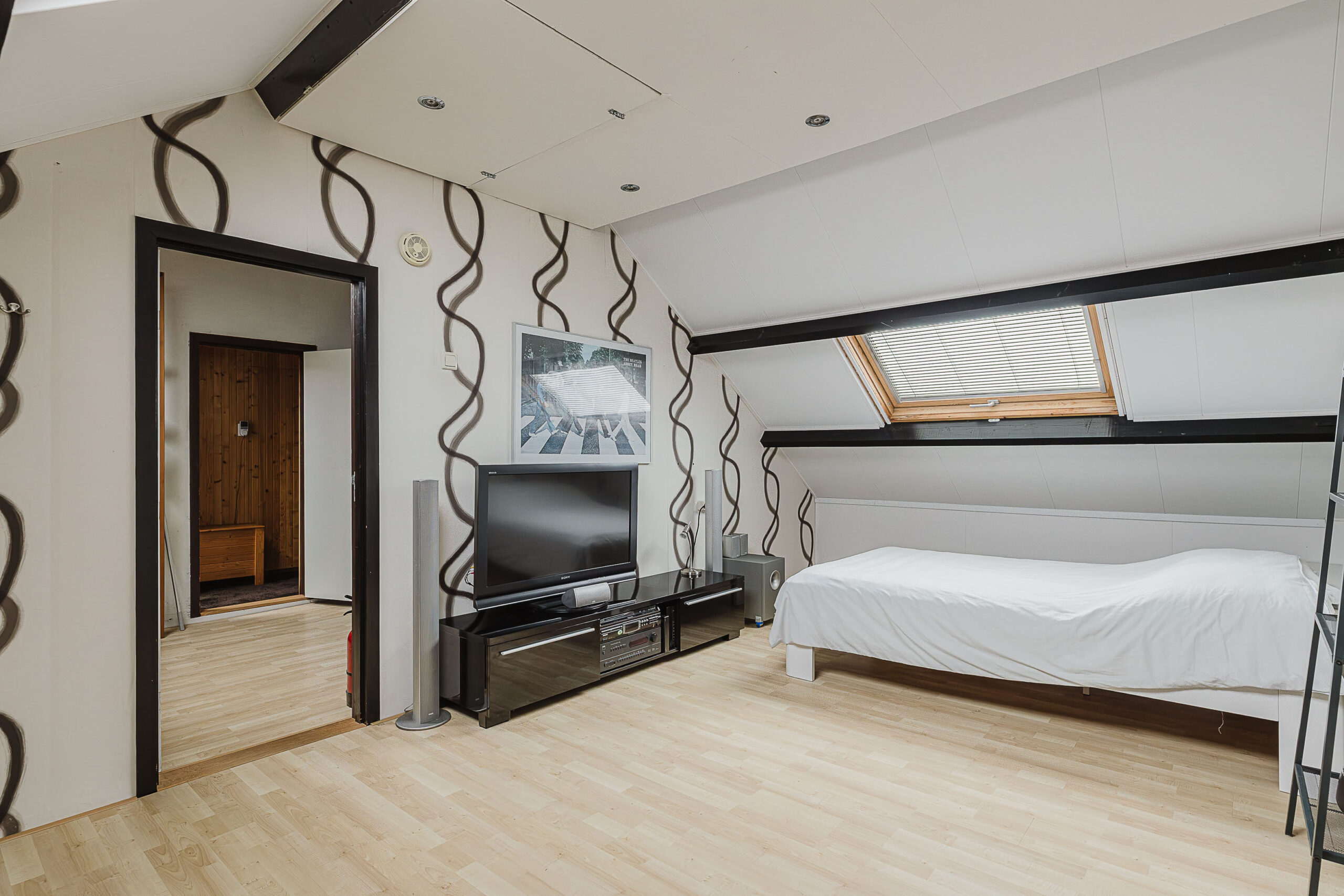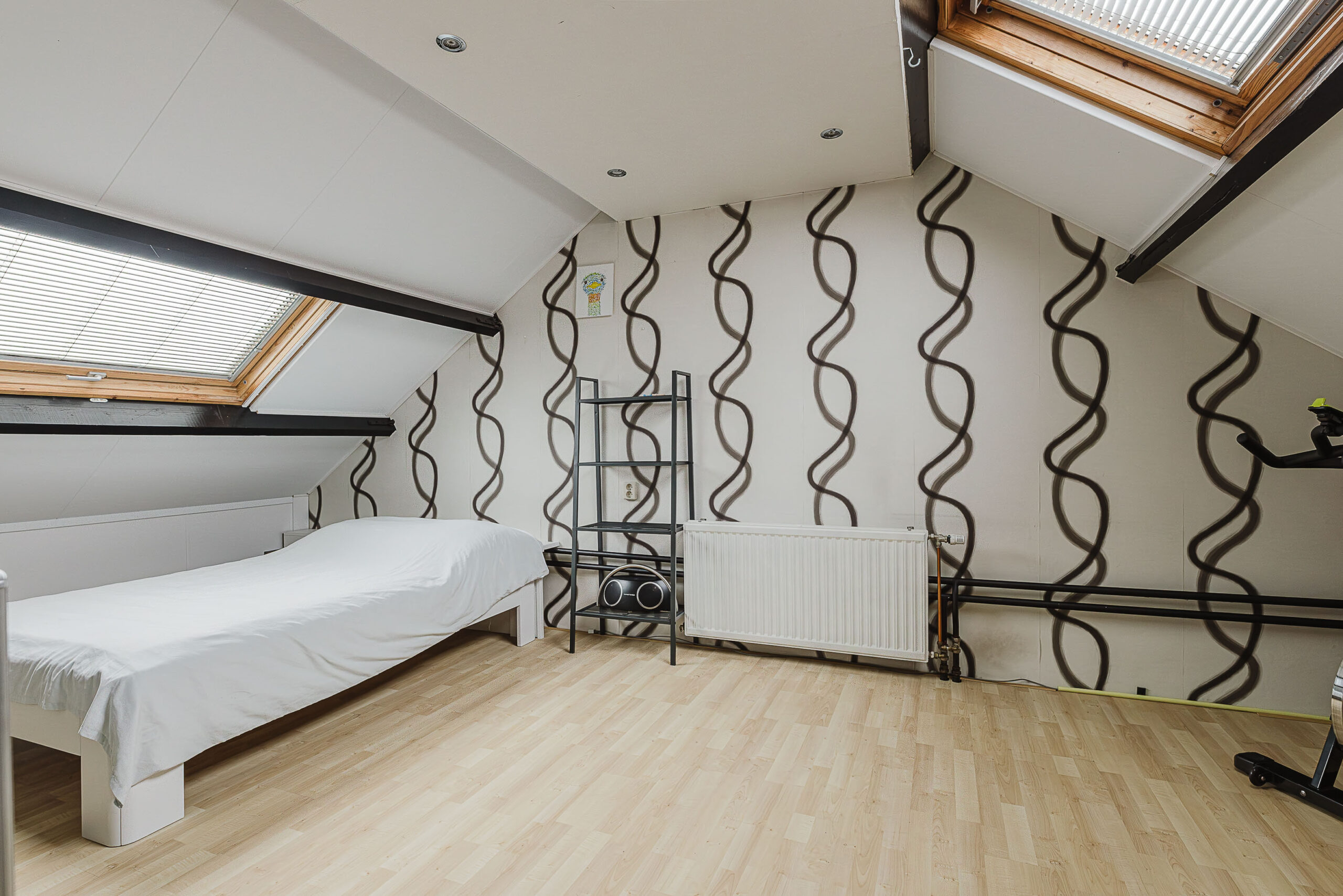 Via een vaste trap bereik je de tweede verdieping. Hier bevindt zich de vierde slaapkamer. Het is een praktische verdieping met verrassend veel bergruimte. Daarnaast is er een kleine kamer die gebruikt kan worden als kantoor of logeerkamer. De tussenzolder is geschikt te maken als hobbyruimte of extra kantoorruimte.