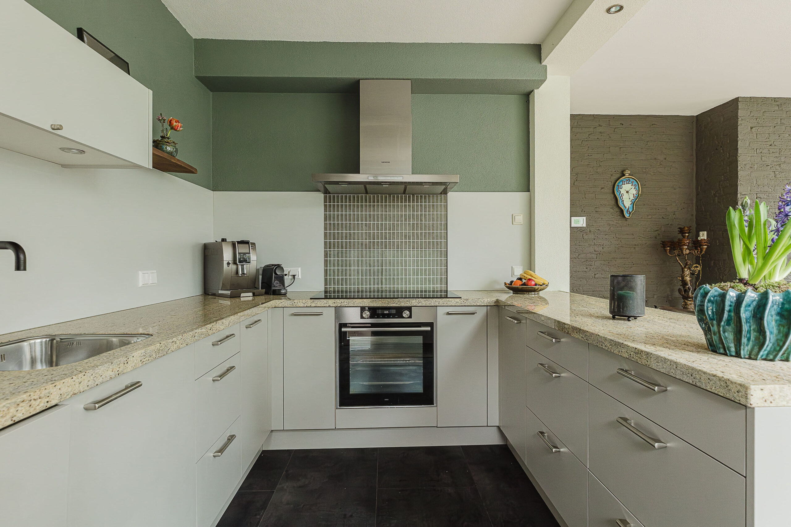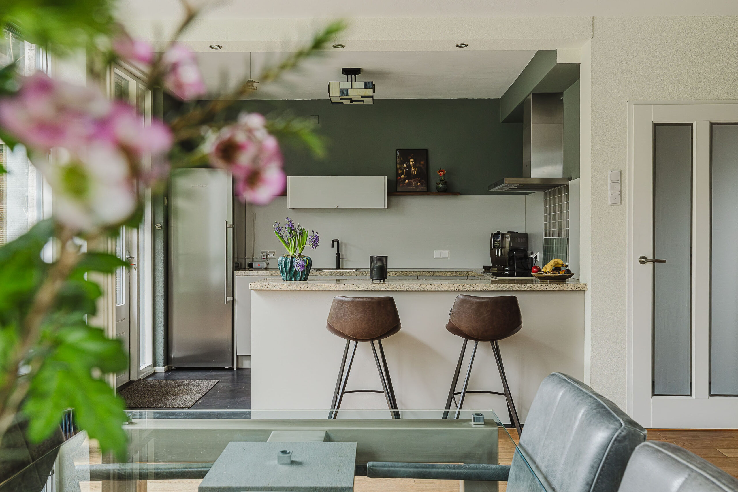 Dankzij de grote raampartijen is er volop lichtinval, wat zorgt voor een warme en uitnodigende leefruimte. De keuken is gemoderniseerd en praktisch ingericht, met alle benodigde inbouwapparatuur.