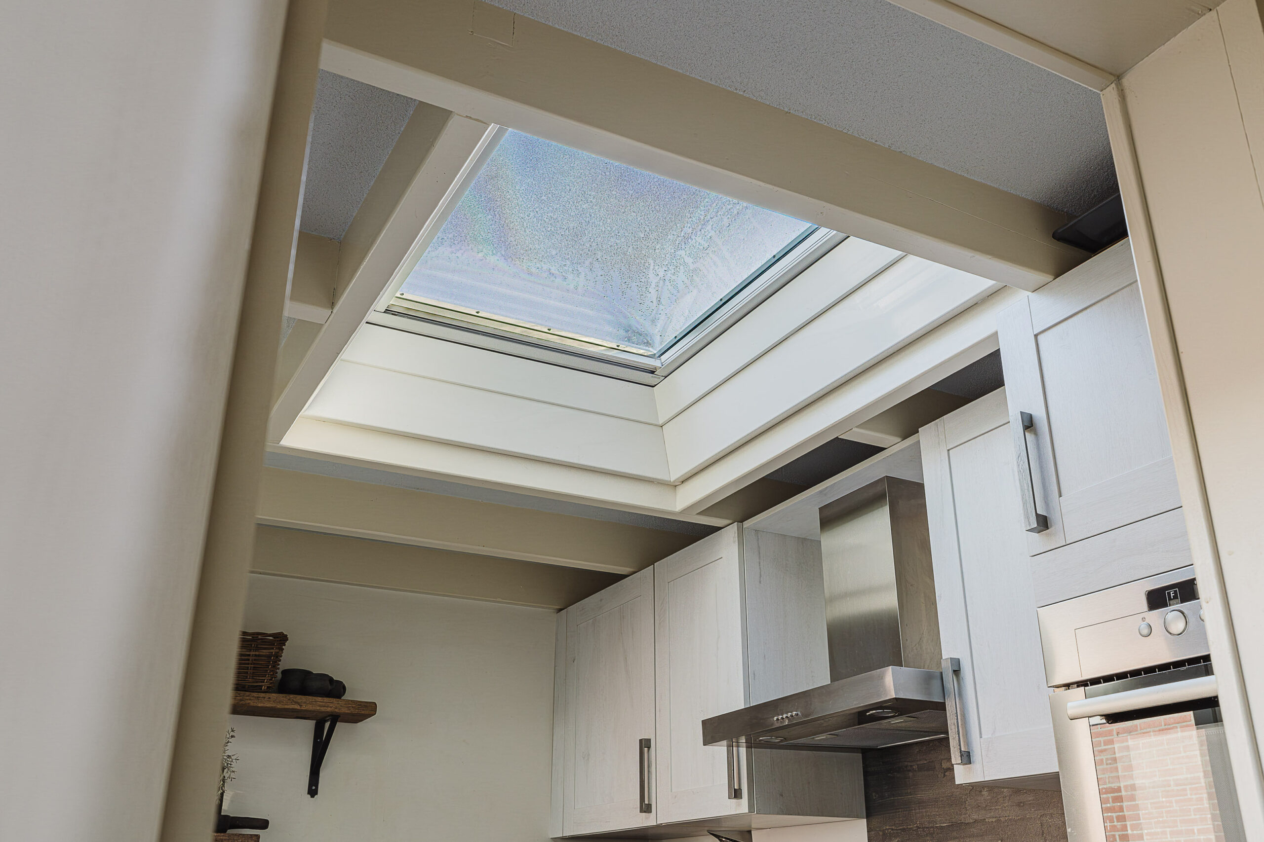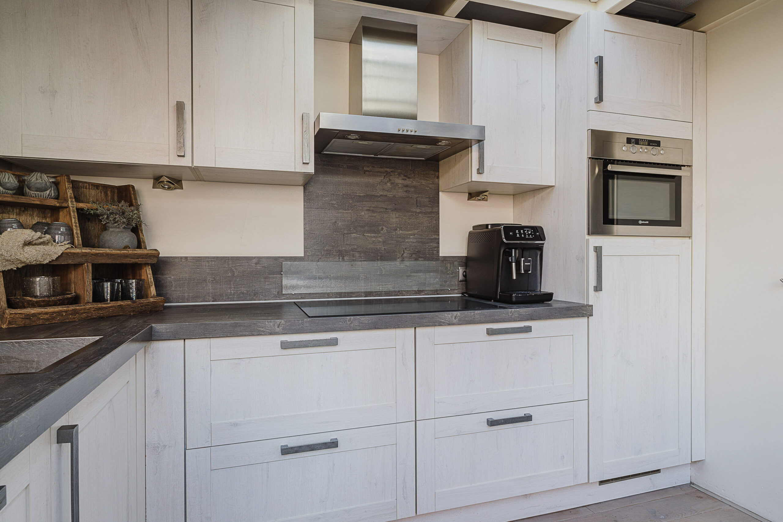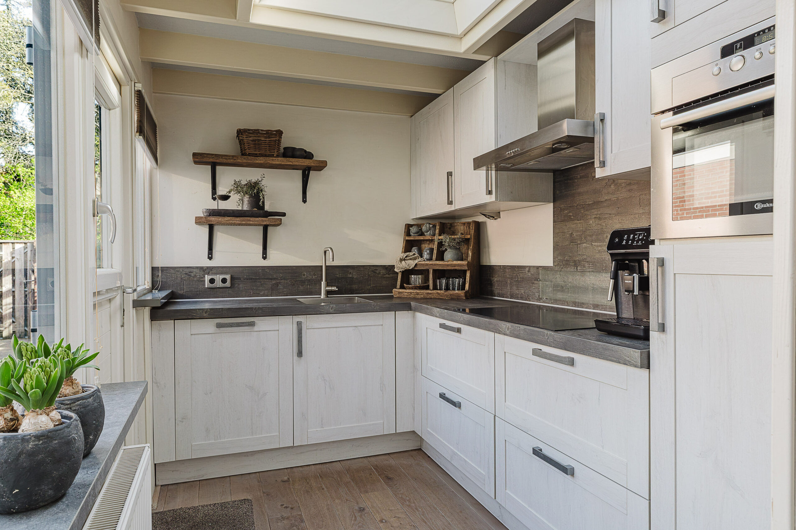 De aangebouwde keuken sluit mooi aan op de woonkamer en is voorzien van diverse inbouwapparatuur, zoals een inductiekookplaat, afzuigkap en oven/magnetron, vaatwasser en koel-/vrieskast. De keuken beschikt over voldoende opbergruimte.