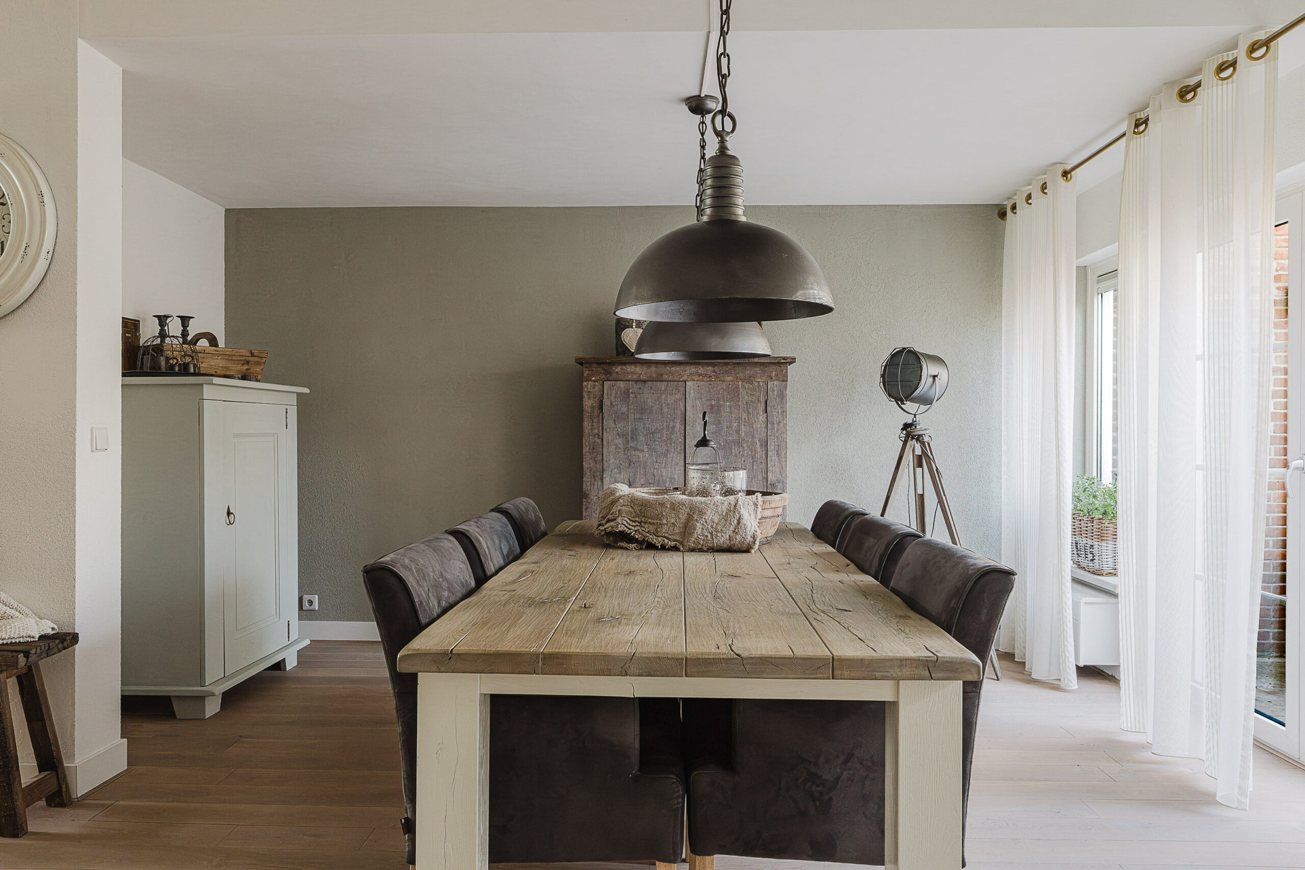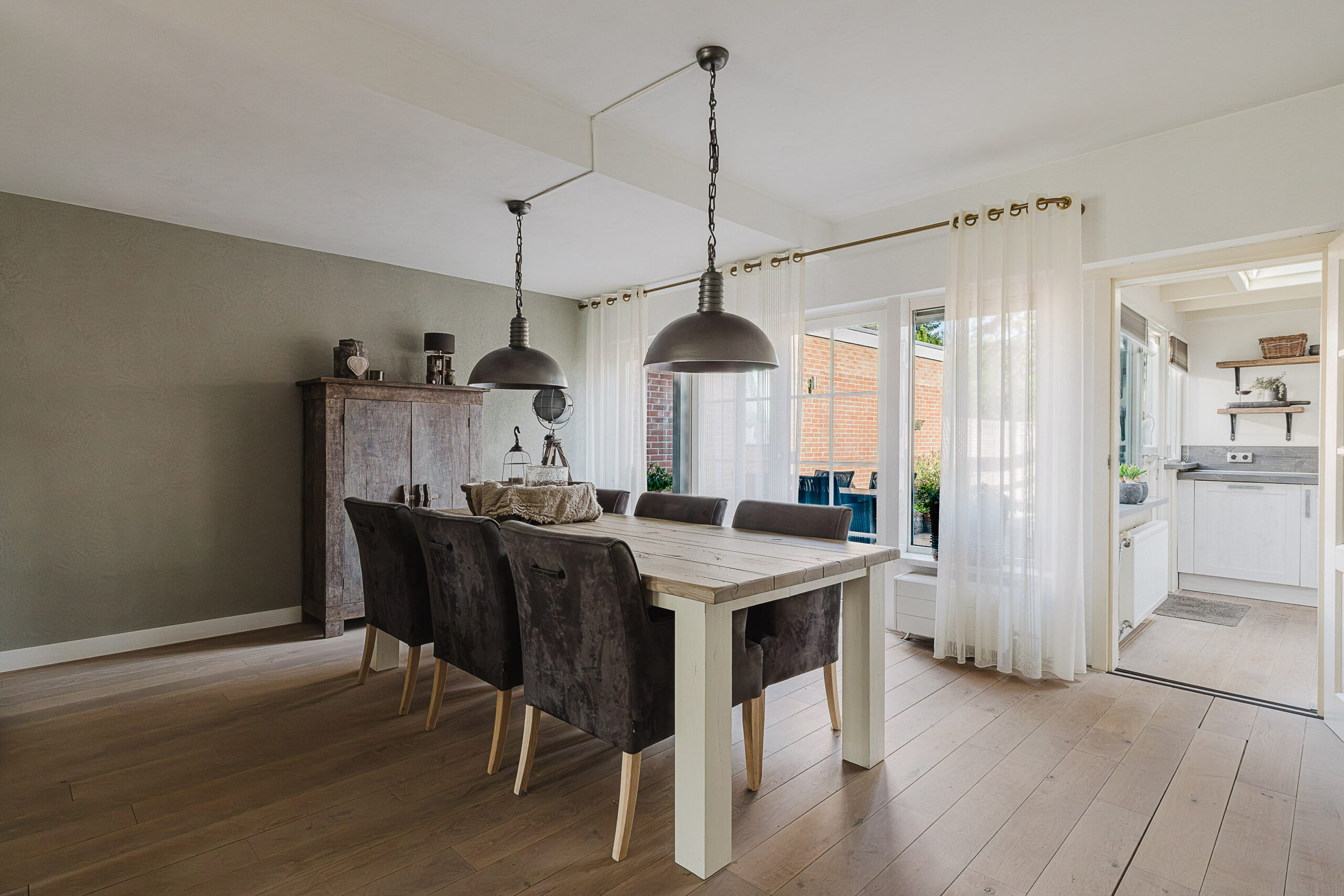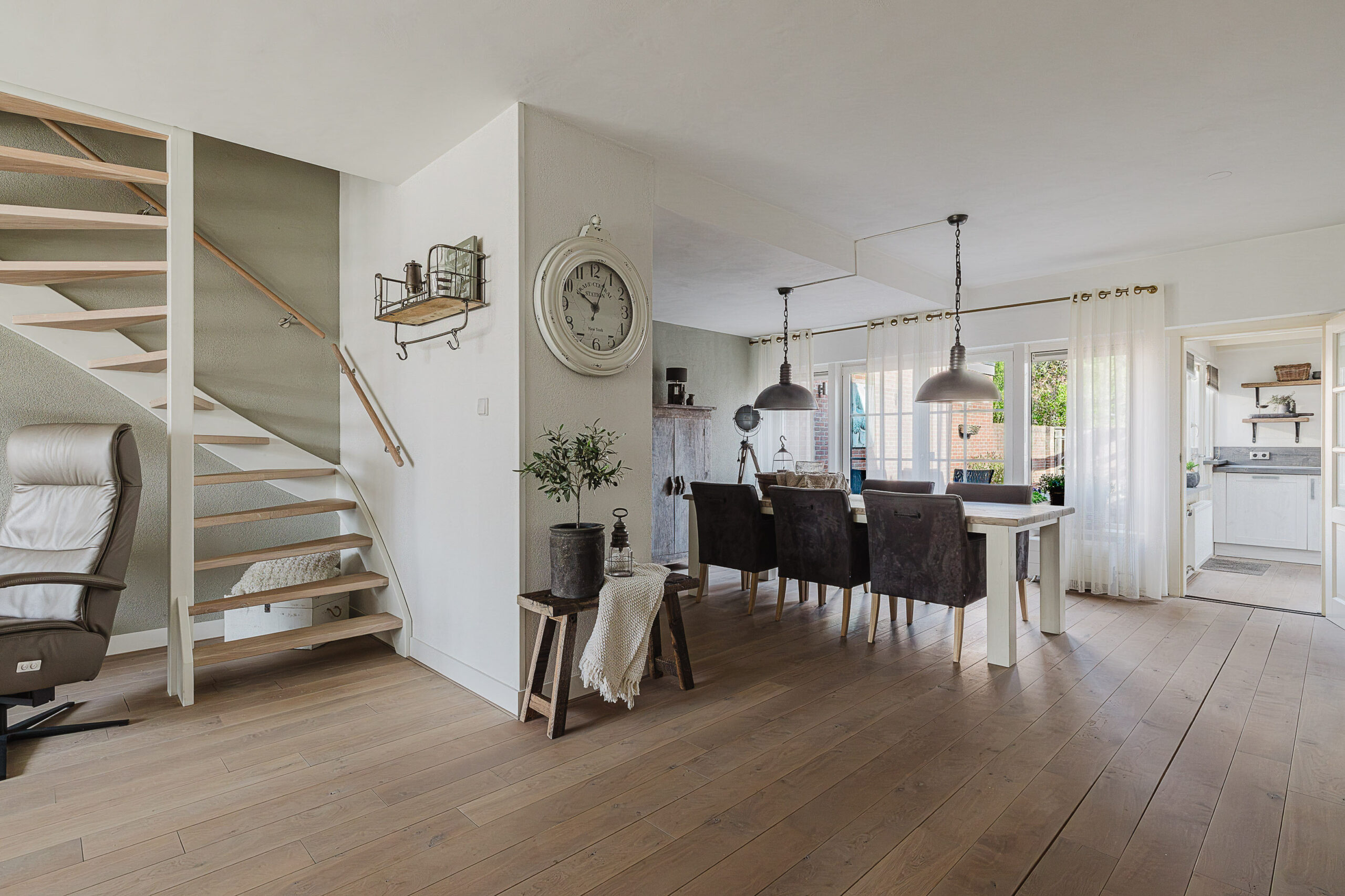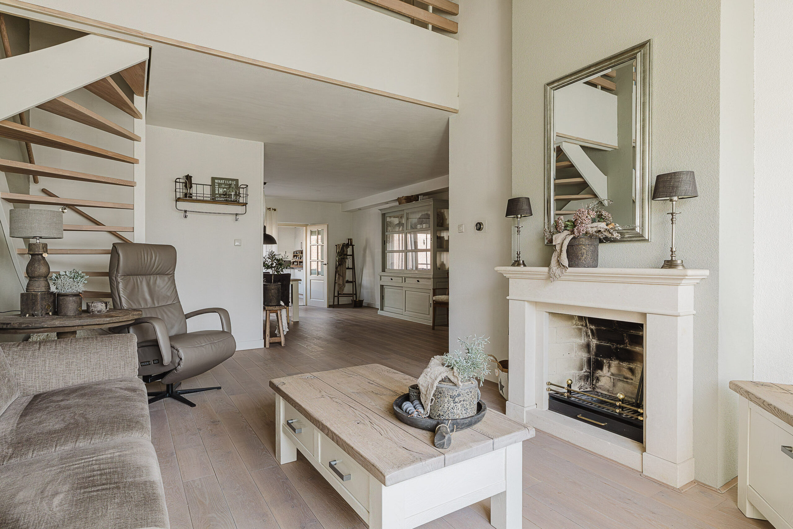 De woonkamer is een heerlijke ruime leefruimte met veel lichtinval en een moderne afwerking. De houtkachel zorgt voor extra sfeer en warmte, terwijl de tuindeuren een directe verbinding met de tuin creëren.