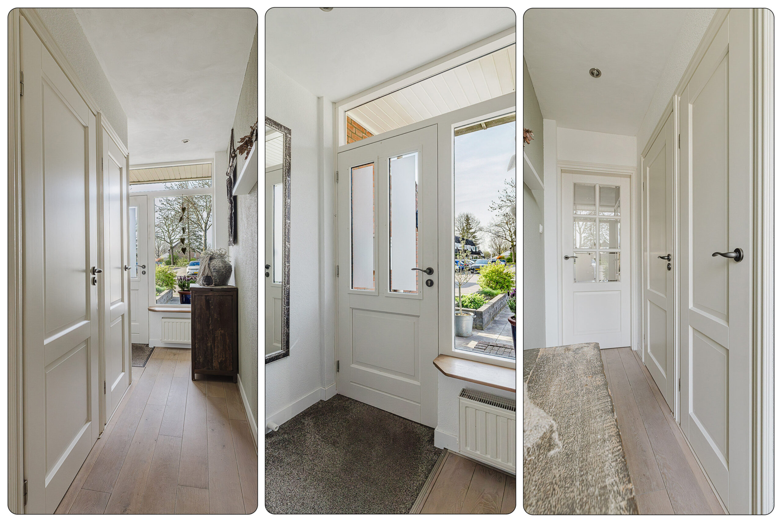 Je parkeert je auto eenvoudig aan de straat en loopt via de voortuin naar de voordeur. In de hal bevinden zich de toiletruimte, een praktische garderobe en de meterkast (8 groepen en 2 aardlekschakelaars).