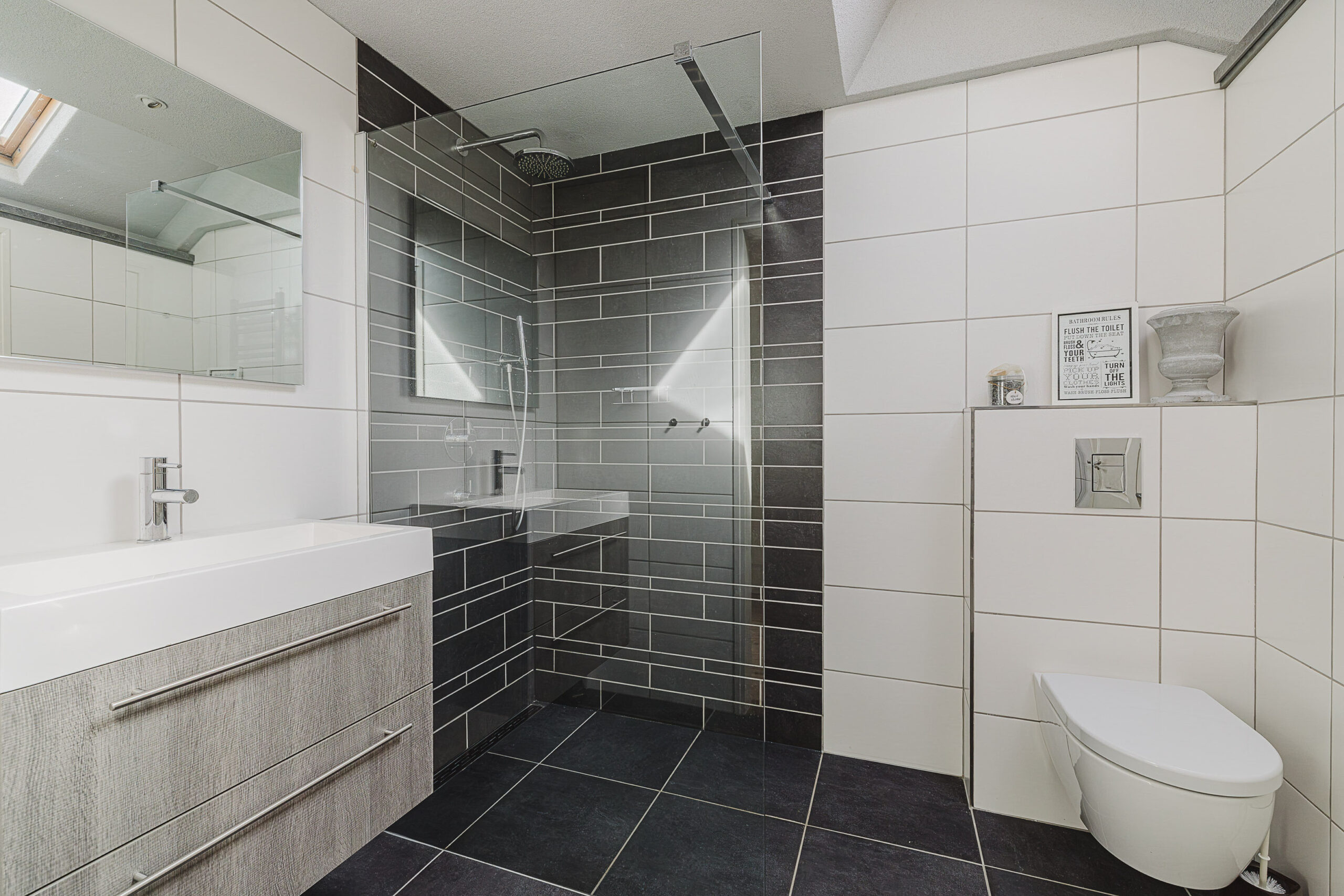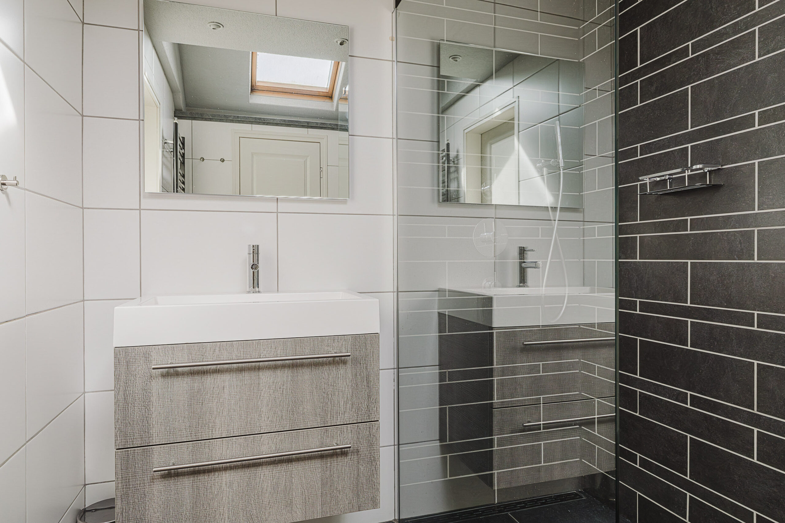 De badkamer is voorzien van een inloopdouche, wastafel en toilet. In de separate ruimte bevinden zich de cv-opstelling en aansluitingen voor wasmachine en droger.