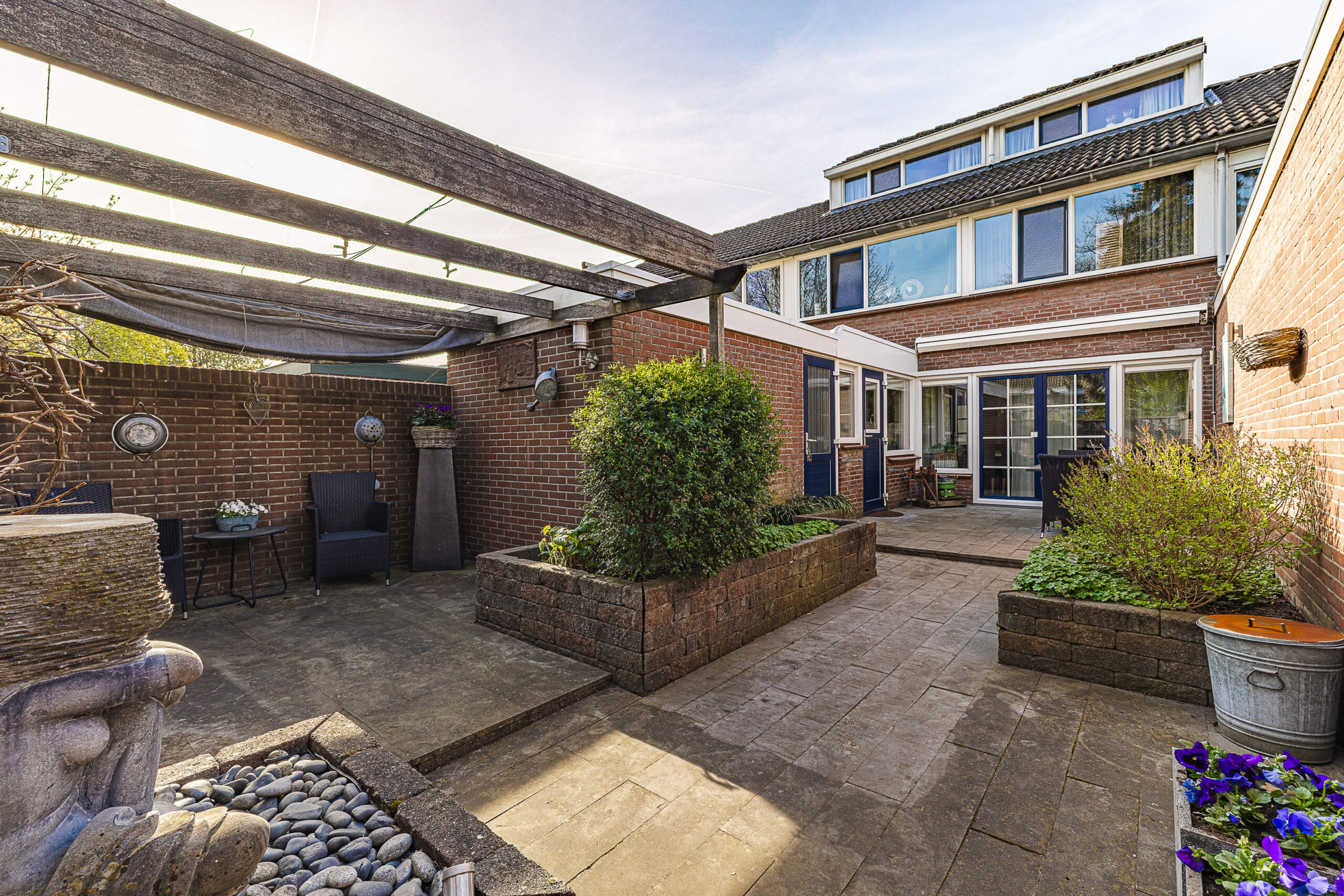De achtertuin biedt een prettige combinatie van zon en schaduw. Dankzij de vrije ligging aan de achterzijde geniet je hier van veel privacy. De tuin is voorzien van een terras en gazon en beschikt over een berging voor extra opslagruimte.