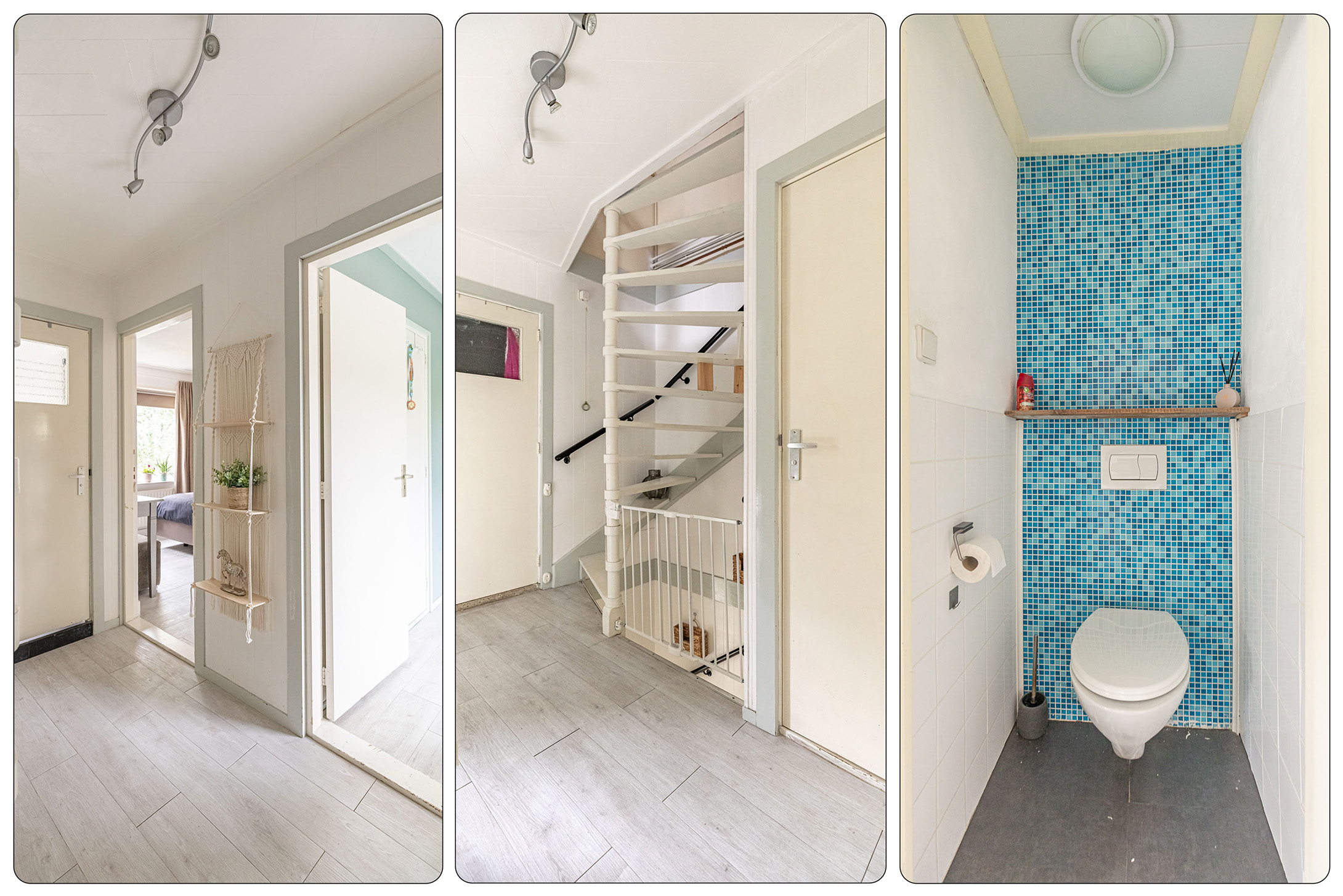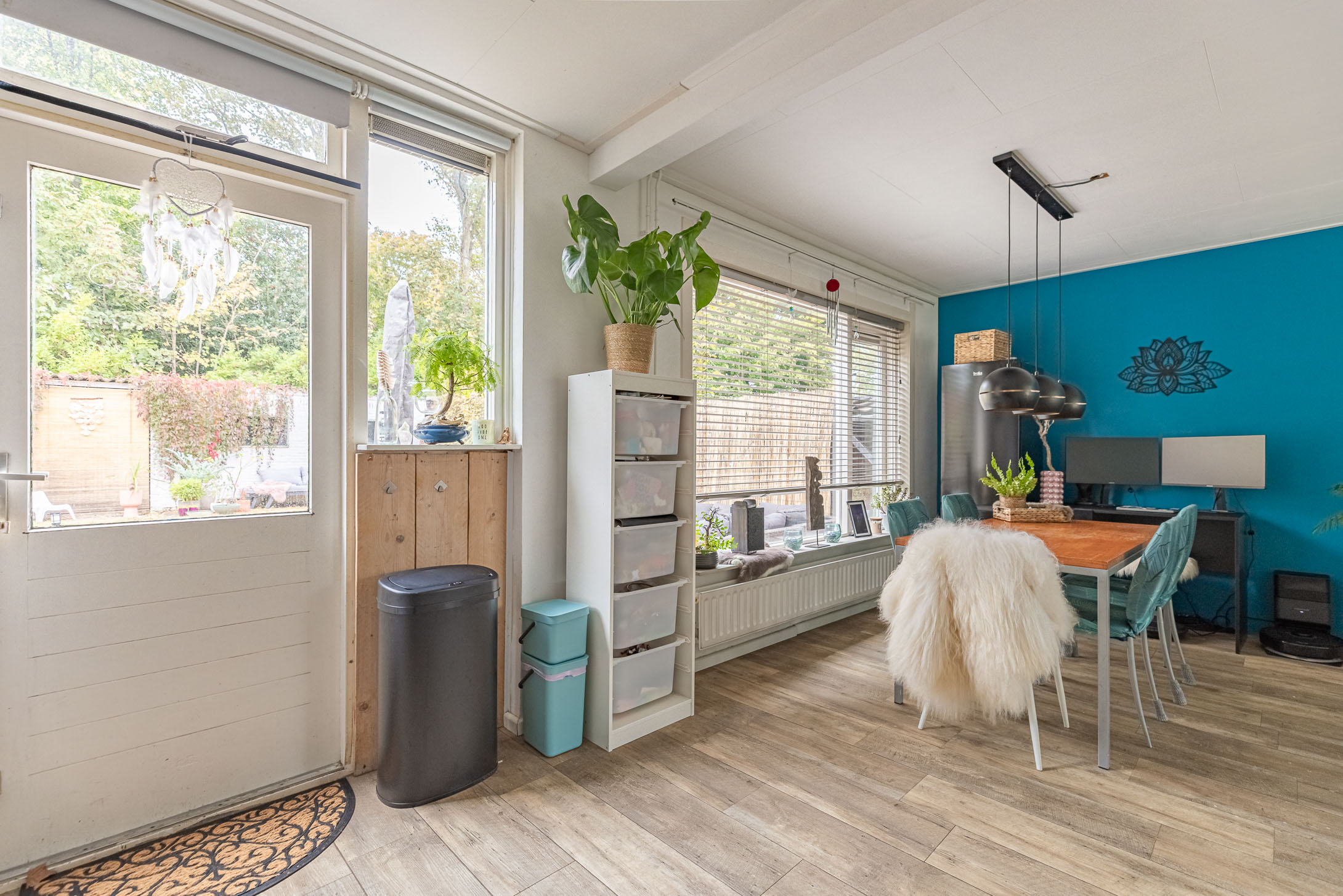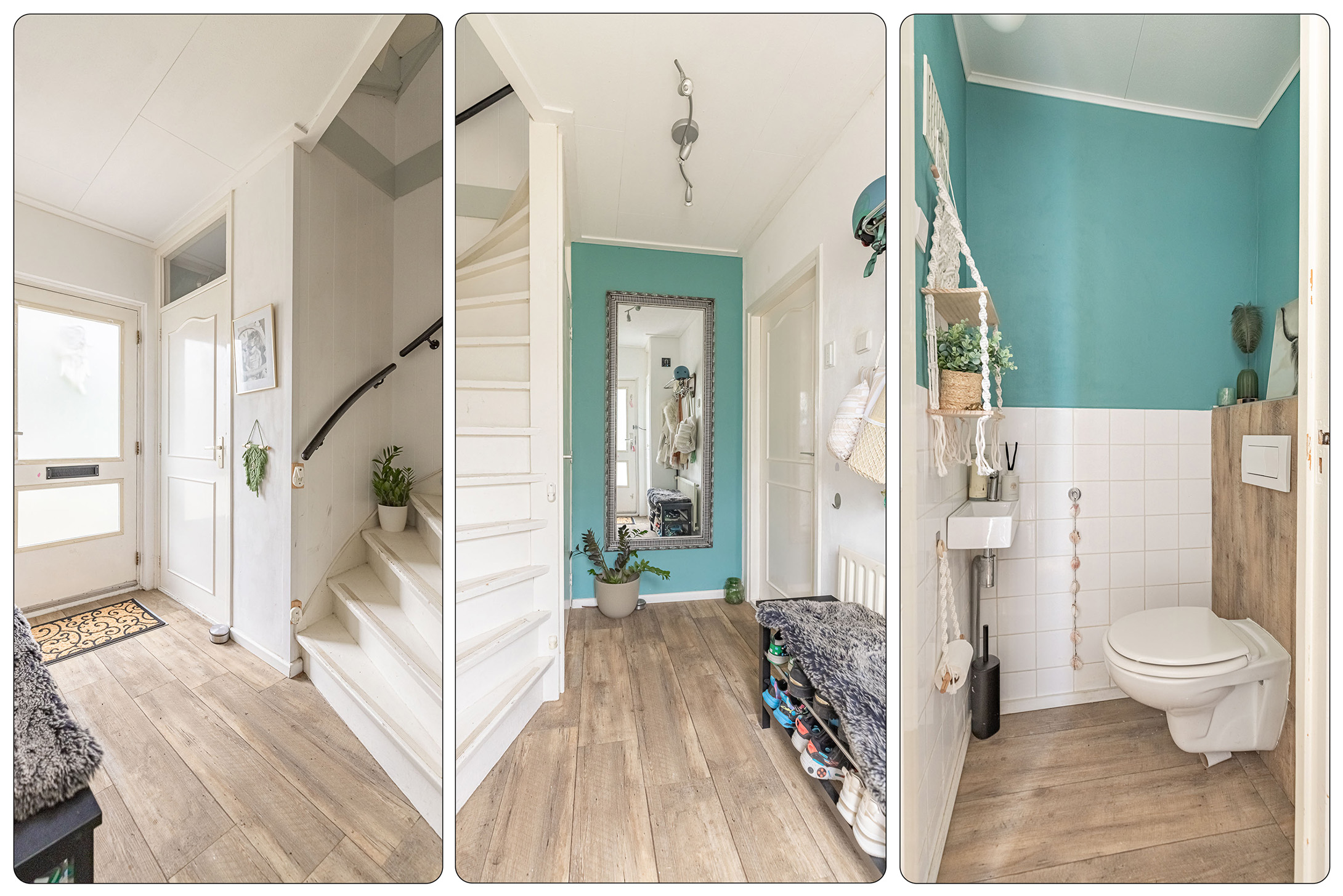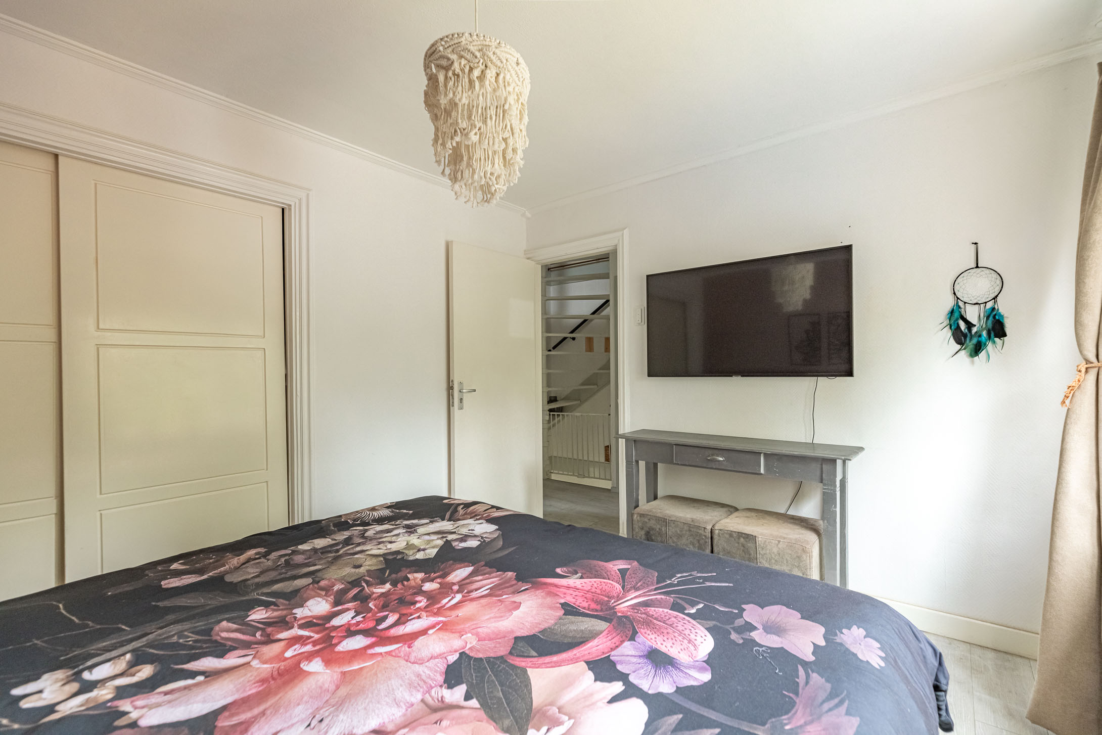 Parkeer je auto gemakkelijk in de straat – er is altijd een plekje – en stap via de voordeur de woning binnen. In de sfeervolle hal vind je het toilet met fonteintje en de trapopgang naar boven. De lichte laminaatvloer loopt door naar de woonkamer, wat zorgt voor een frisse en moderne uitstraling.