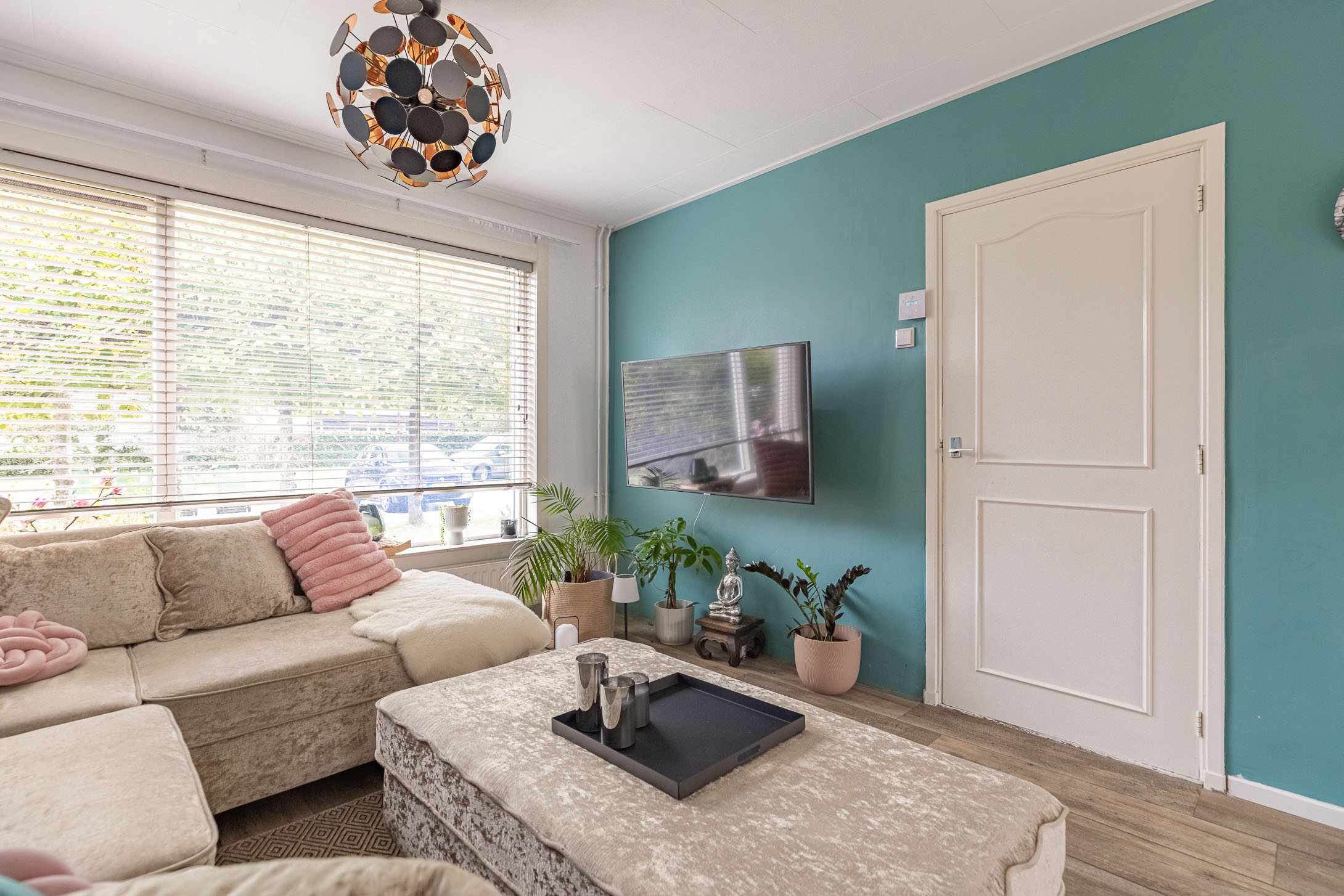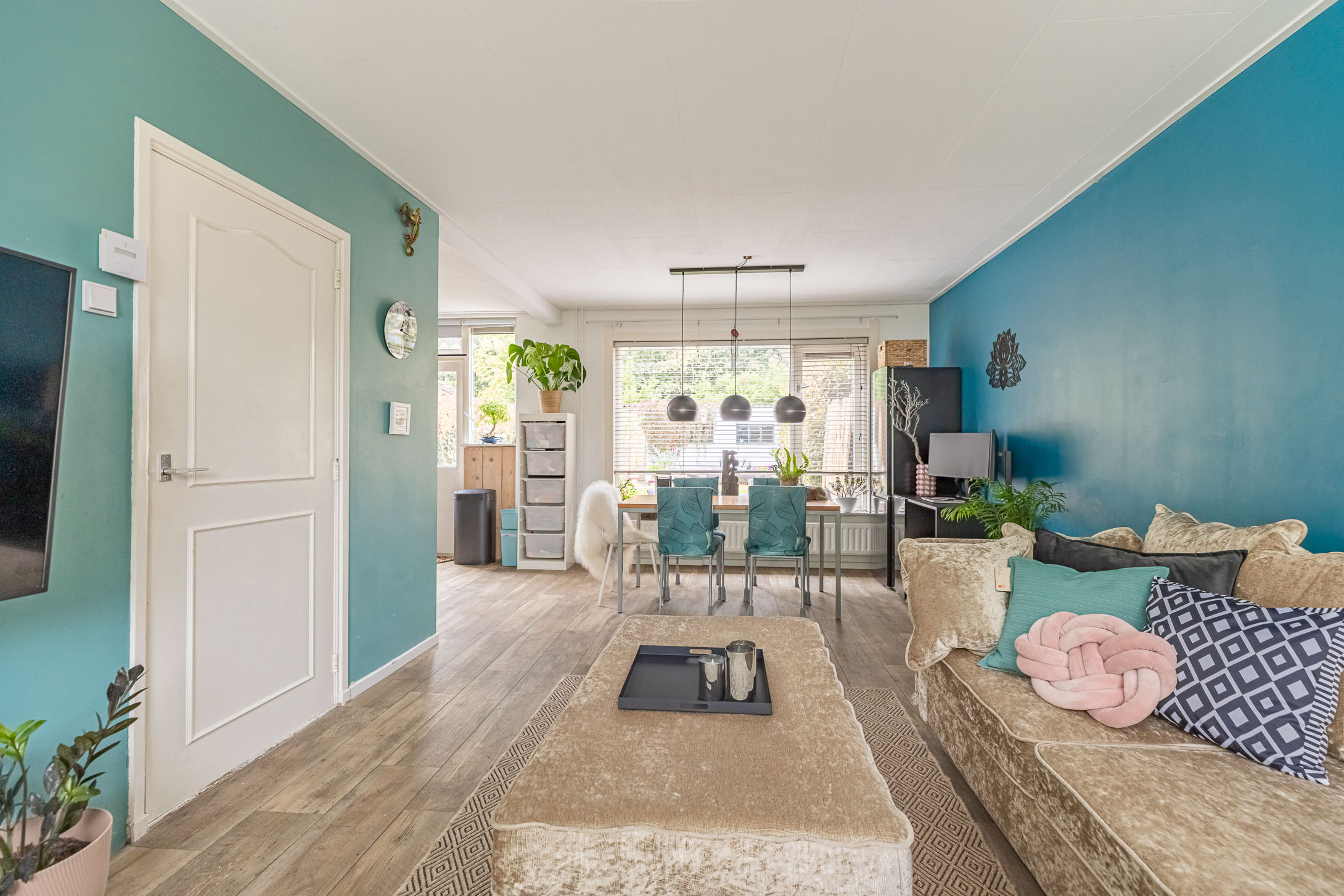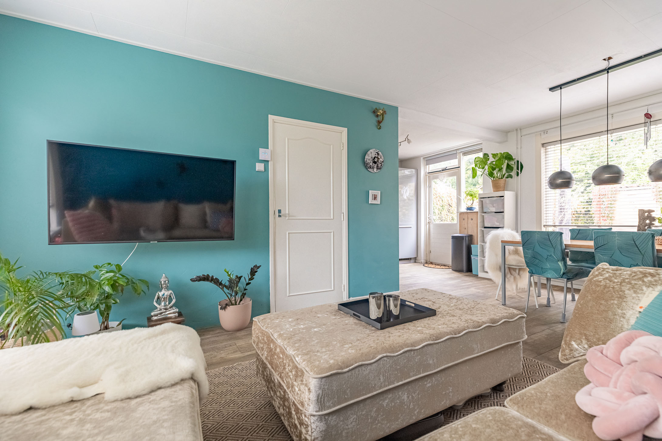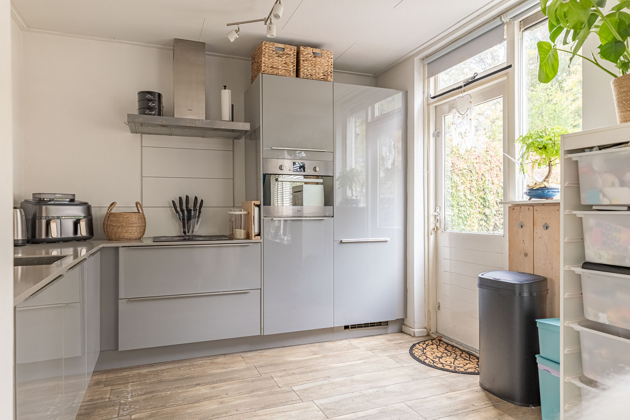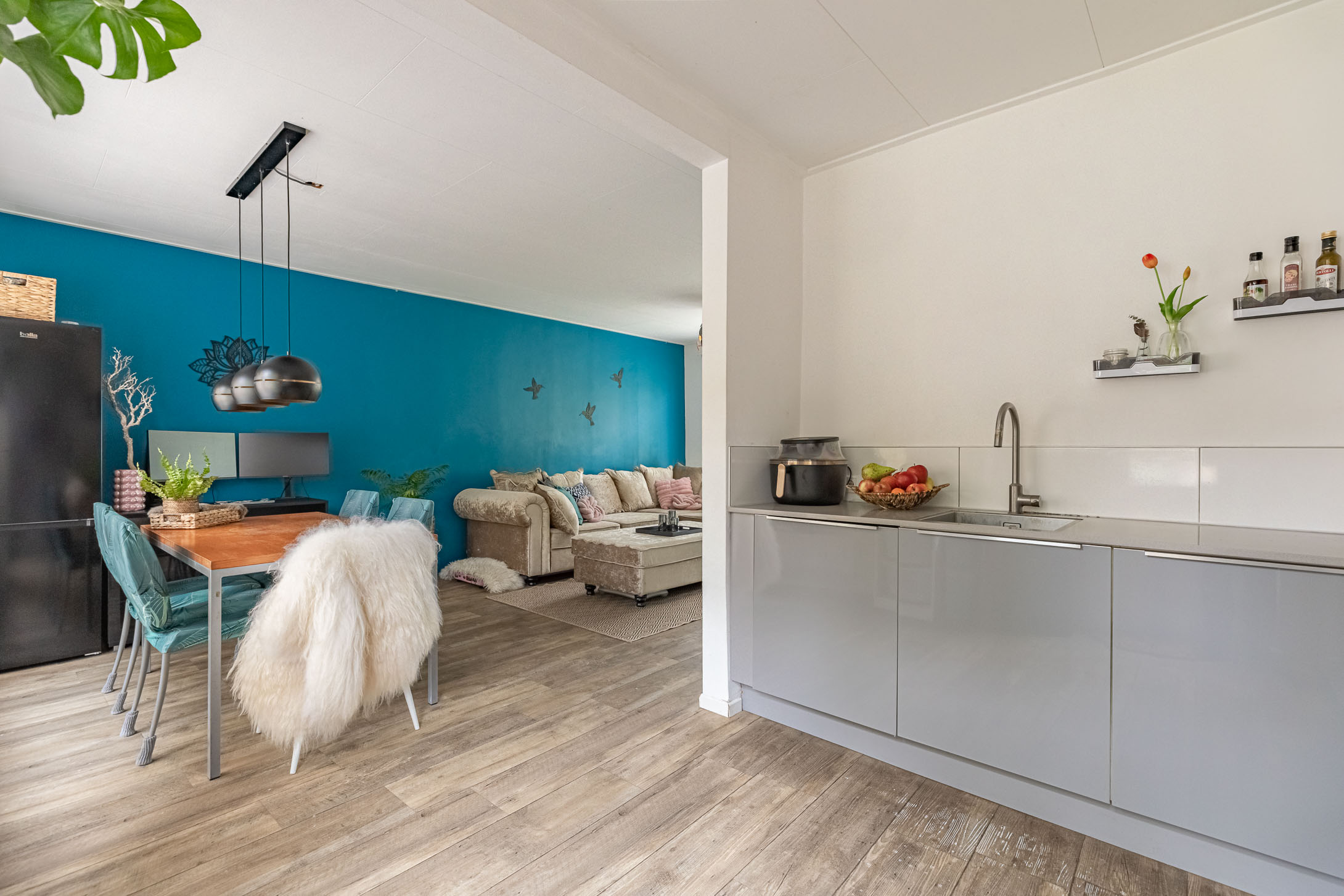 Parkeer je auto gemakkelijk in de straat – er is altijd een plekje – en stap via de voordeur de woning binnen. In de sfeervolle hal vind je het toilet met fonteintje en de trapopgang naar boven. De lichte laminaatvloer loopt door naar de woonkamer, wat zorgt voor een frisse en moderne uitstraling.