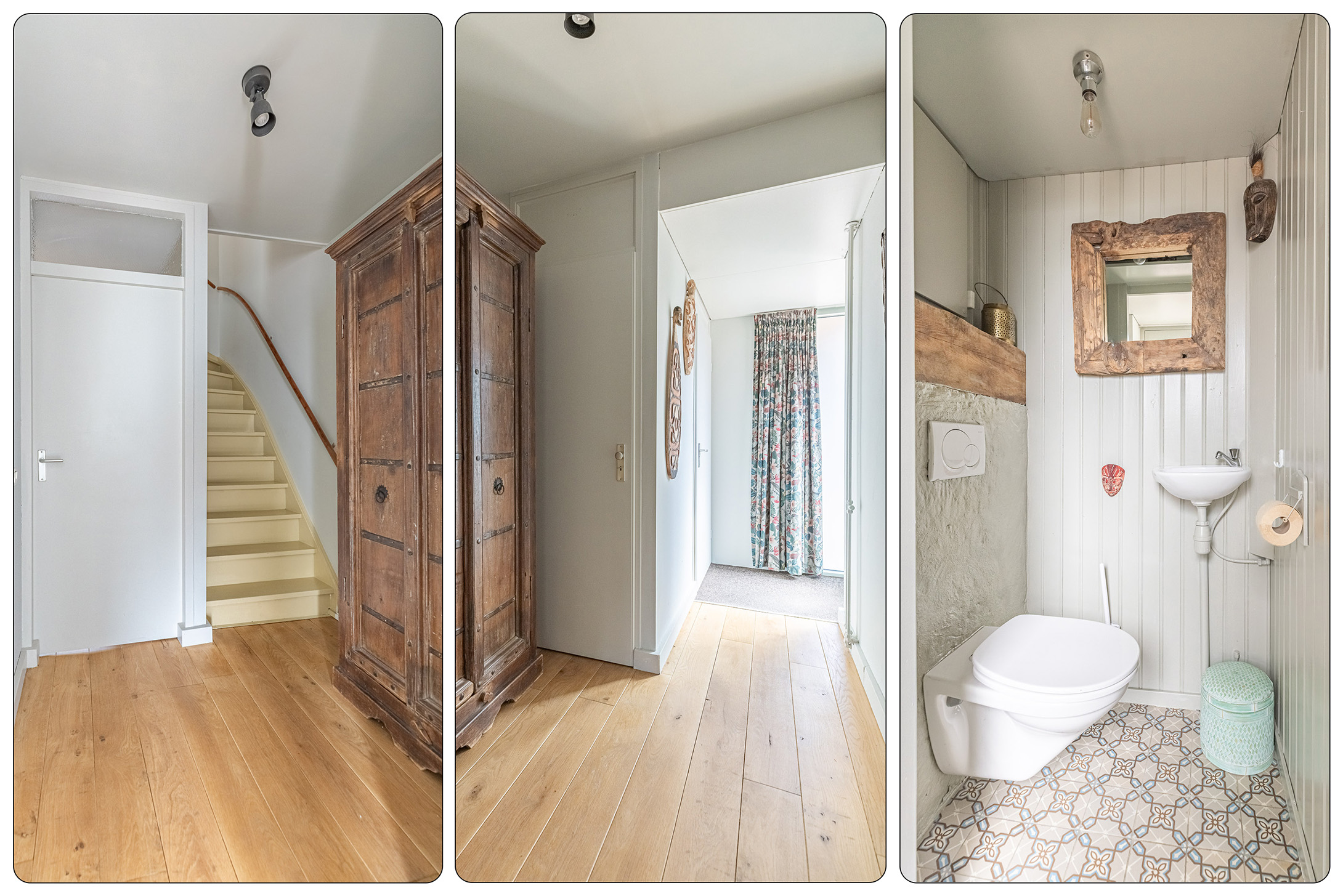 Via de nette voortuin met carport kom je binnen in de hal. Hier vind je het toilet, de trap naar boven en toegang tot de lichte, gezellige woonkamer. In de hal ligt een mooie massief Frans eiken vloer en de wanden zijn strak gestuct. Dat geldt trouwens voor de hele begane grond.