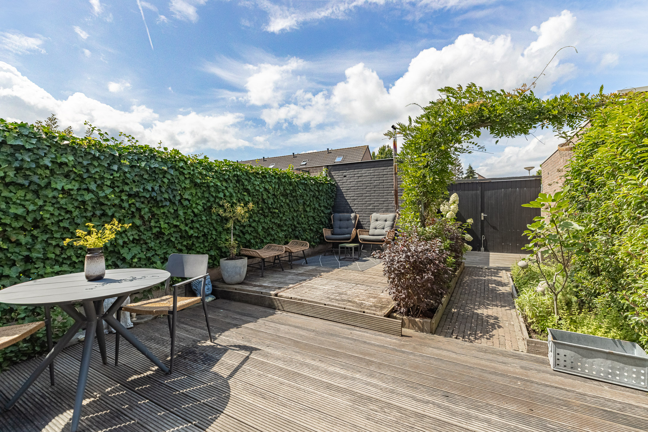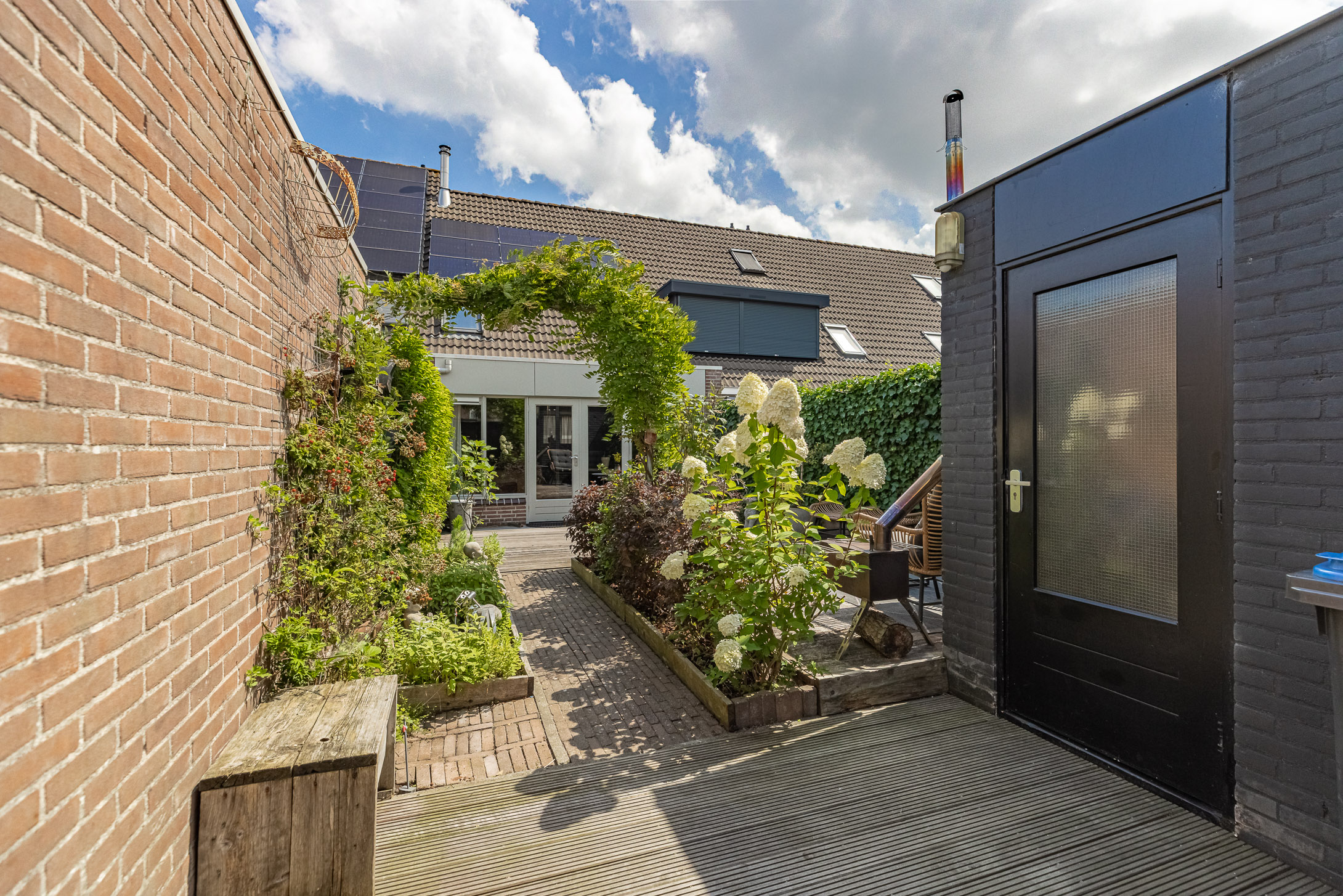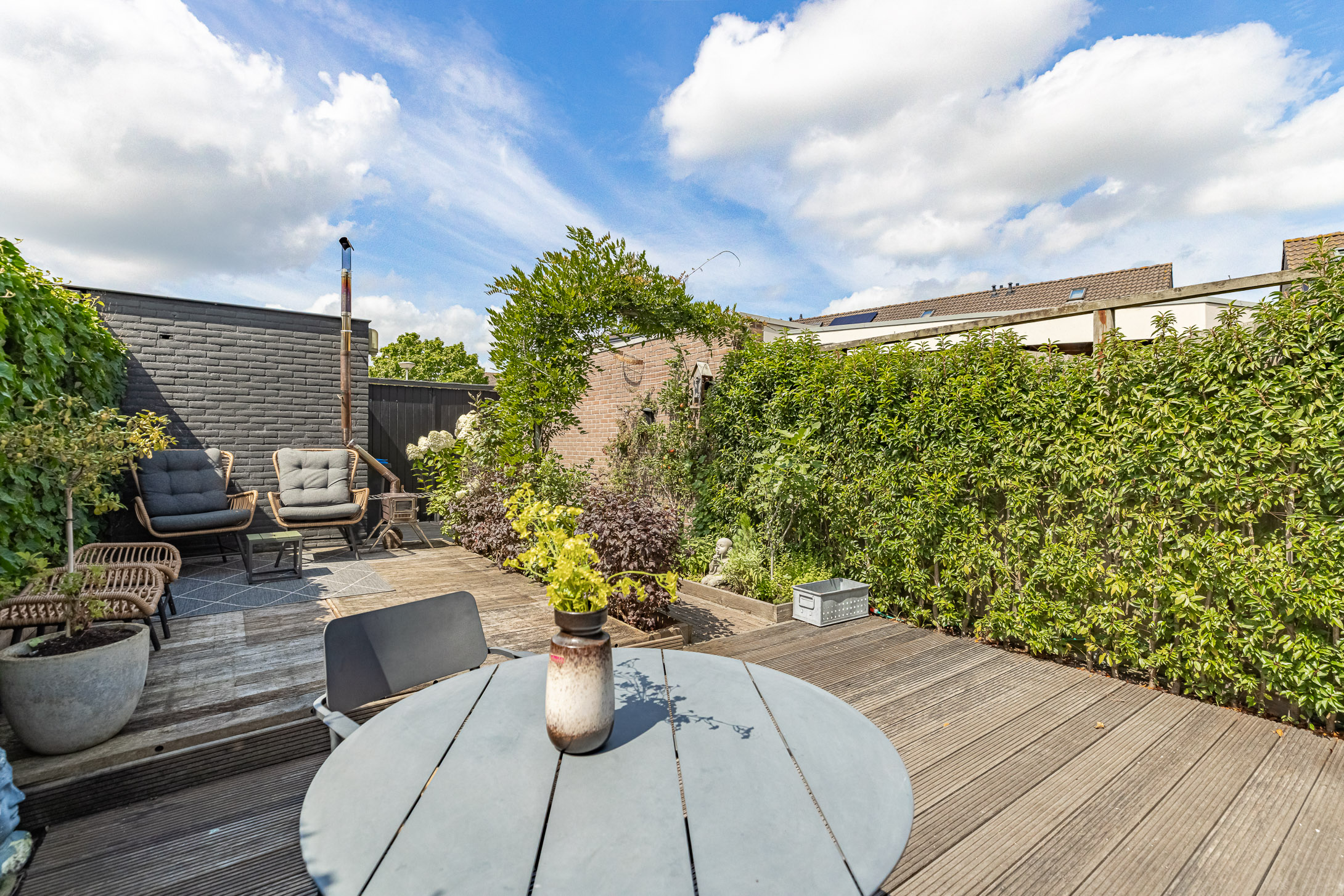 De achtertuin is een fijne plek om te relaxen of met vrienden te borrelen. Er liggen hardhouten vlonders, een verhoogd terras van steenschotten, en je hebt een vrijstaande stenen berging én een achterom. Super praktisch voor je fiets of tuinspullen.