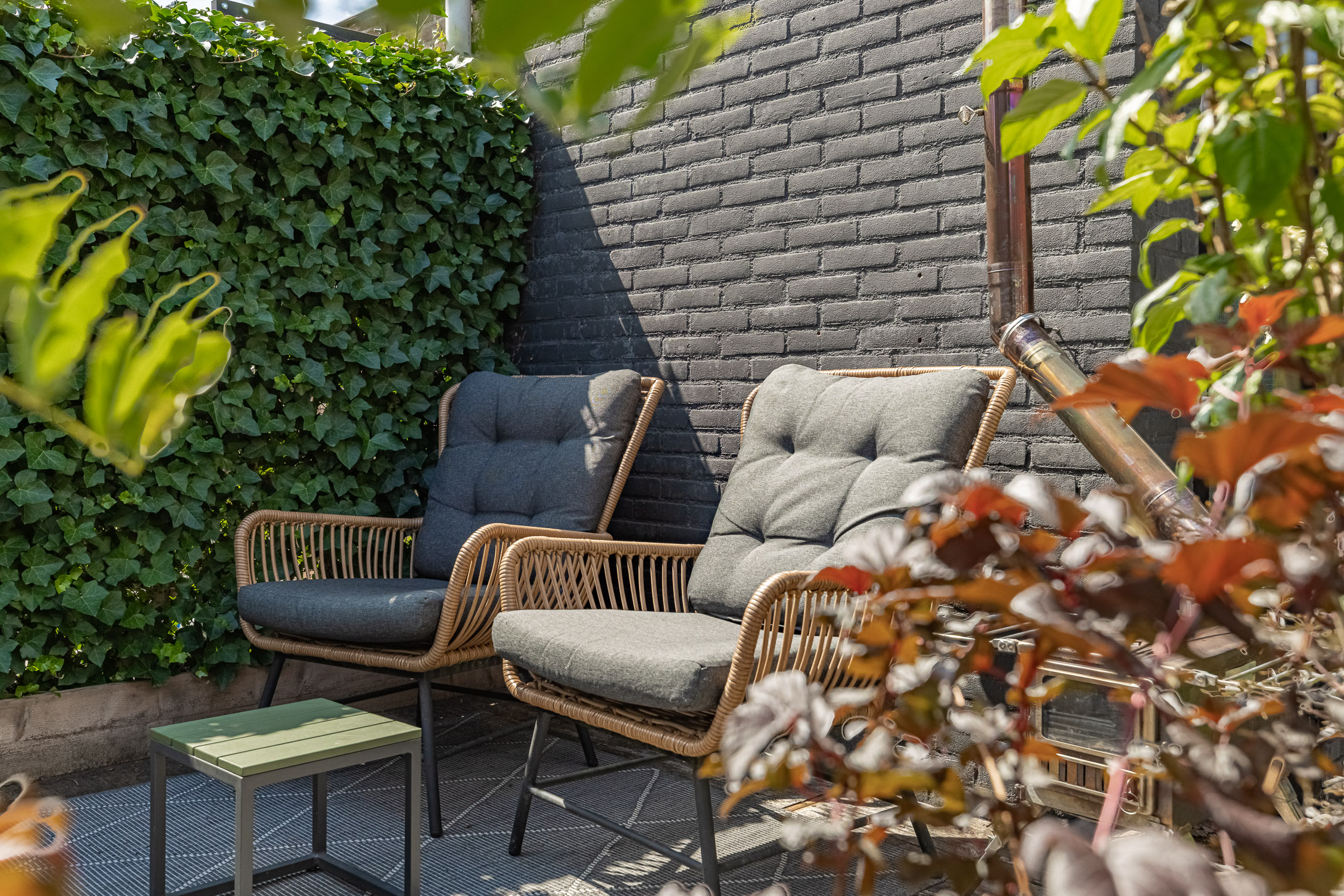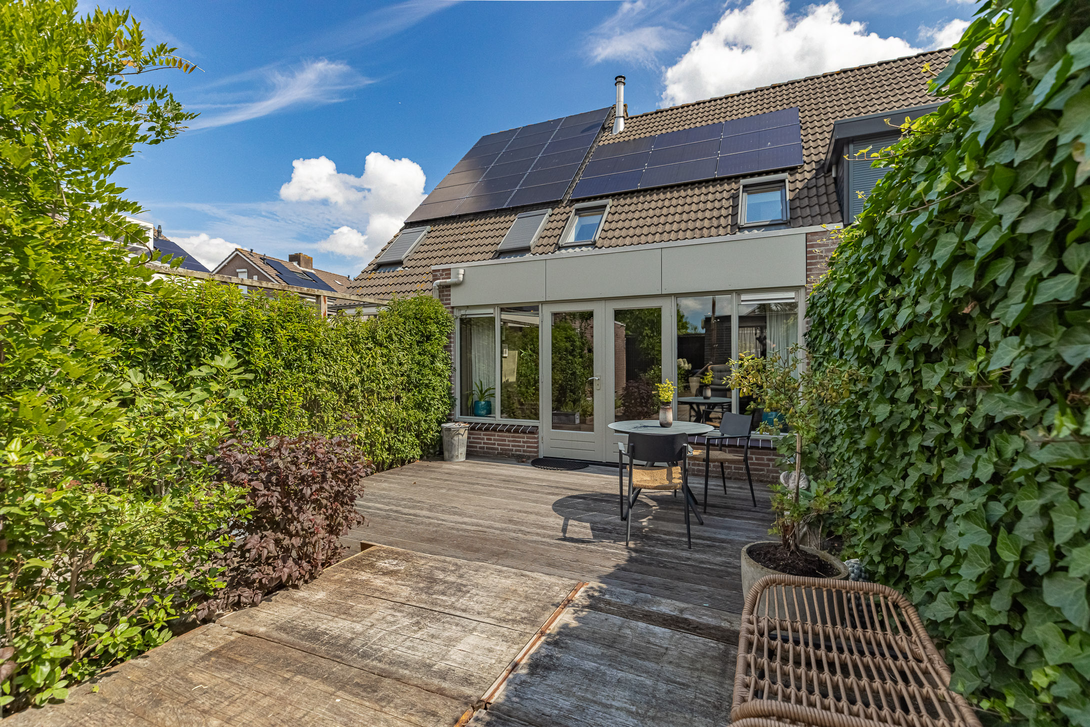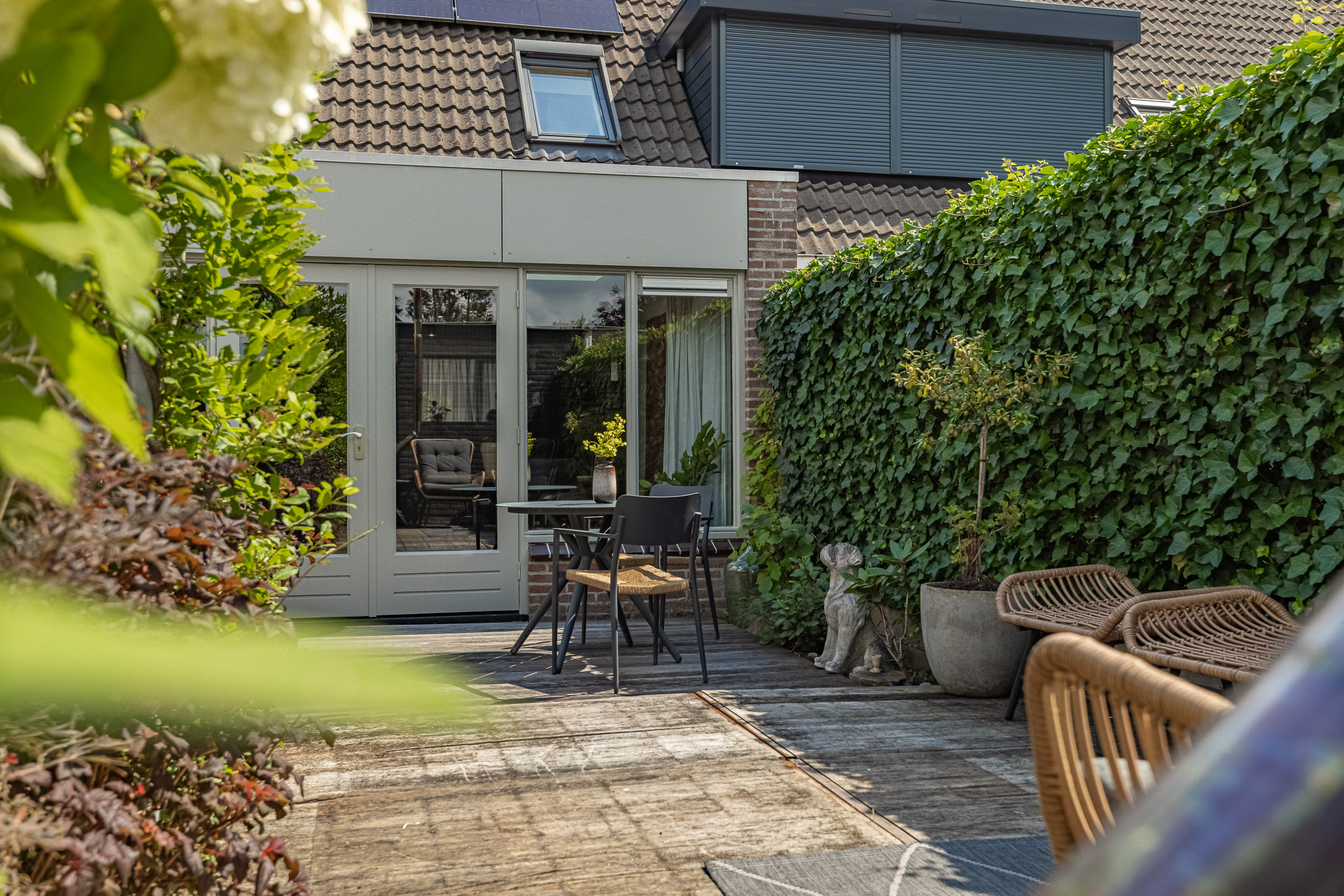De achtertuin is een fijne plek om te relaxen of met vrienden te borrelen. Er liggen hardhouten vlonders, een verhoogd terras van steenschotten, en je hebt een vrijstaande stenen berging én een achterom. Super praktisch voor je fiets of tuinspullen.