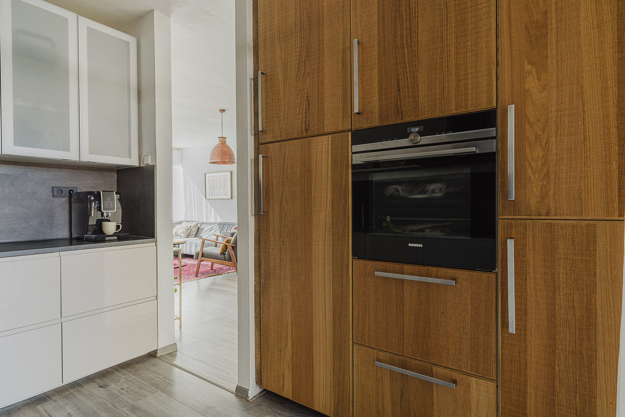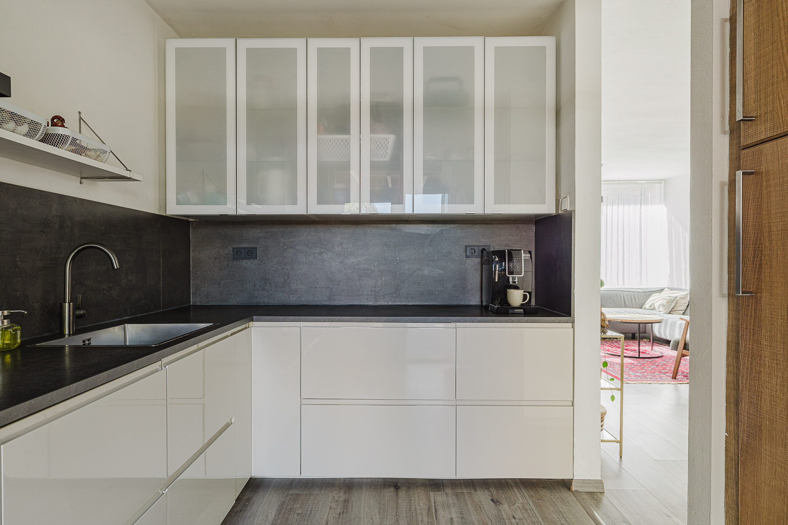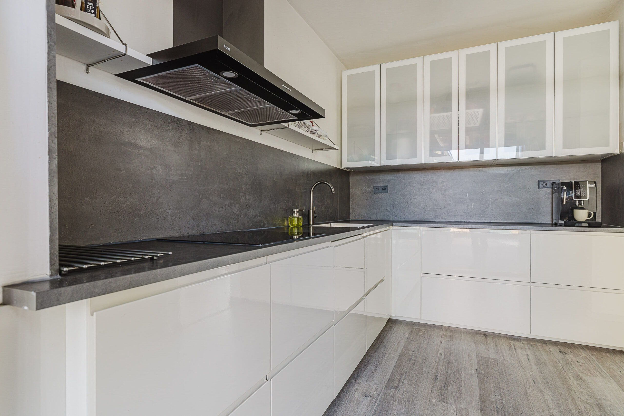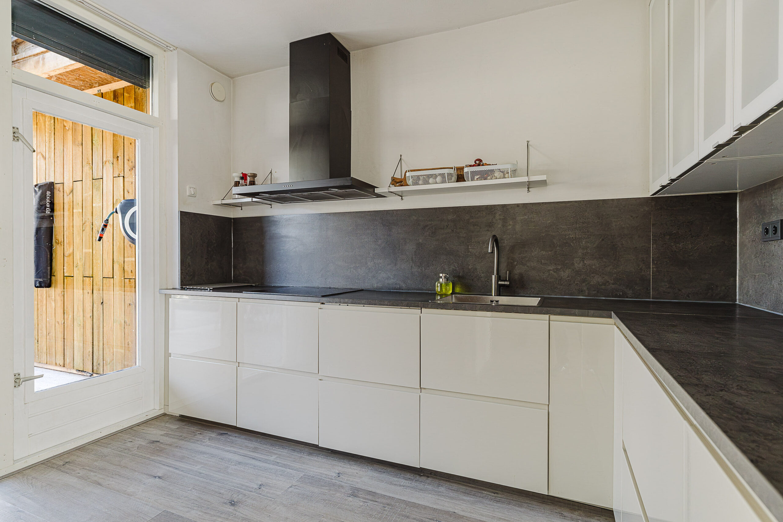 De open keuken is modern uitgevoerd en voorzien van diverse inbouwapparatuur, waaronder een vaatwasser en een inductiekookplaat.