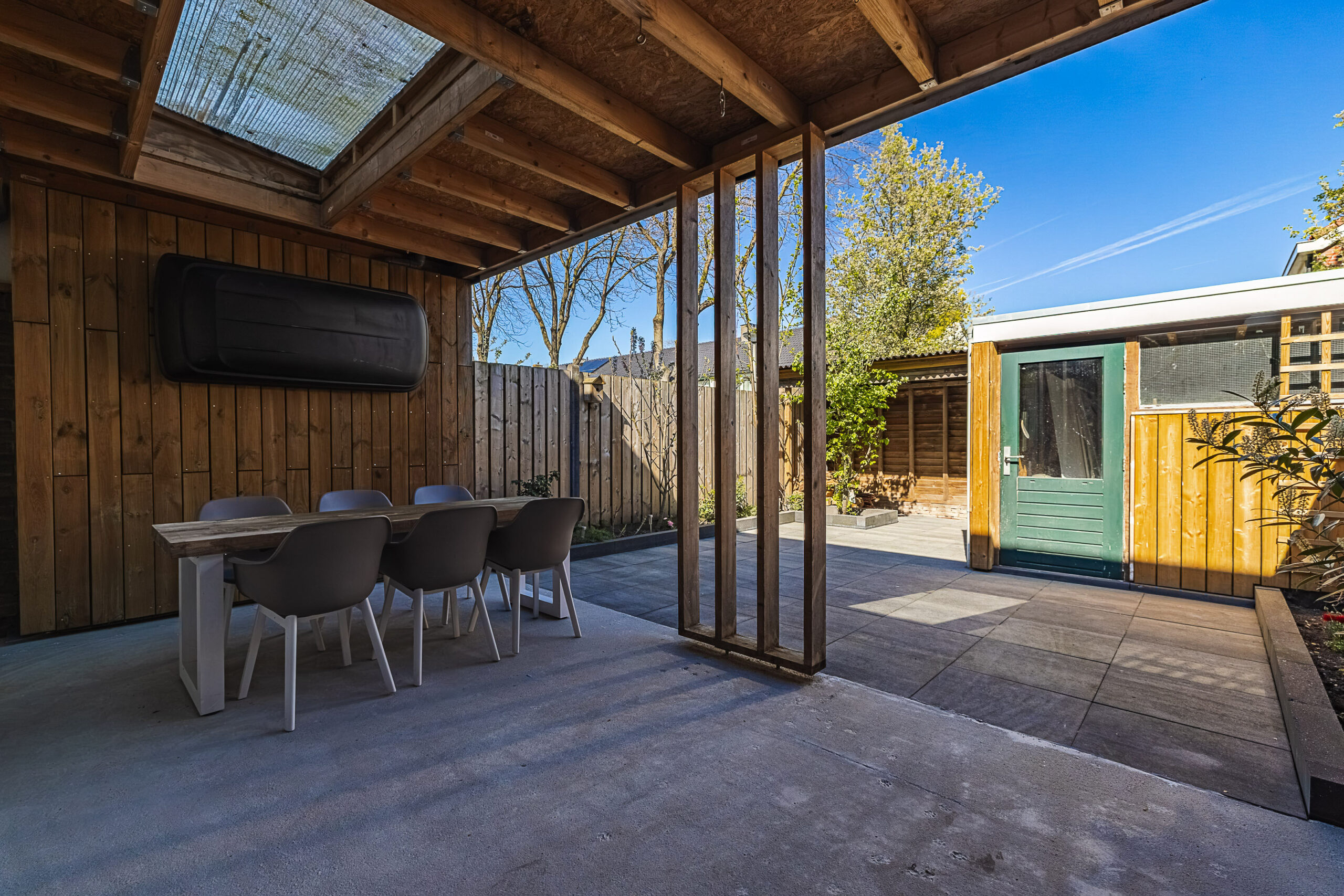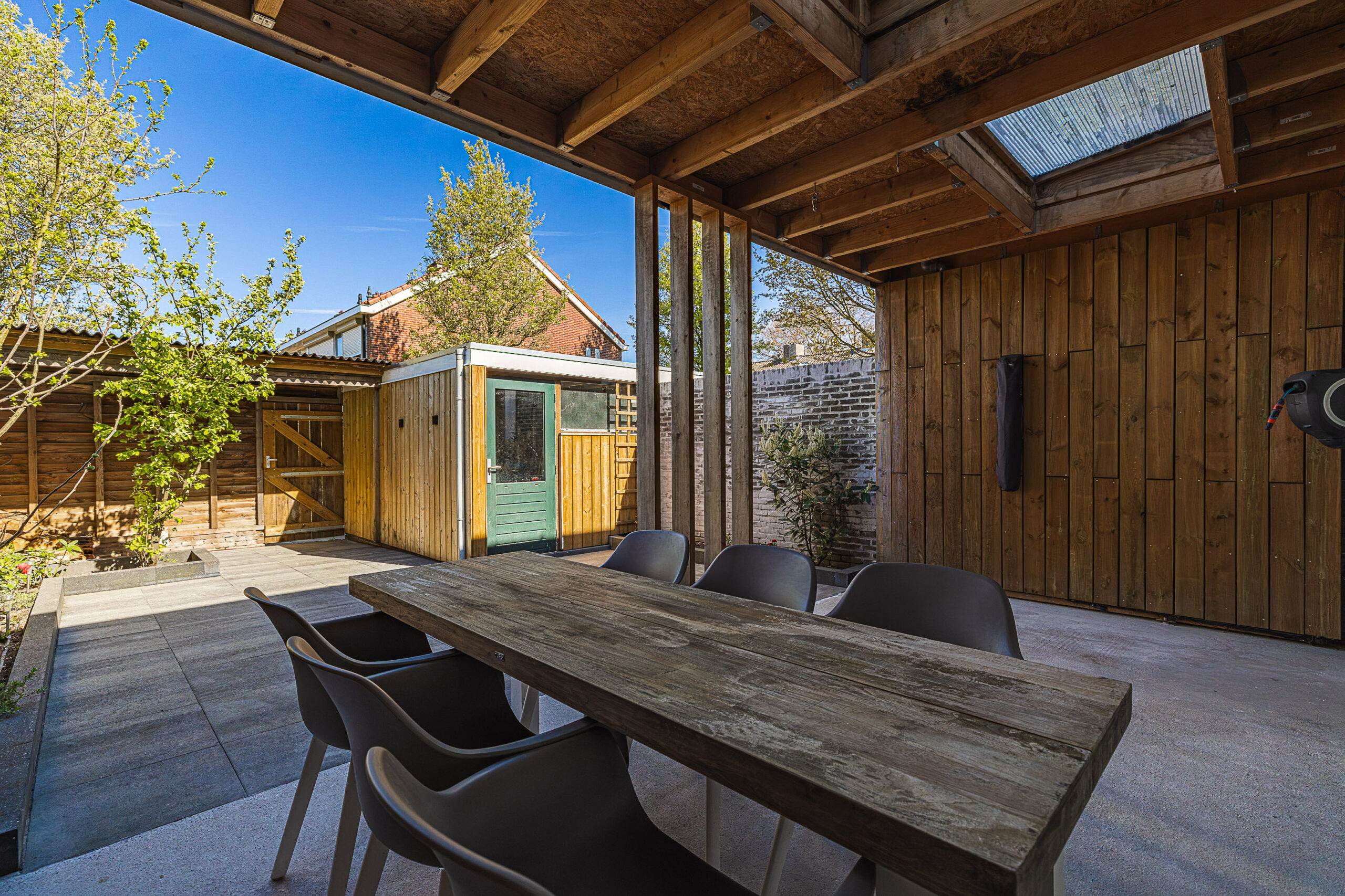 De achtertuin is gelegen op het noorden en beschikt over een praktische achterom. Aansluitend aan de woning bevindt zich een sfeervolle houten overkapping met lichtkoepels, die zorgen voor een aangename lichtinval. Daarnaast is er een berging aanwezig, voorzien van elektra en met voldoende ruimte voor het stallen van fietsen en het opbergen van tuingereedschap.