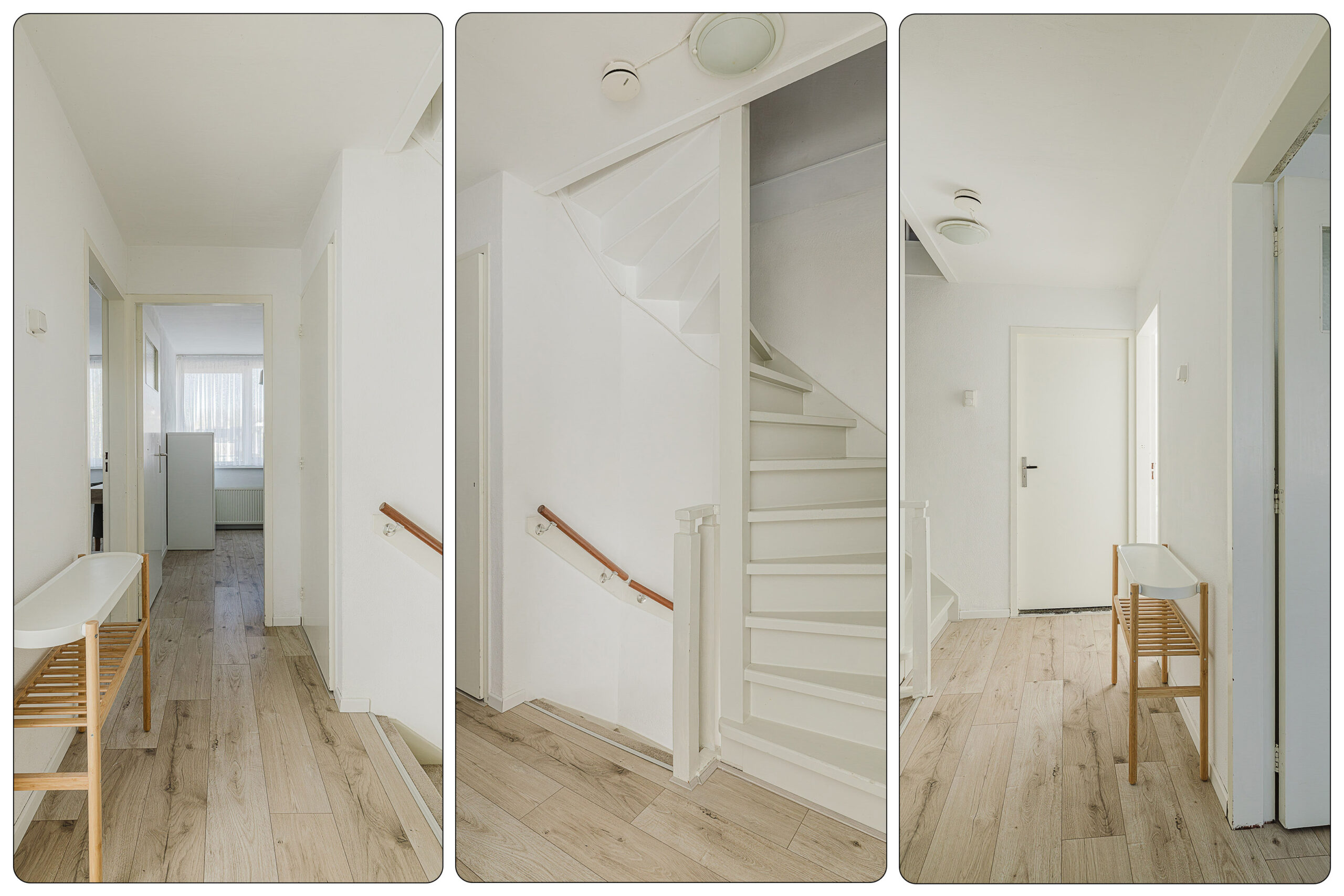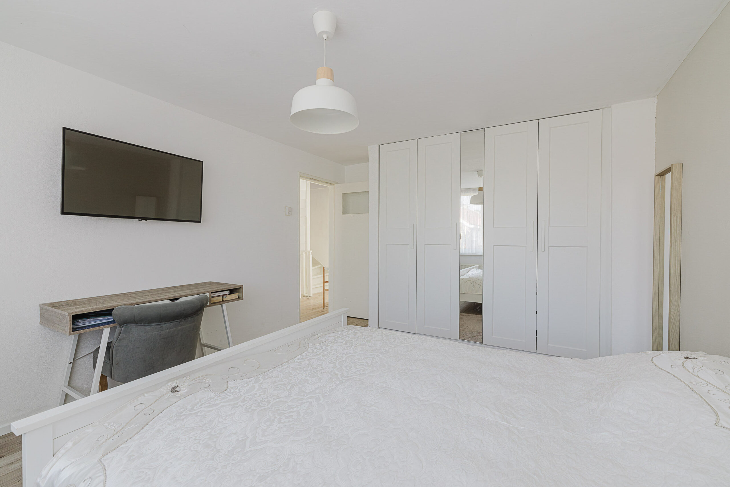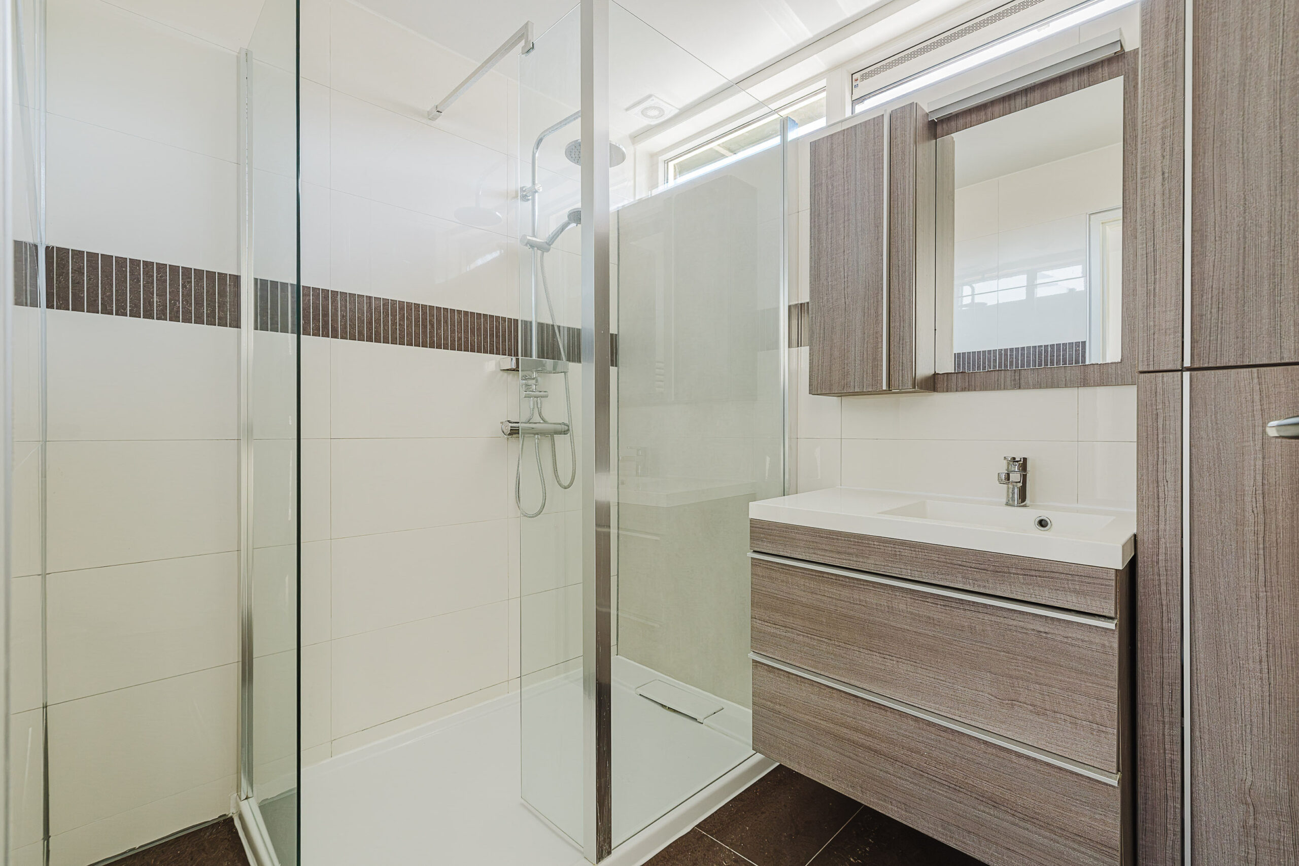 Op de eerste verdieping bevinden zich drie goed bemeten slaapkamers. Daarnaast is er een nette badkamer aanwezig, uitgerust met een douche en wastafel. Deze verdieping biedt volop mogelijkheden voor een gezin of om een extra werk- of hobbykamer in te richten. Op de overloop is ook een handige bergkast aanwezig.