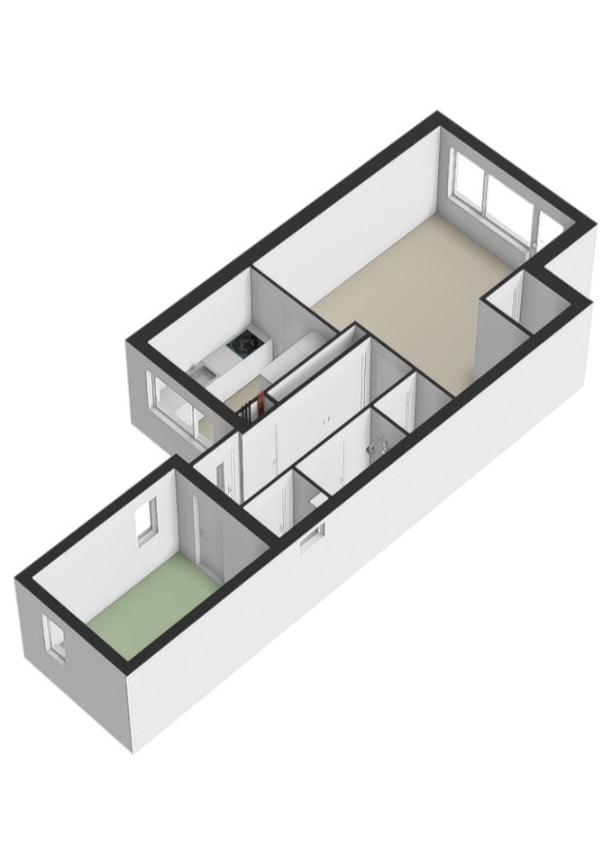 Via de voortuin bereik je de entreehal met meterkast en toegang tot alle vertrekken. Aan de voorzijde van de woning ligt de slaapkamer van circa 10 m². Deze ruimte is volledig geïsoleerd en verwarmd en afgewerkt met een nette PVC-vloer.