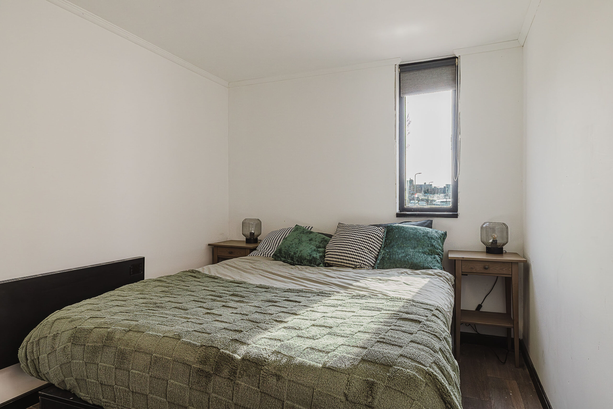 De lichte woonkamer is voorzien van strak gestucte wanden en een PVC-vloer. Dankzij de praktische indeling is er voldoende ruimte voor zowel een comfortabele zithoek als een eettafel. Een vaste bergkast biedt extra opbergruimte.