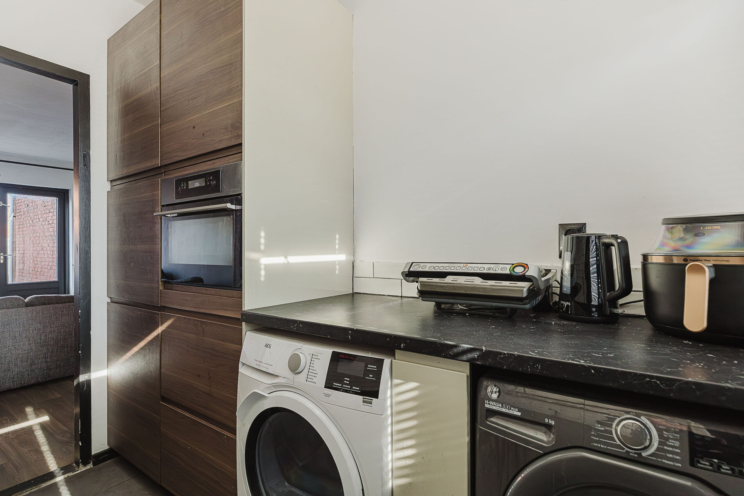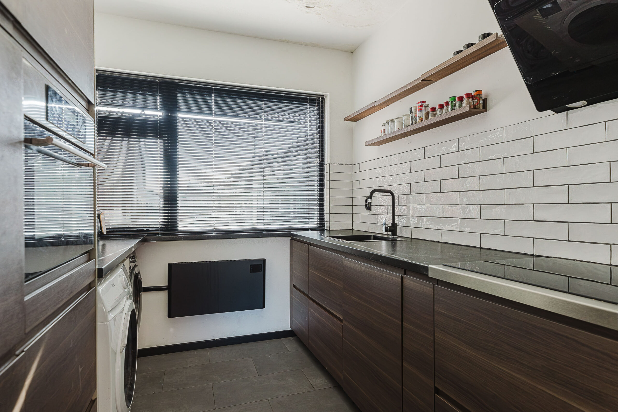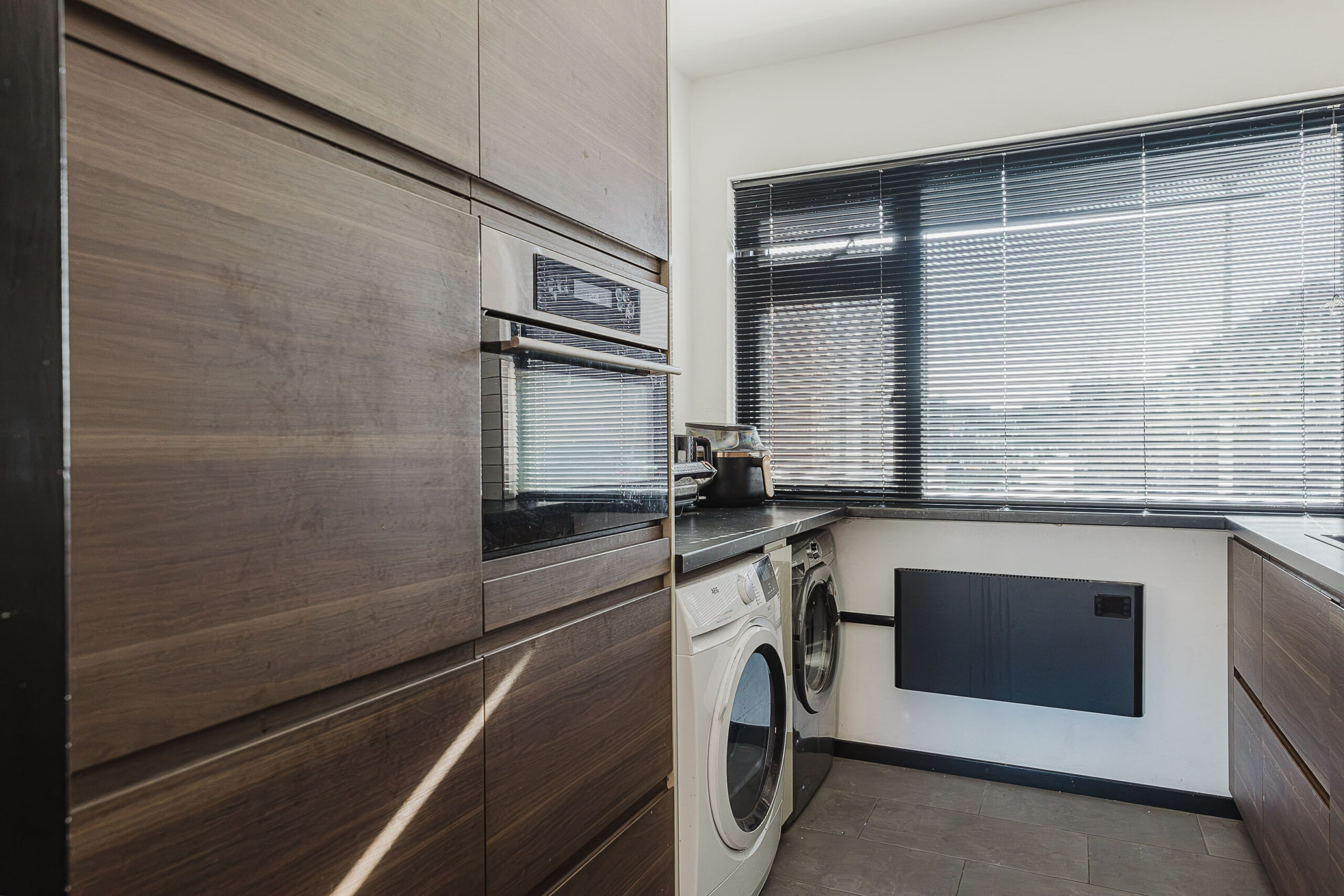 De gesloten keuken ligt aan de voorzijde van de woning en is uitgevoerd in een lichte, rechte opstelling met inbouwapparatuur. Ook de aansluiting voor de wasmachine is hier gesitueerd.