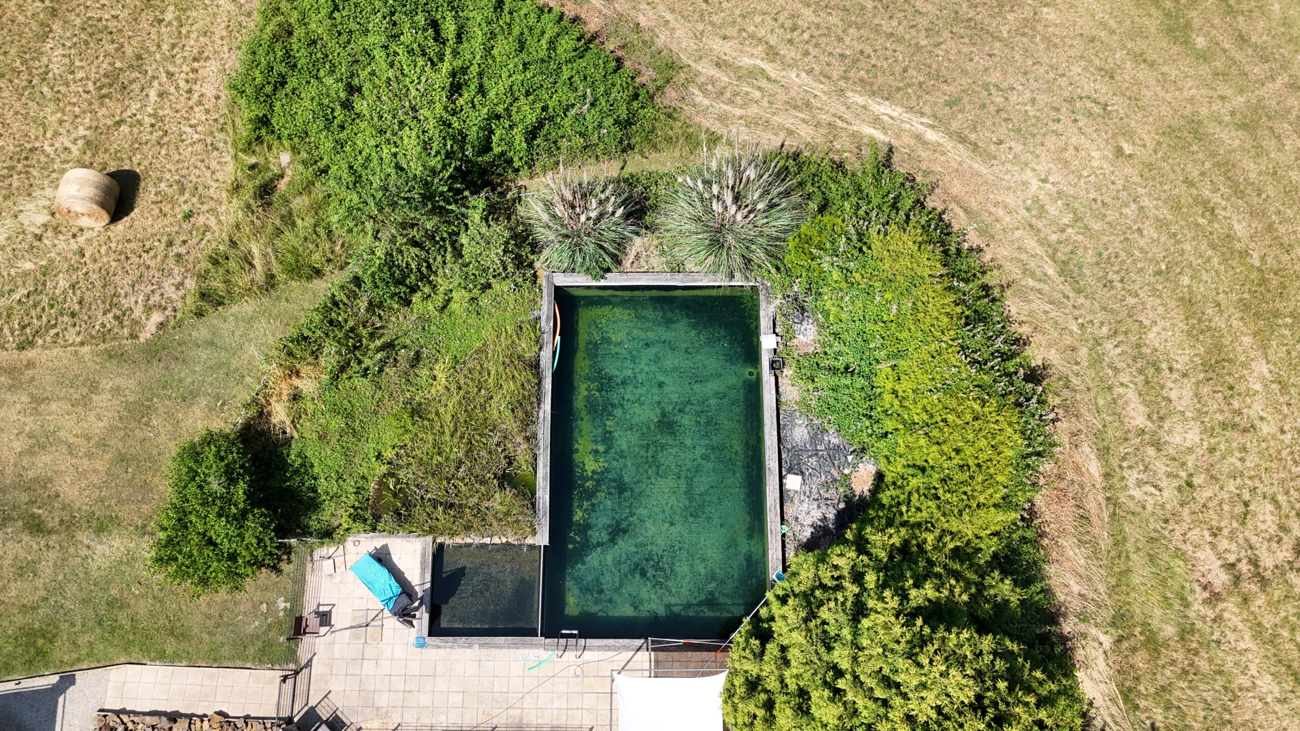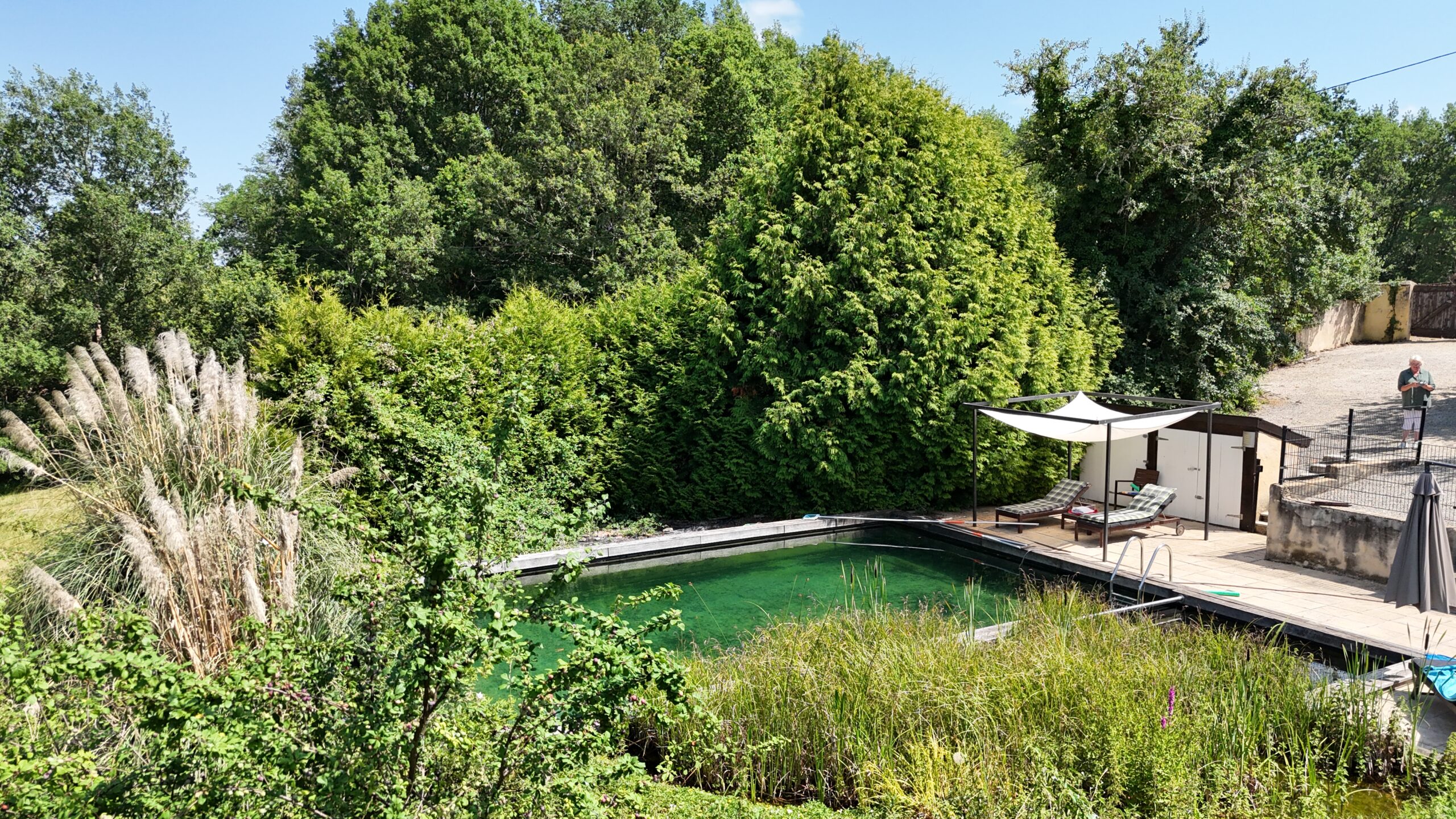 Direct naast de gîte ligt een natuurlijke zwembadpartij, perfect geïntegreerd in het landschap.