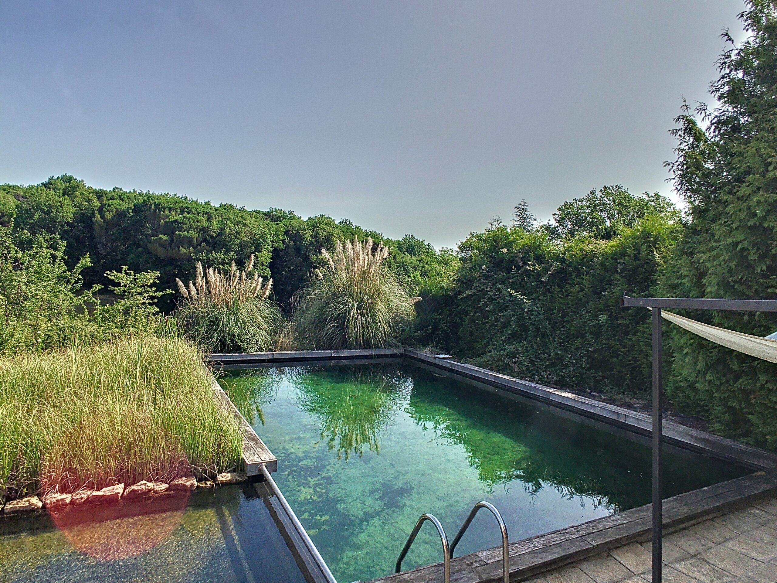 De woonkamer is uitgerust met een houtinzet (insert) en grote openslaande deuren die toegang geven tot het terras. Vanaf hier geniet u van een vrij en weids uitzicht over het terrein en de natuurlijke zwembadpartij.