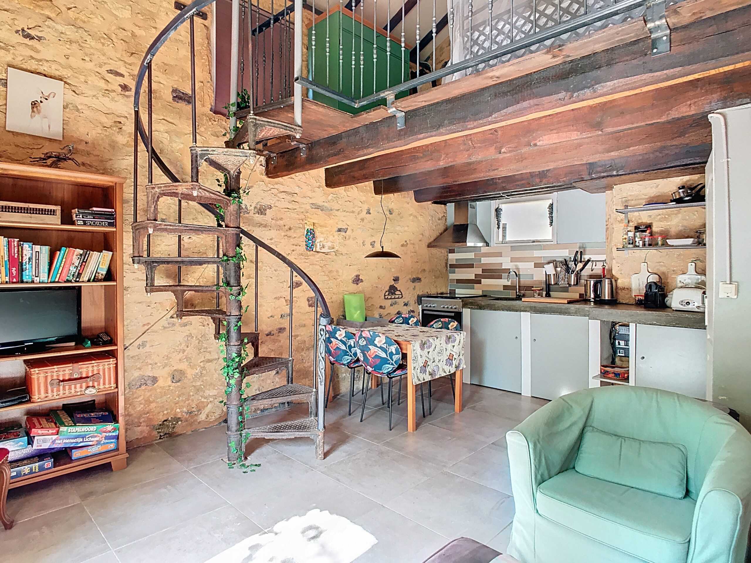 De slaapkamer ligt op de mezzanine en is bereikbaar via een metalen trap, wat het geheel een speels en karaktervol accent geeft.