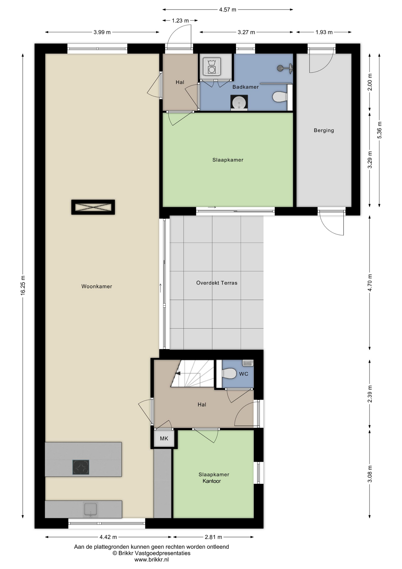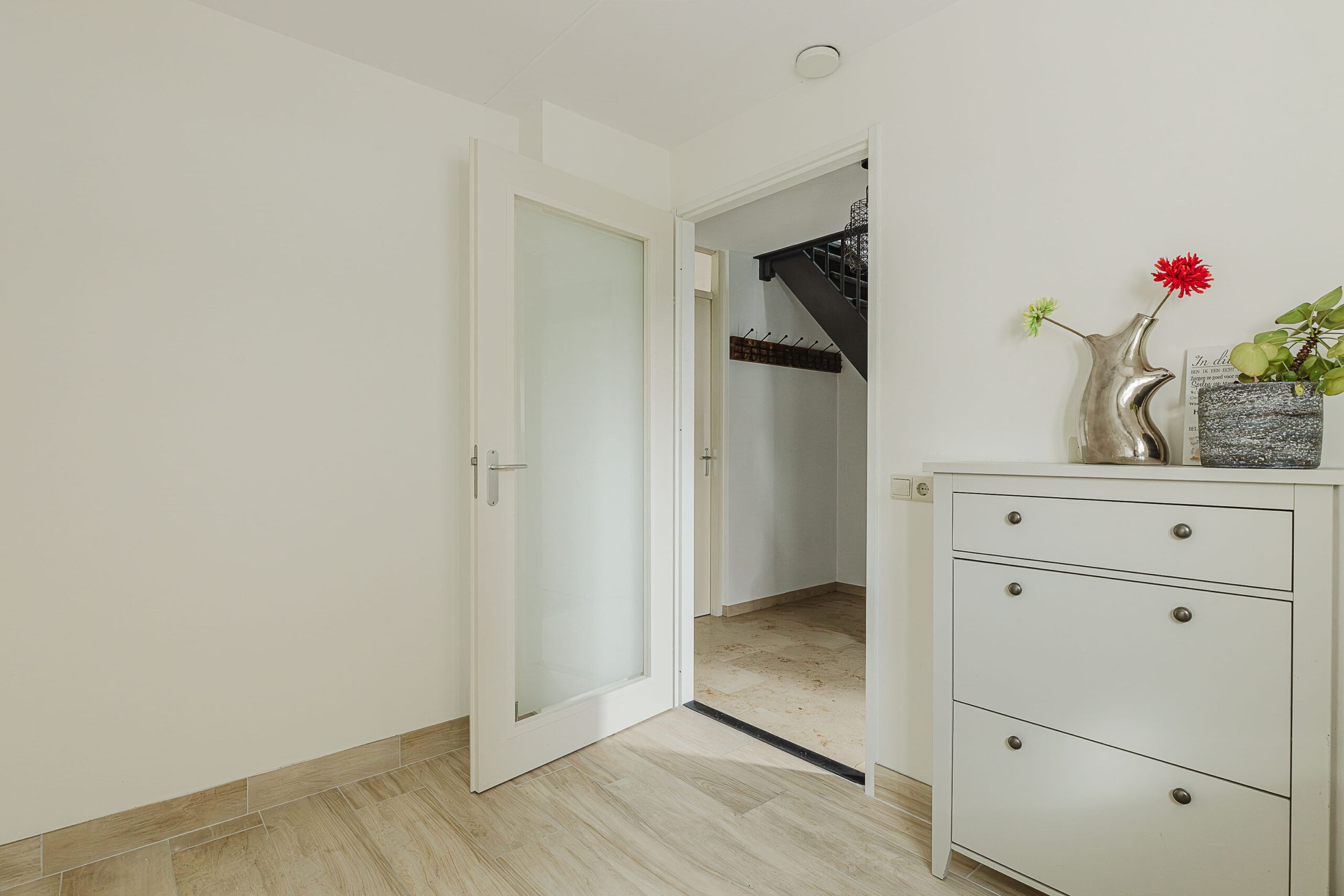 Via de hal met meterkast, toiletruimte en trapopgang bereikt u de werkkamer en de woonkamer met open keuken. De werkkamer bevindt zich aan de voorzijde van de woning en is voorzien van vloerverwarming. Een ideale ruimte voor thuiswerken, praktijk aan huis of hobbyruimte.