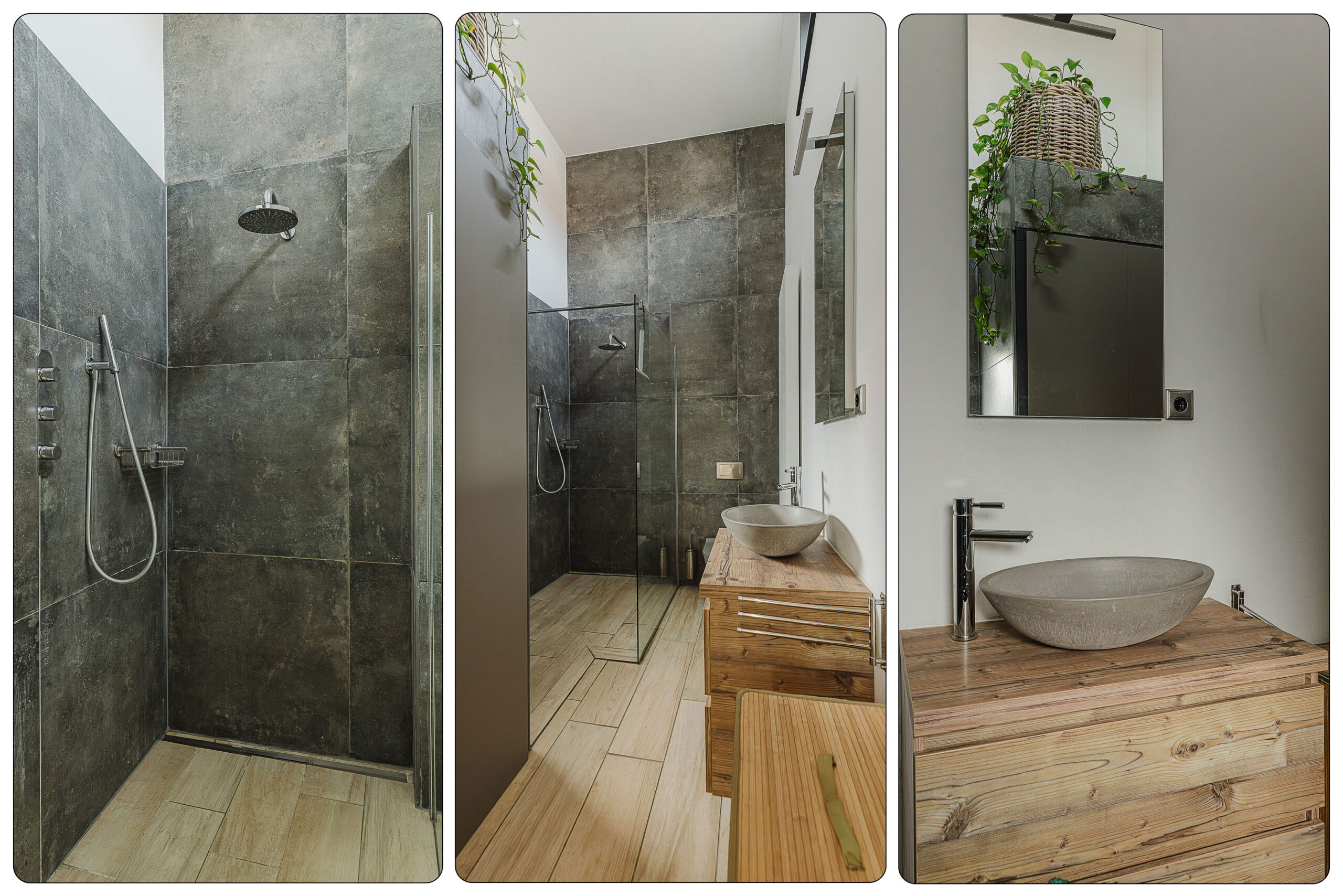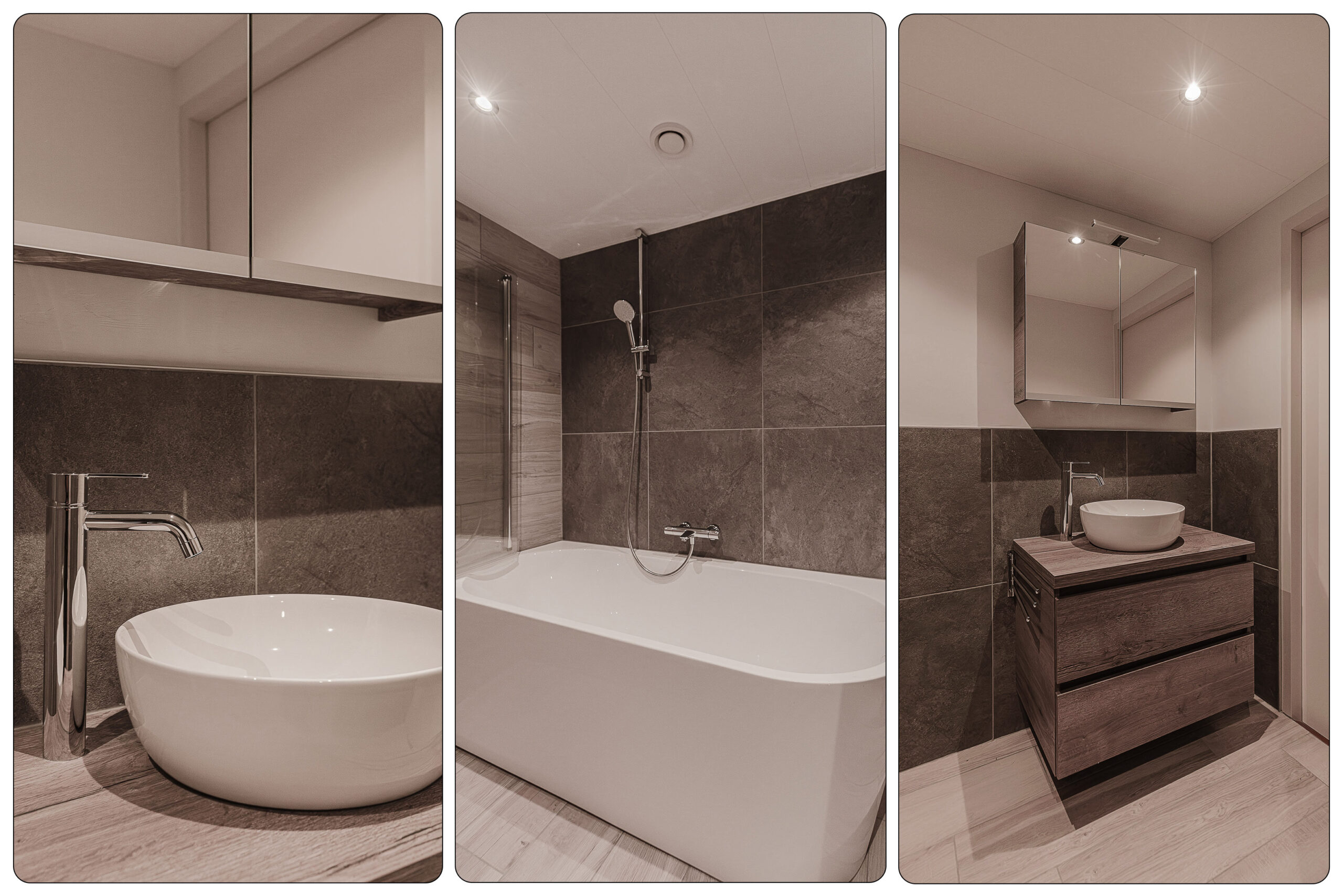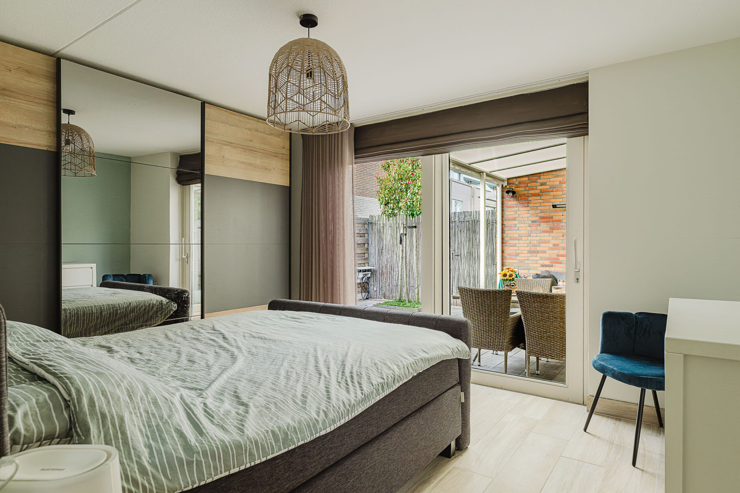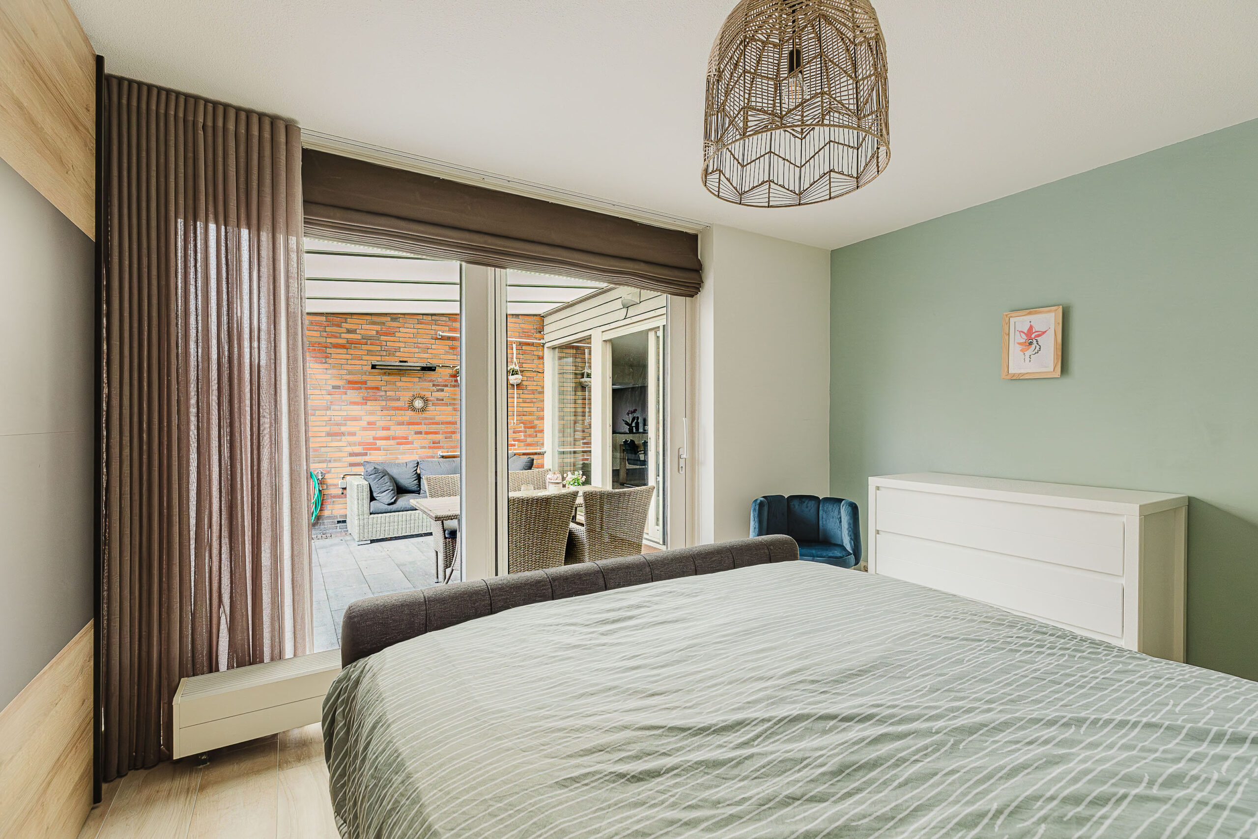 Aan de achterzijde bevindt zich een tweede hal met een extra deur naar tuin. Vanuit hier bereikt u de royale slaapkamer met aangrenzende luxe badkamer. De badkamer is voorzien van een ruime inloopdouche, toilet, wastafelmeubel en een fraai afgewerkte kast met wasmachine- en drogeraansluiting.