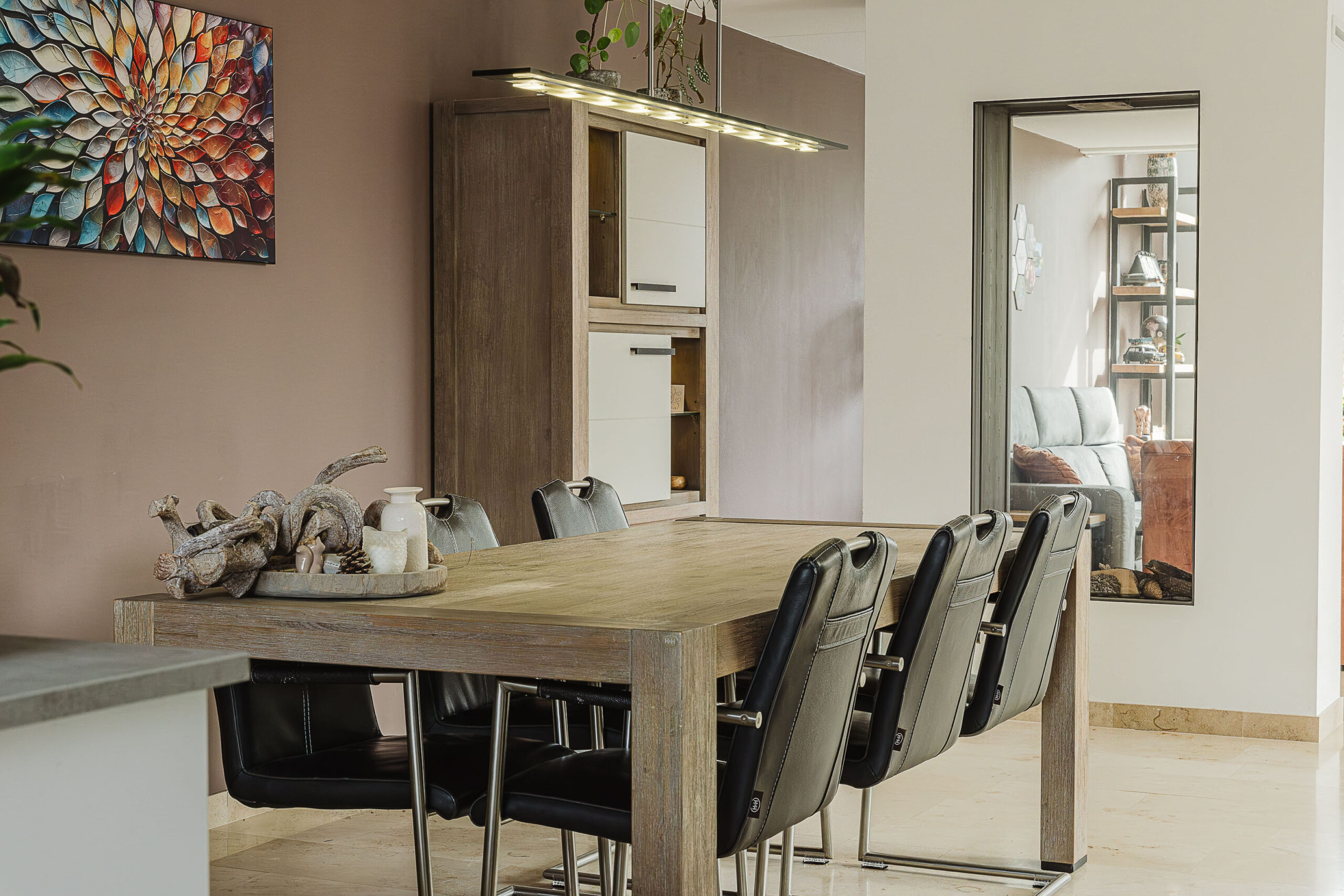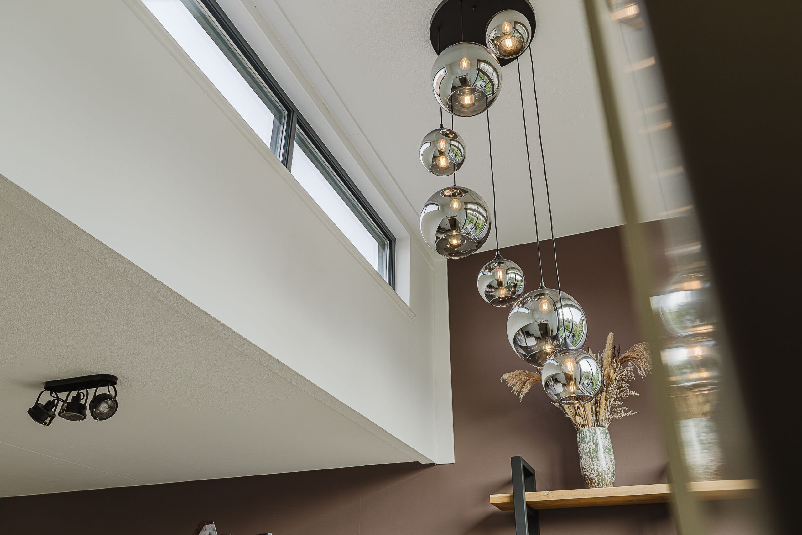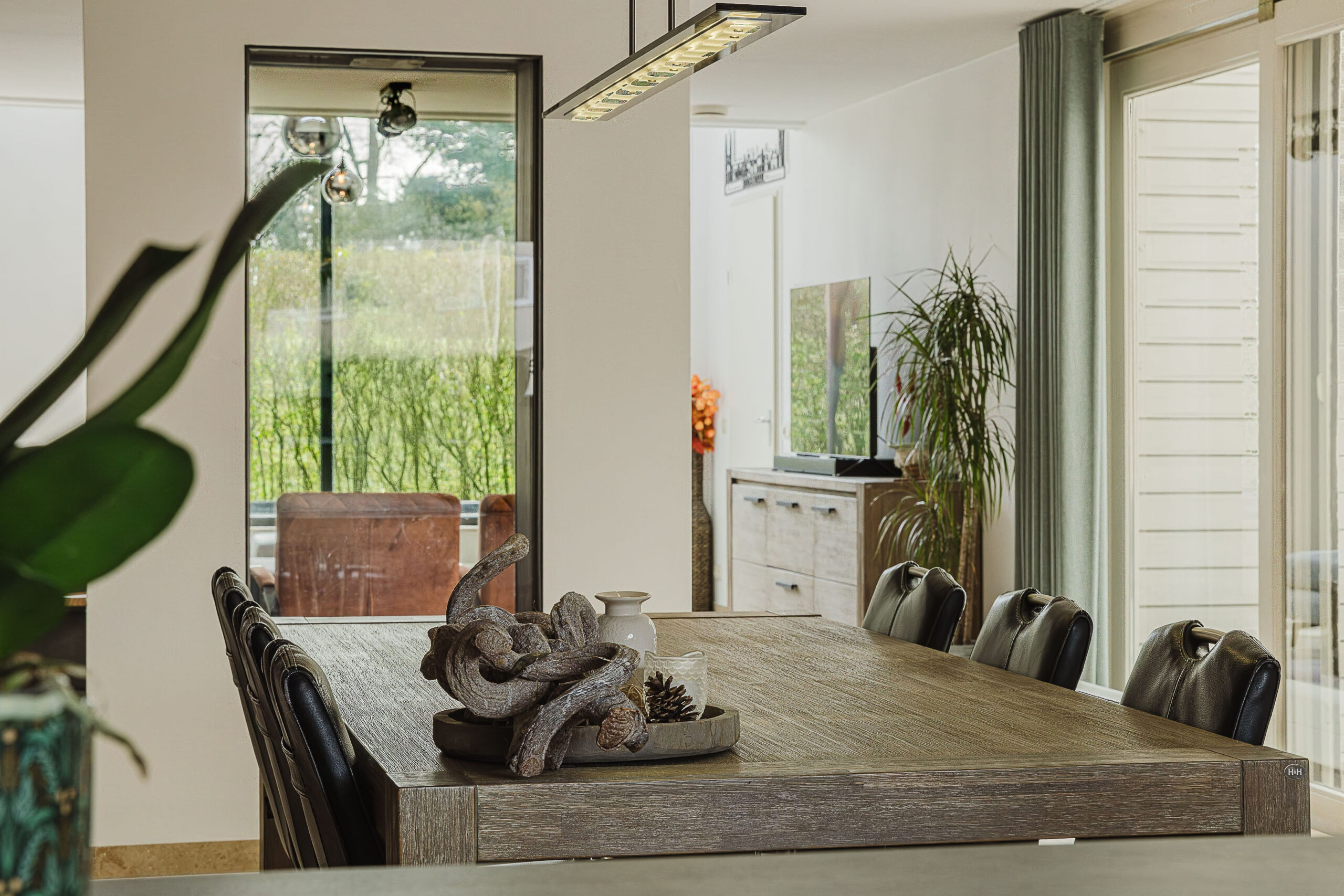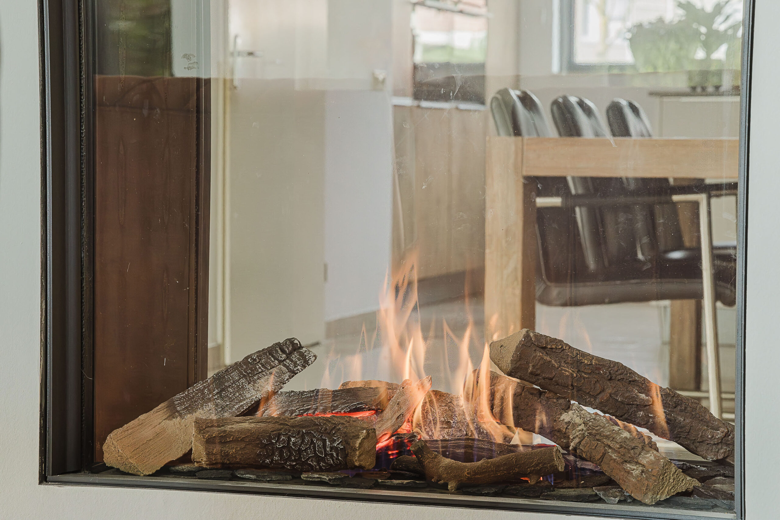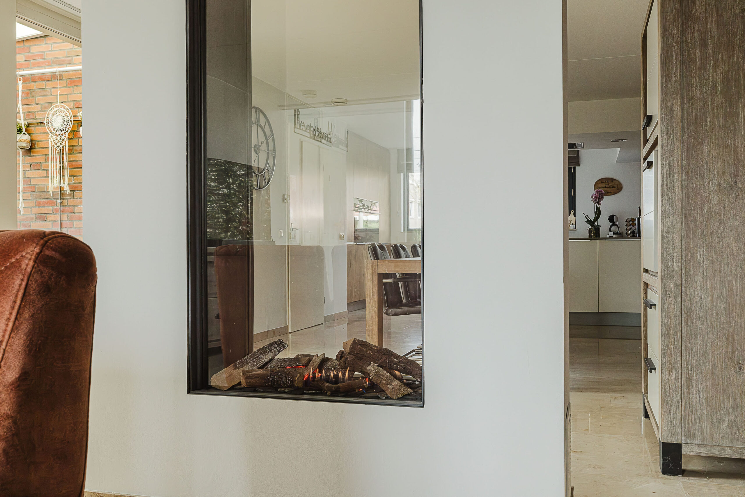 De woonkamer is ruim en licht en wordt op sfeervolle wijze gescheiden van de keuken door een vrijstaande, manshoge doorkijkhaard. De gehele begane grond is voorzien van een natuurstenen vloer met comfortabele vloerverwarming.