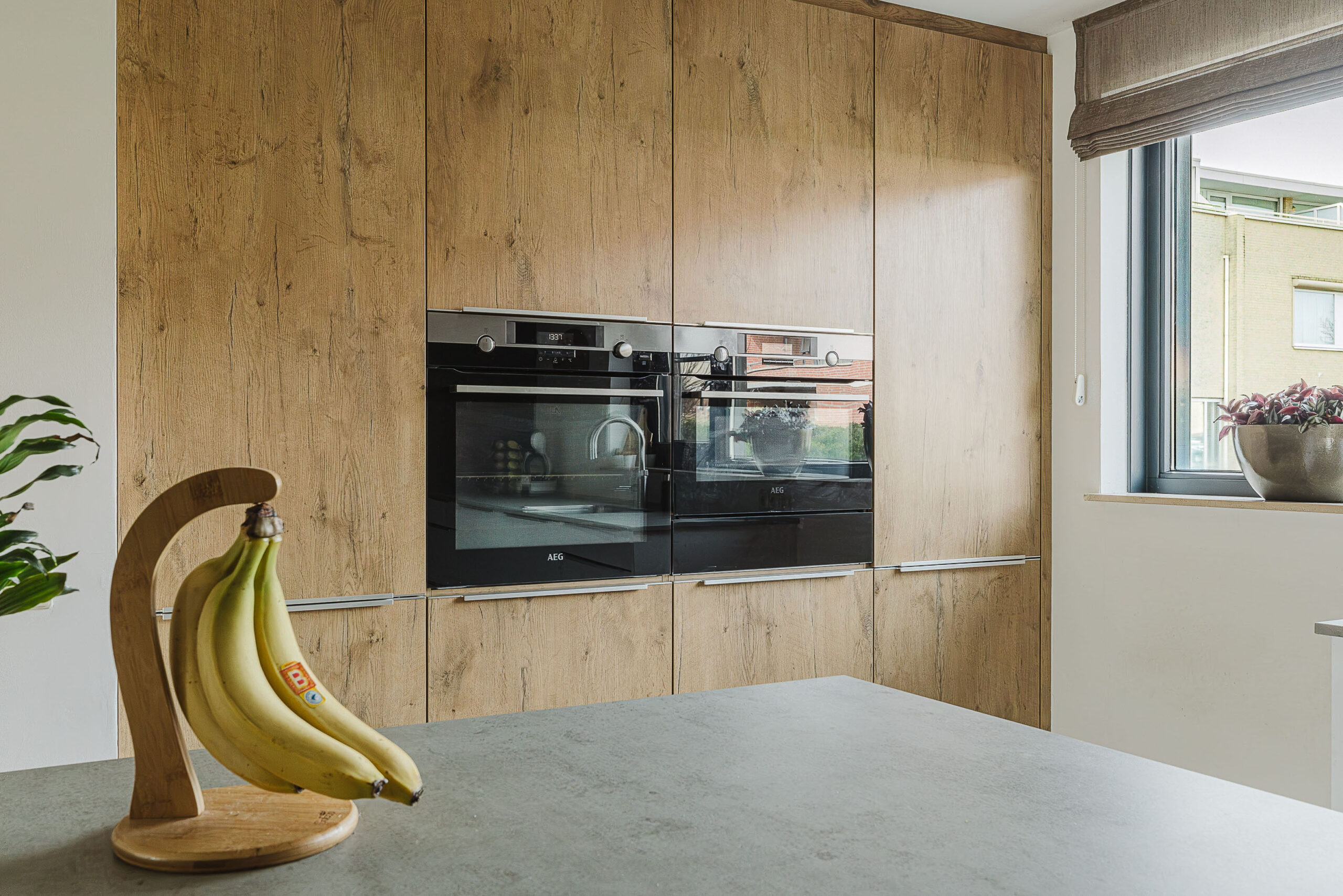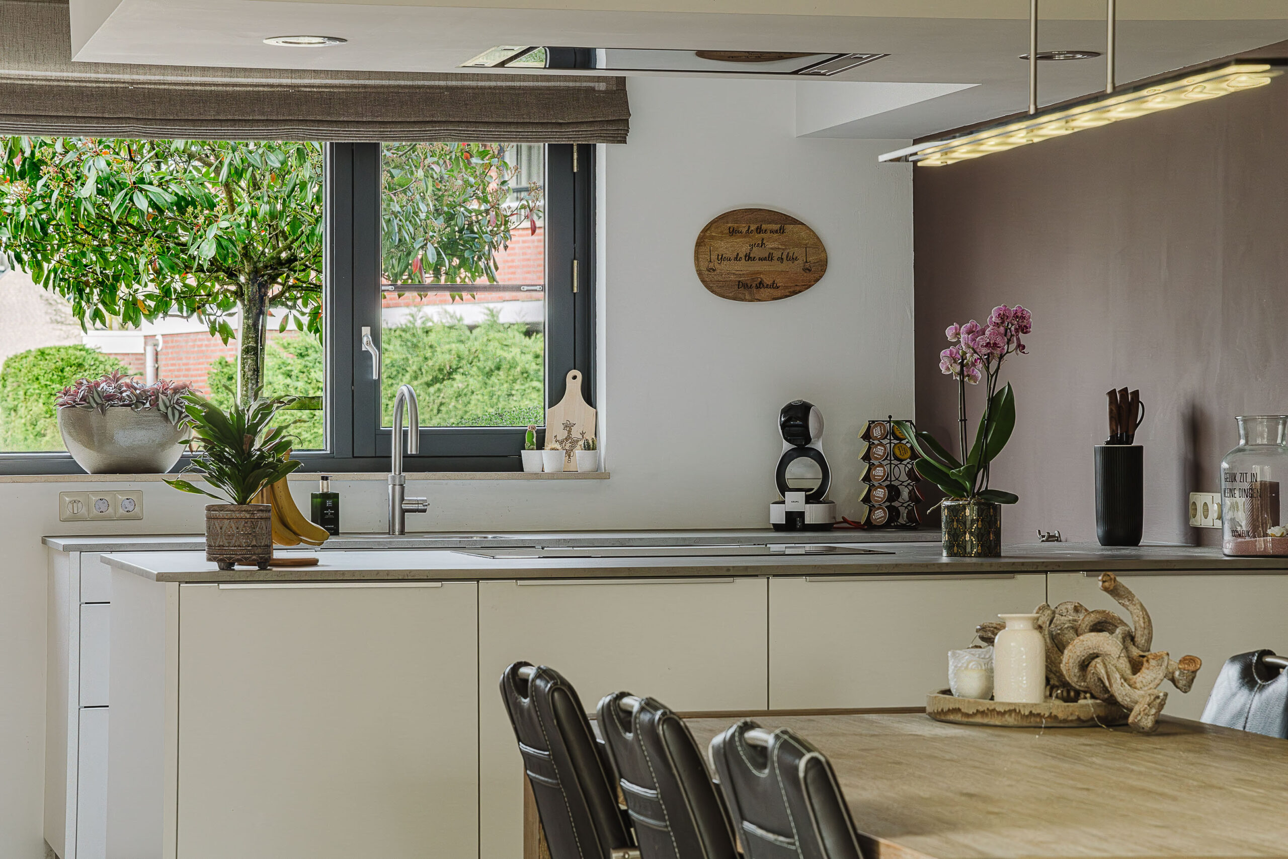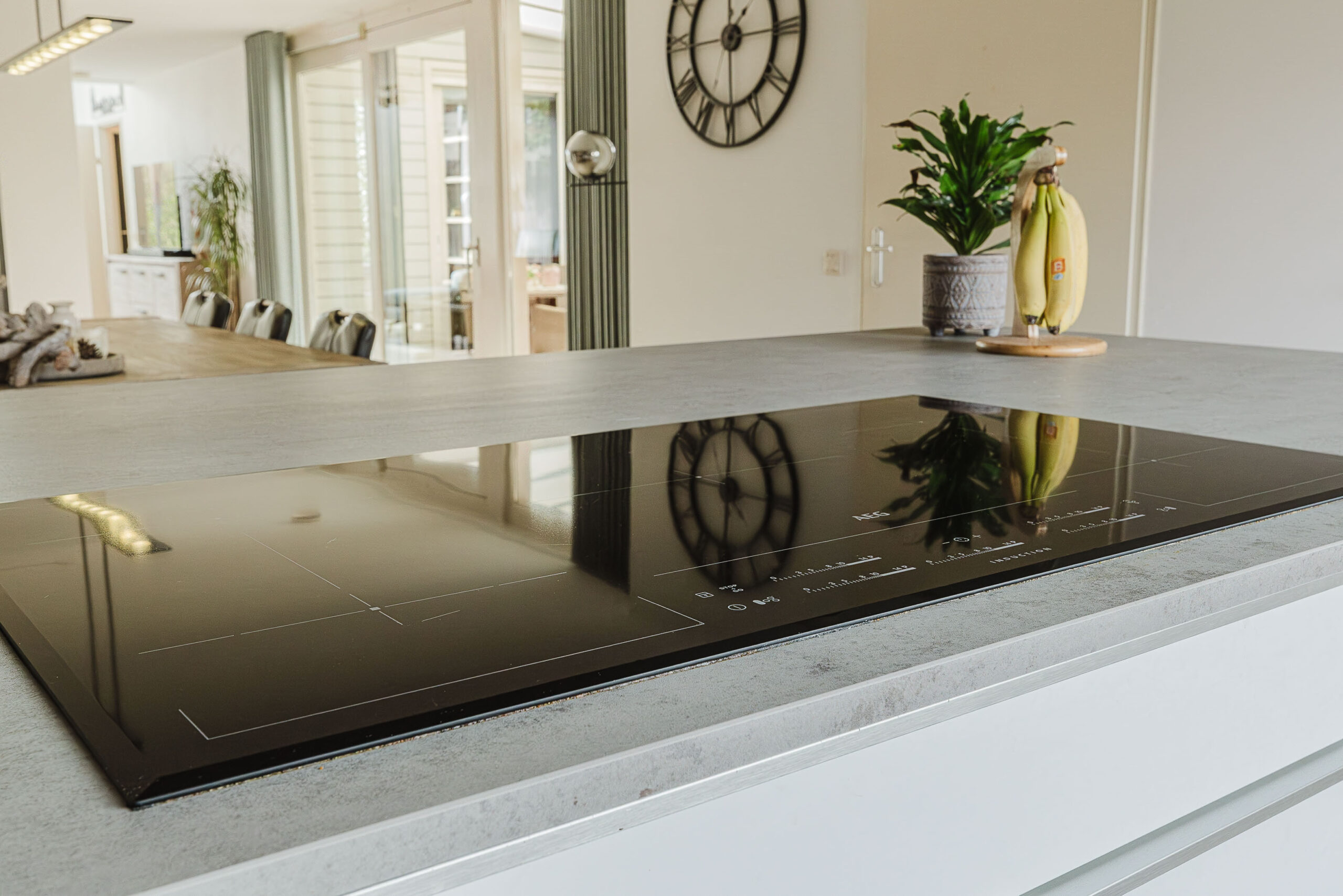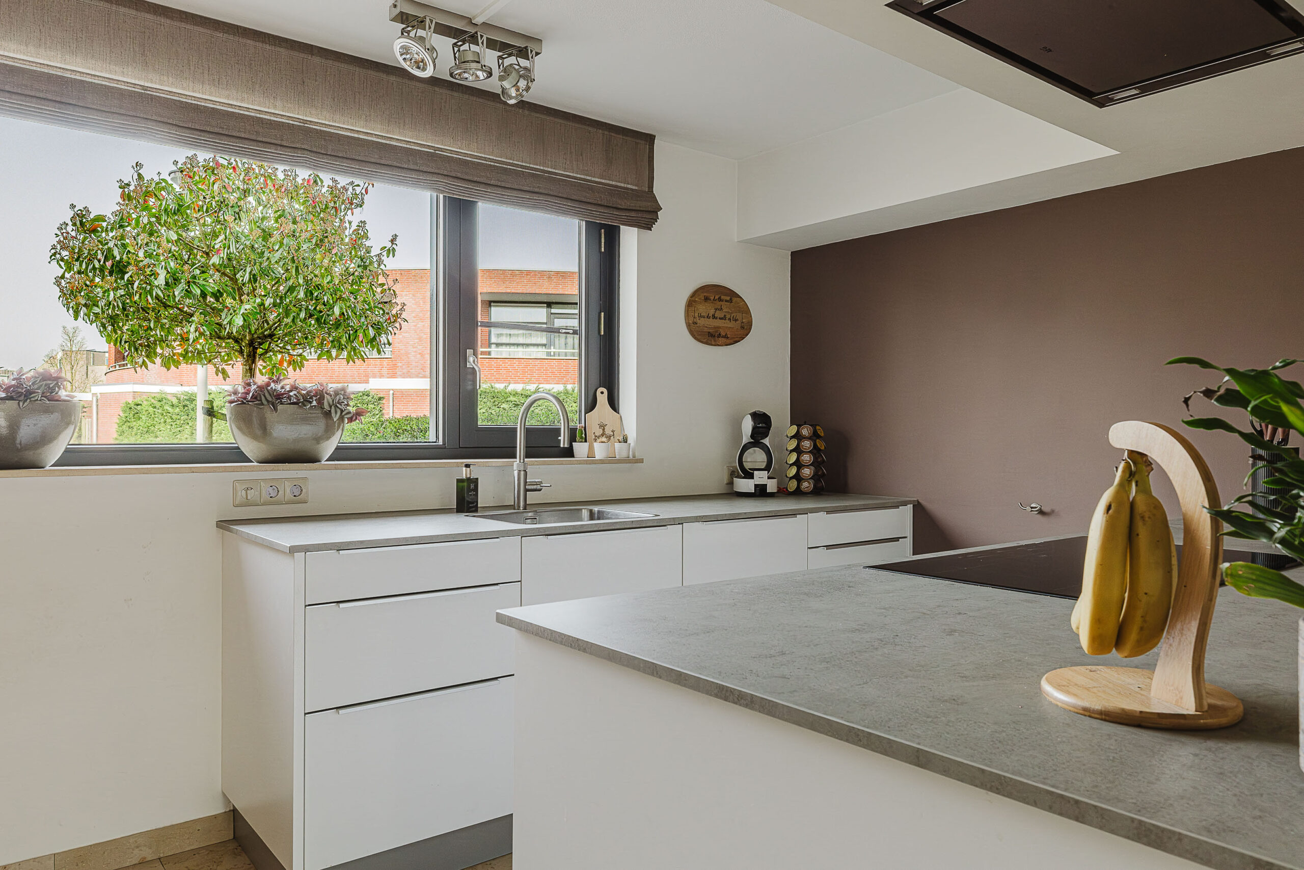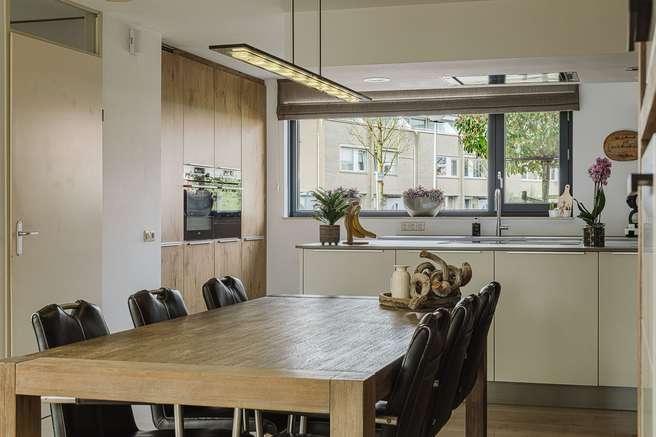 De lichte, stijlvolle keuken met kookeiland is eveneens aan de voorzijde gesitueerd en beschikt over een fraaie raampartij met vrij uitzicht op de straat. De keuken is luxe uitgevoerd met keramische werkbladen en diverse inbouwapparatuur, waaronder een koelkast, oven, combimagnetron, vaatwasser en een brede 5-pits inductiekookplaat met geïntegreerde afzuiging. Het schiereiland fungeert als gezellige bar – dé plek waar men samenkomt tijdens etentjes en borrels.