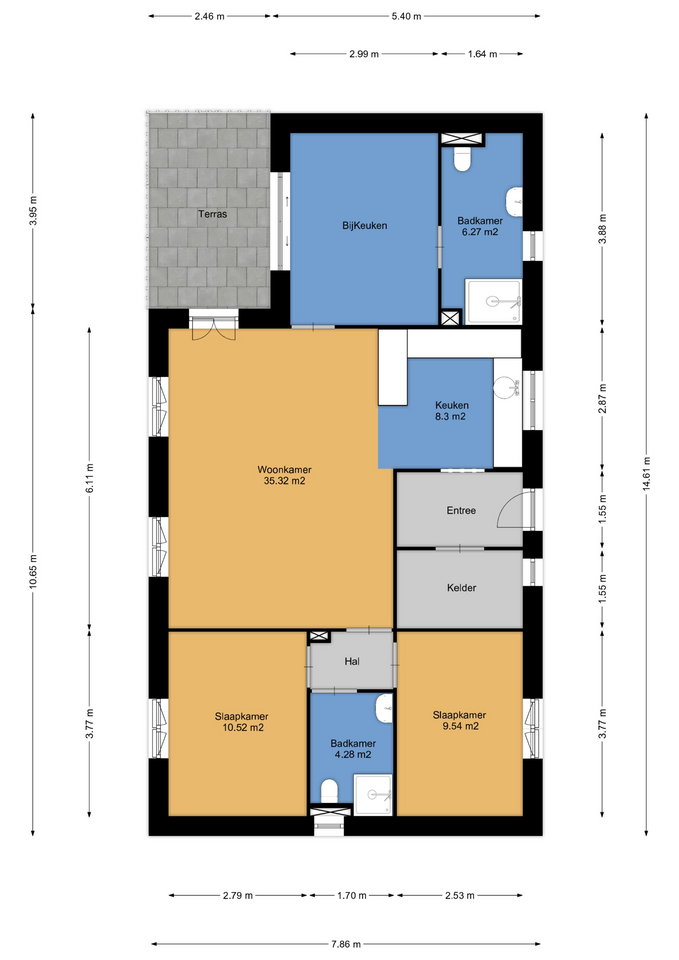 De woning beschikt over een lichte woonkamer met open keuken (35 m²), waar grote ramen zorgen voor veel daglicht en een prettige verbinding met de tuin. Aangrenzend bevindt zich een handige voorraadkast van 3,5 m². De master suite (11 m²) beschikt over een eigen badkamer met douche en toilet (6 m²), wat zorgt voor optimaal comfort en privacy. Daarnaast zijn er twee extra slaapkamers van 10,5 m² en 9,5 m², perfect voor kinderen, gasten of werkruimte. Een tweede moderne badkamer met douche en toilet (4,2 m²) maakt de praktische indeling compleet.