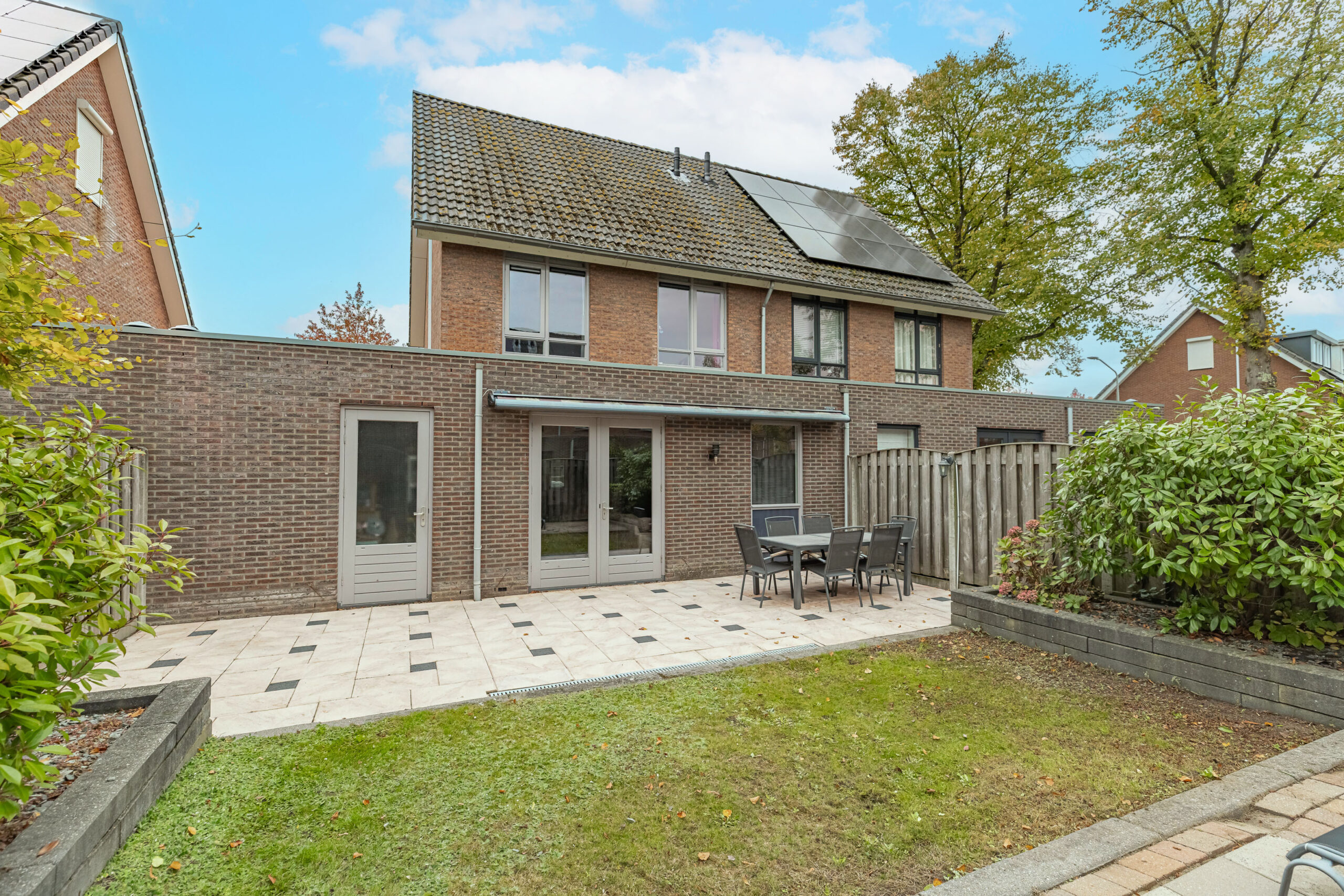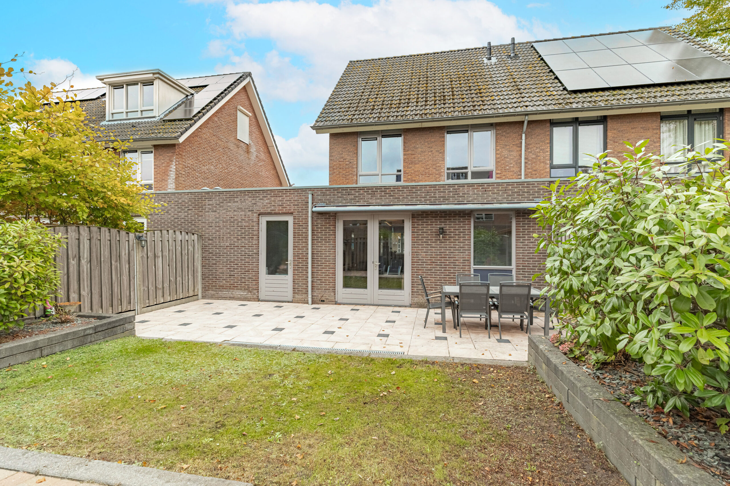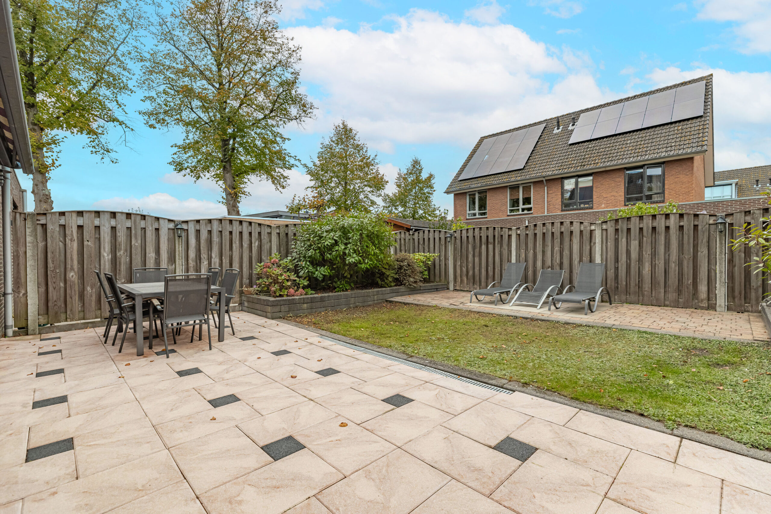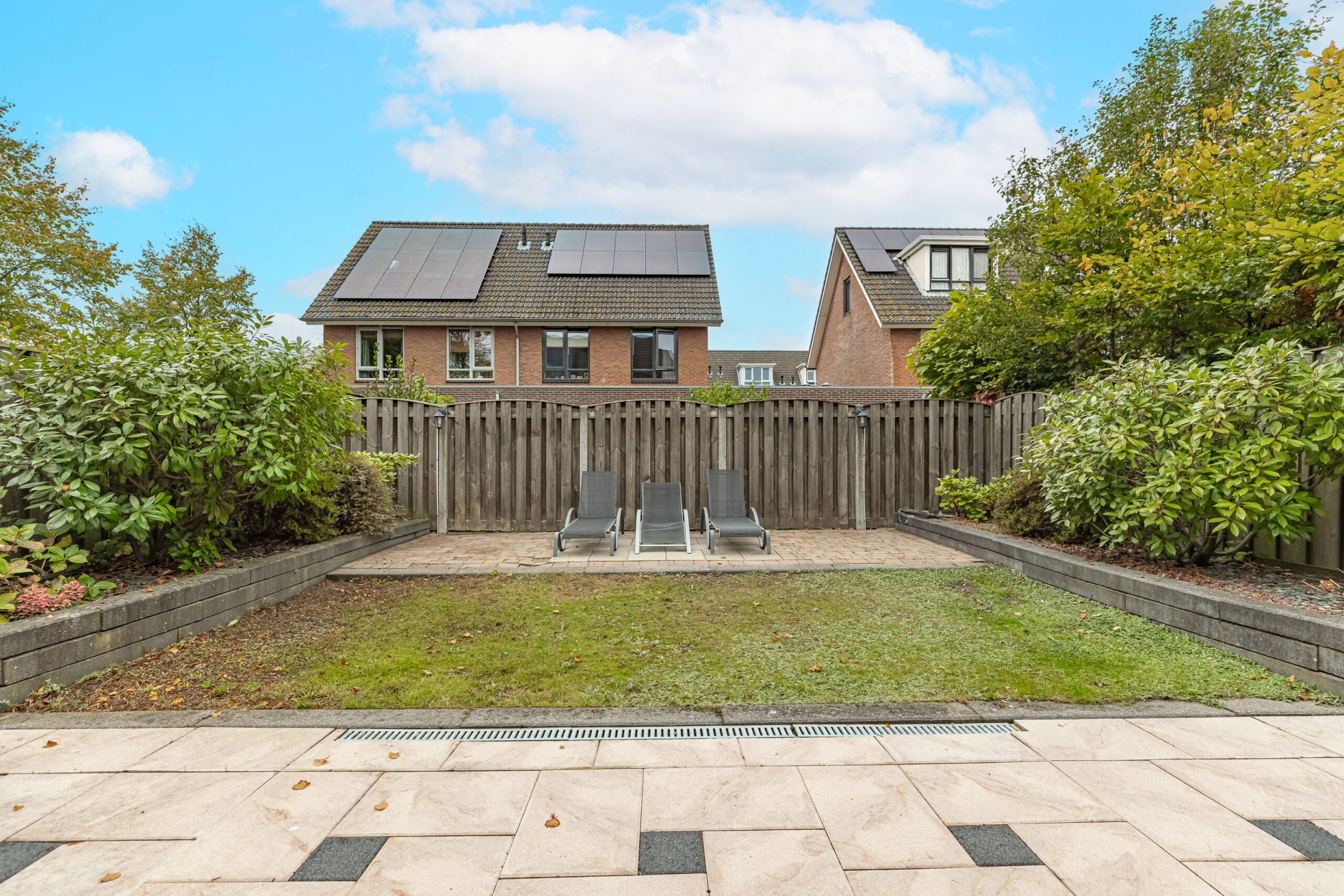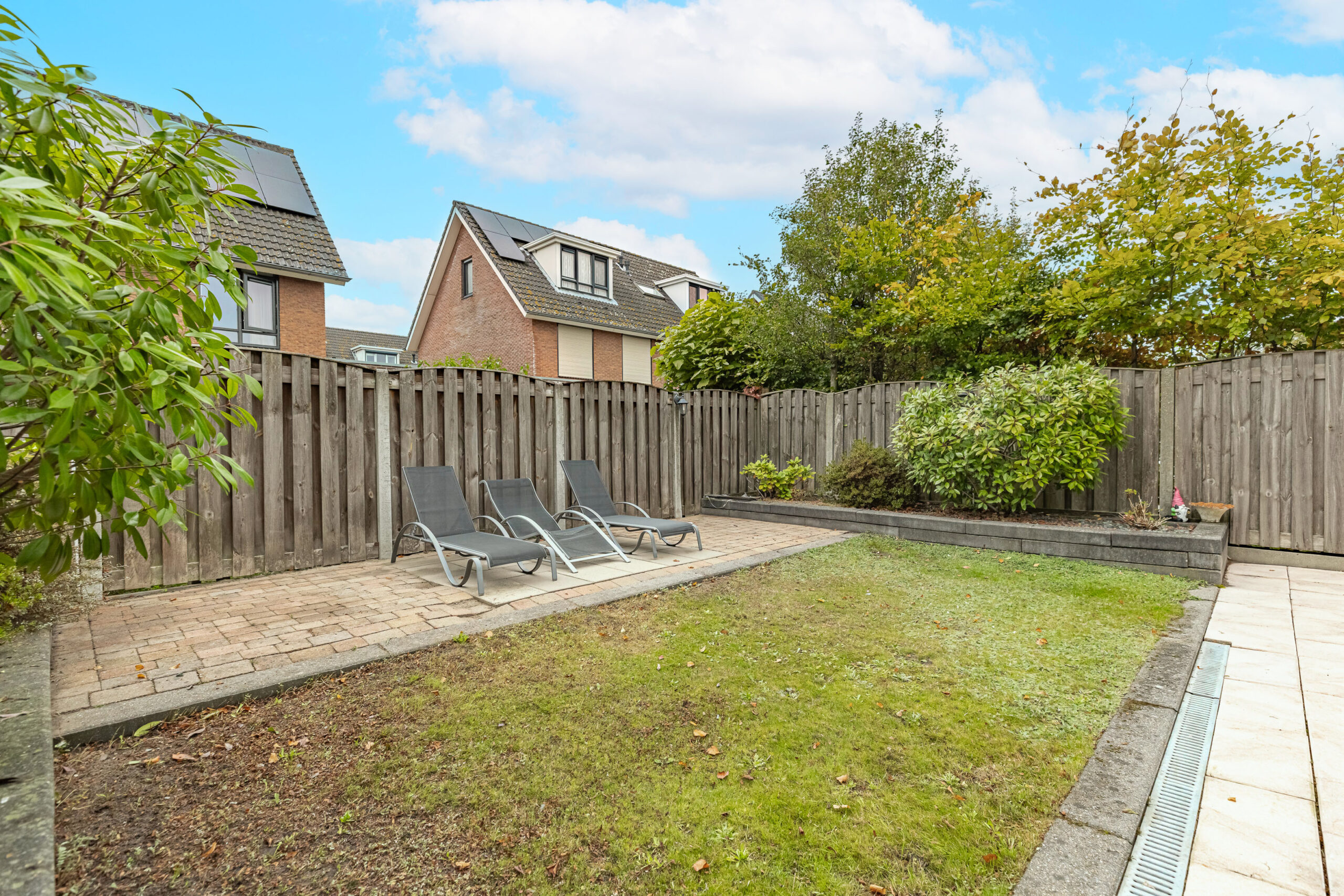 De tuin ligt op het westen, dus je geniet er volop van de middag- en avondzon. Er is een groot terras voor een loungeset of eettafel, een stuk gazon en borders met groene beplanting. Via de tuin heb je direct toegang tot de garage — ideaal voor fietsen of gereedschap.