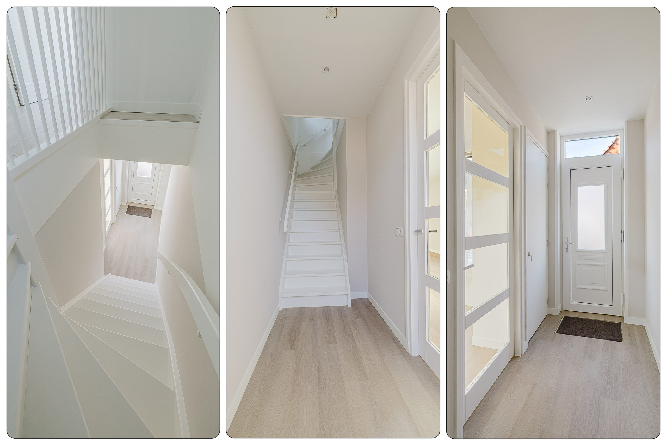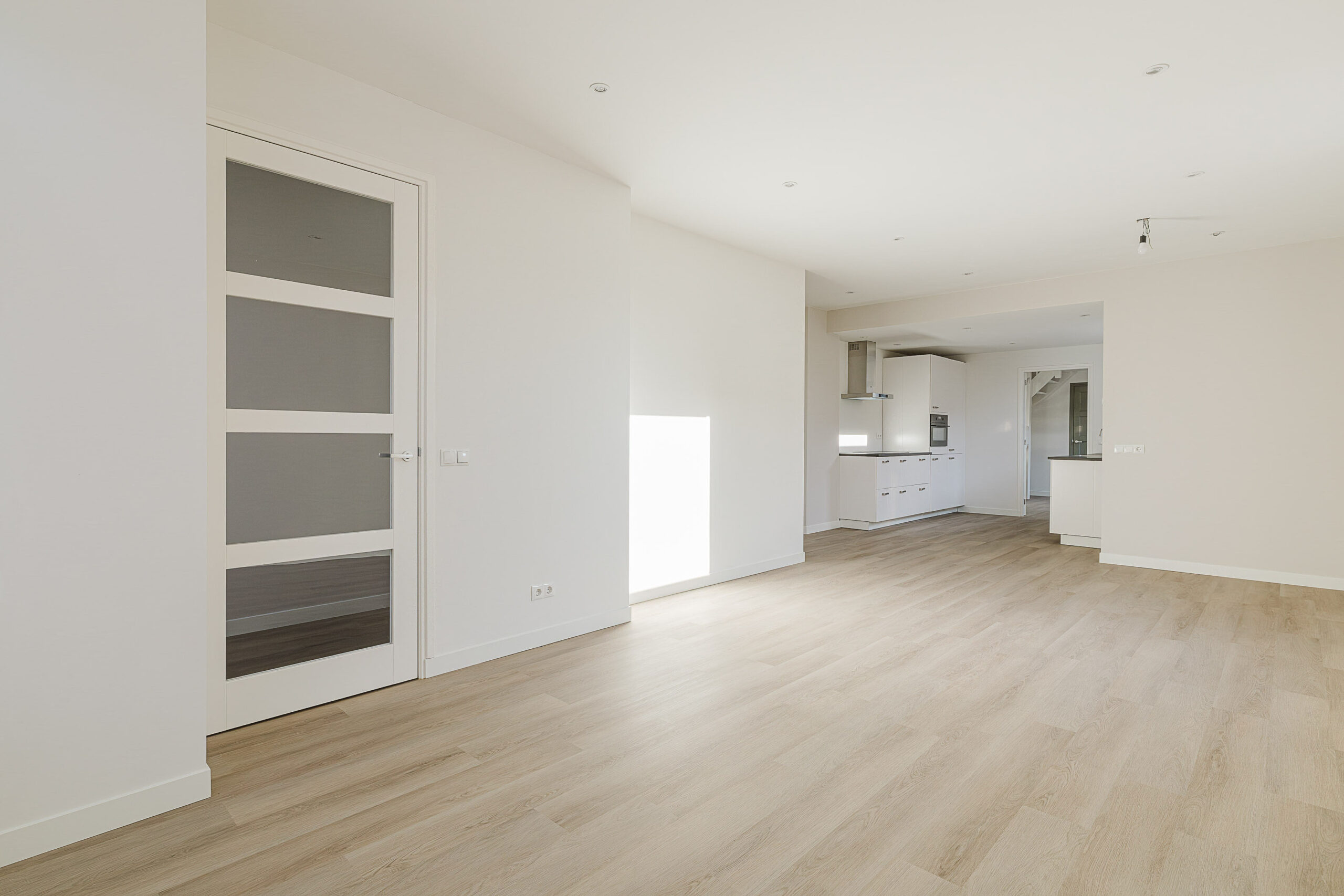 Via de entree kom je binnen in de hal met meterkast, die toegang geeft tot de woonkamer en de trapopgang naar de eerste verdieping. De riante woonkamer is strak afgewerkt met een lichte PVC-vloer en stucwerk wandafwerking en staat in open verbinding met de moderne keuken. De keuken, vernieuwd in 2025, is uitgevoerd in een rechte opstelling en voorzien van een inductiekookplaat, combimagnetron, koel-vriescombinatie, afzuigkap en vaatwasser. Vanuit de keuken bereik je de ruime bijkeuken waar zich de aansluitingen voor de wasmachine en droger bevinden. Tevens vind je hier het toilet en de vaste trap naar de zolder. Vanuit de bijkeuken is er direct toegang tot de tuin.