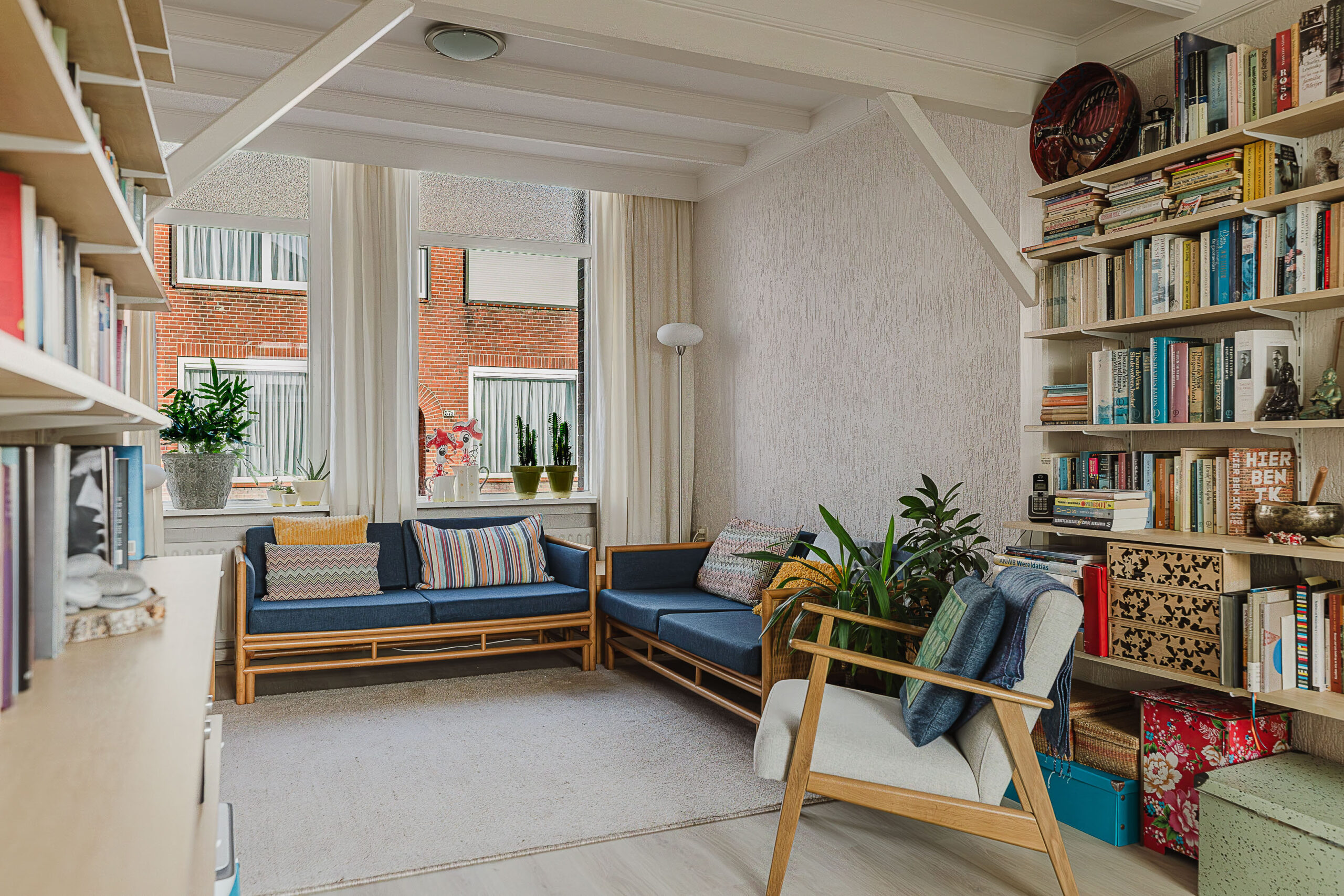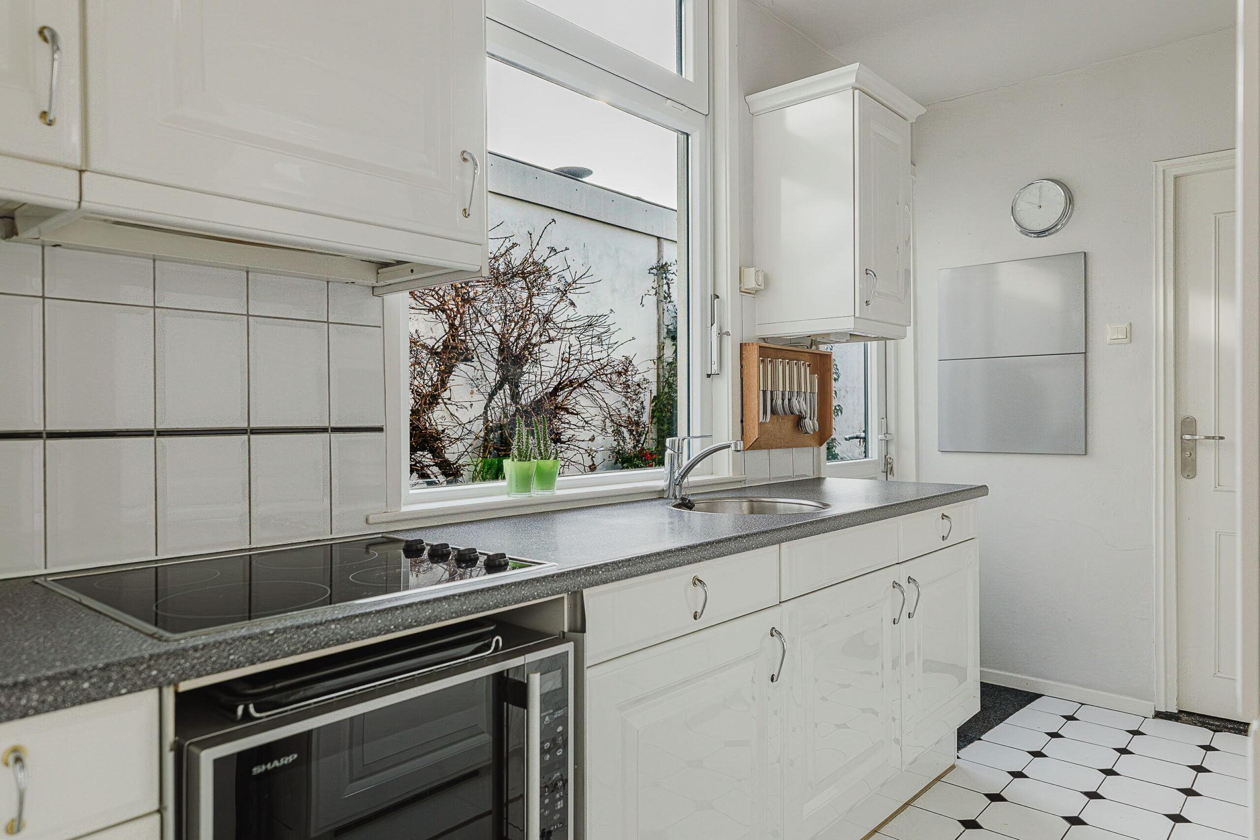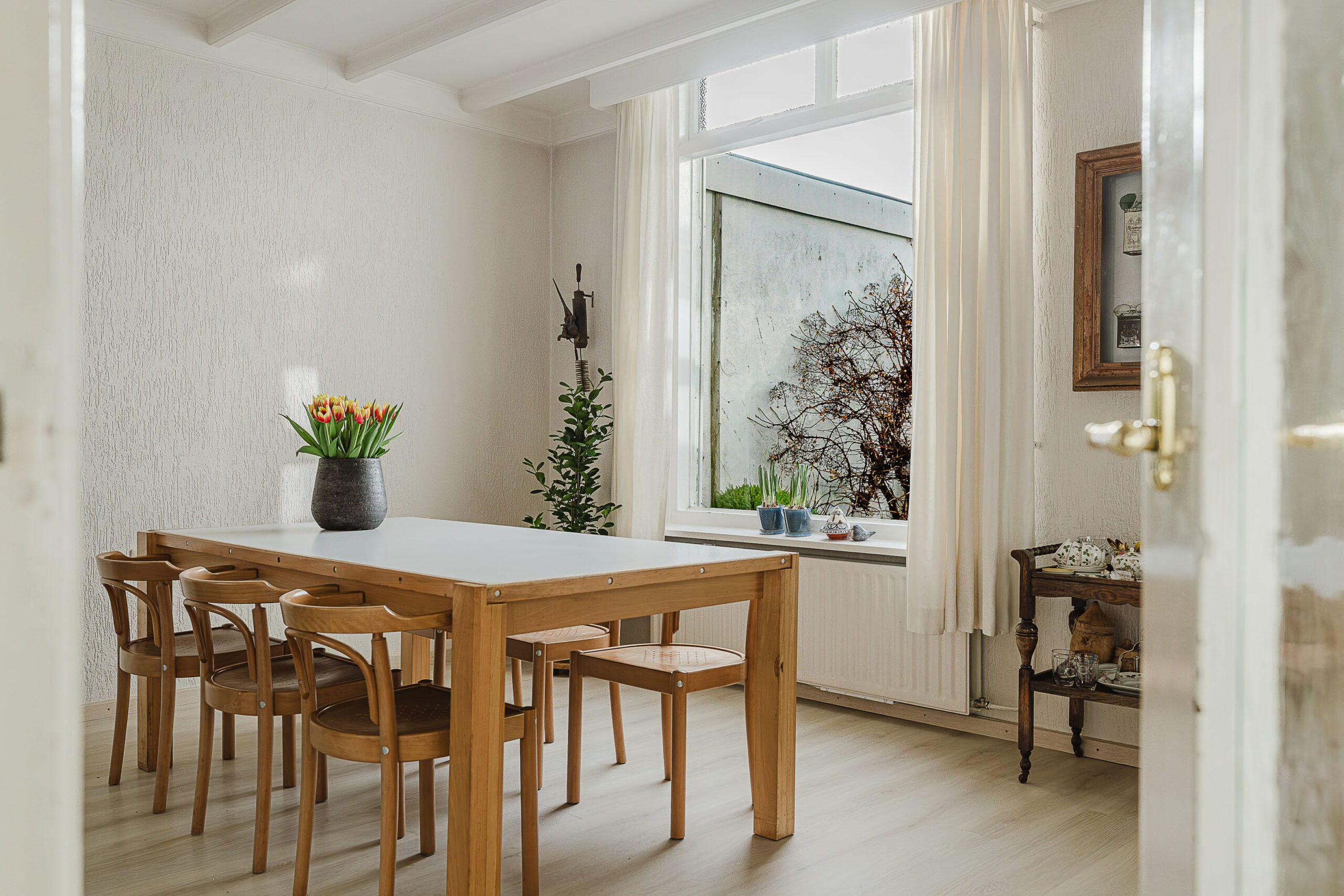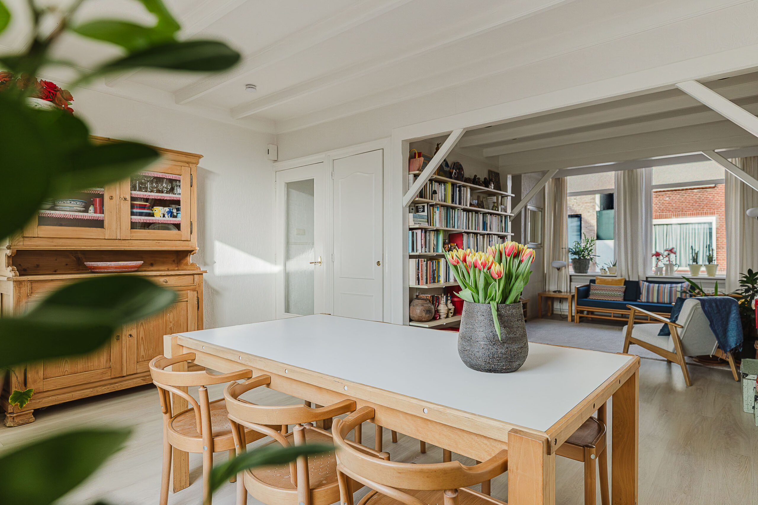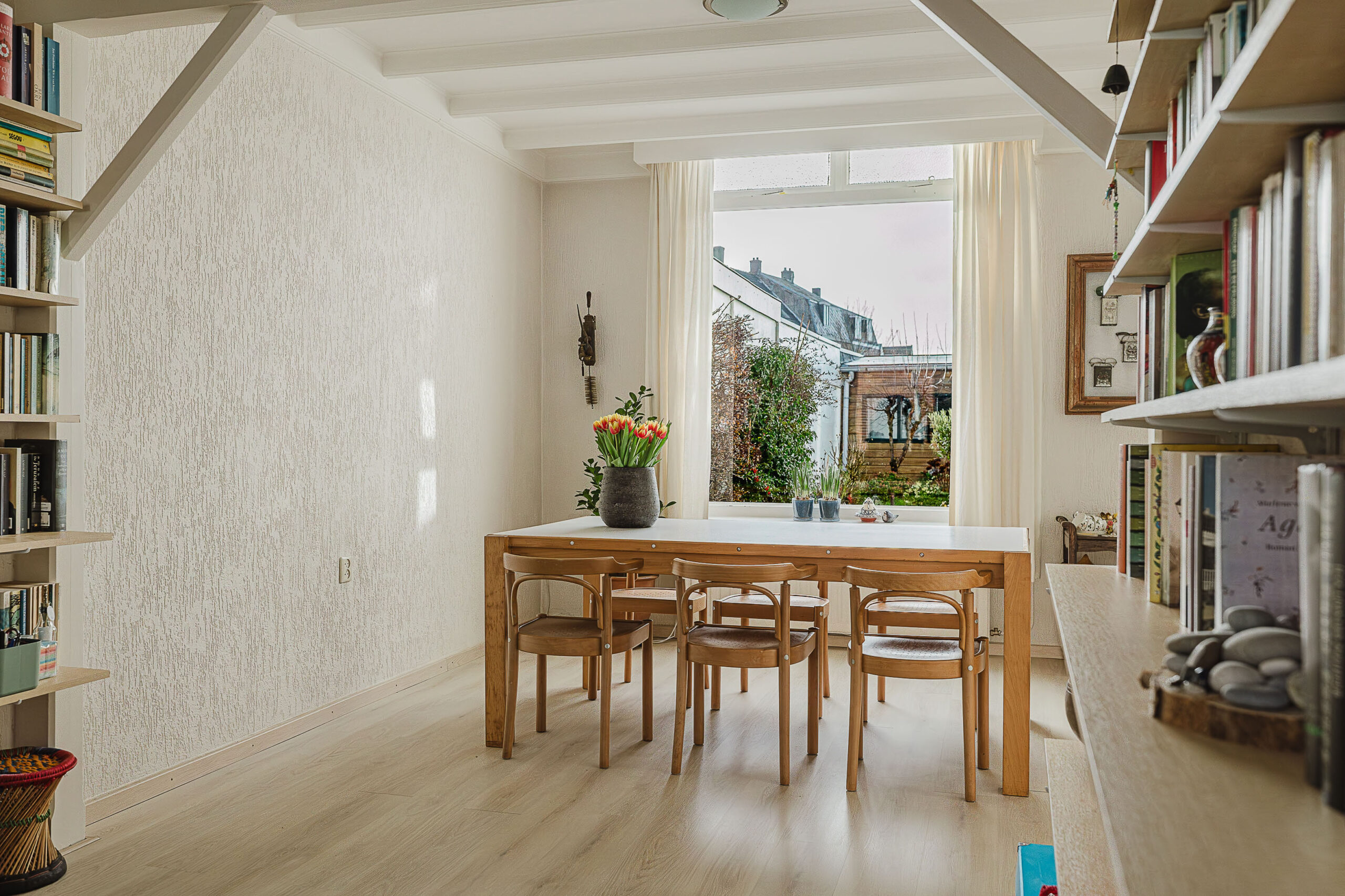 De begane grond is prettig ingedeeld en voelt licht en ruim aan dankzij de doorzon woonkamer, waar het daglicht van twee kanten mooi naar binnen valt. Dit zorgt voor een open en aangename sfeer. Aangrenzend bevindt zich de dichte keuken met inbouwapparatuur, die praktisch is ingericht en een fijn uitzicht biedt op de achtertuin.