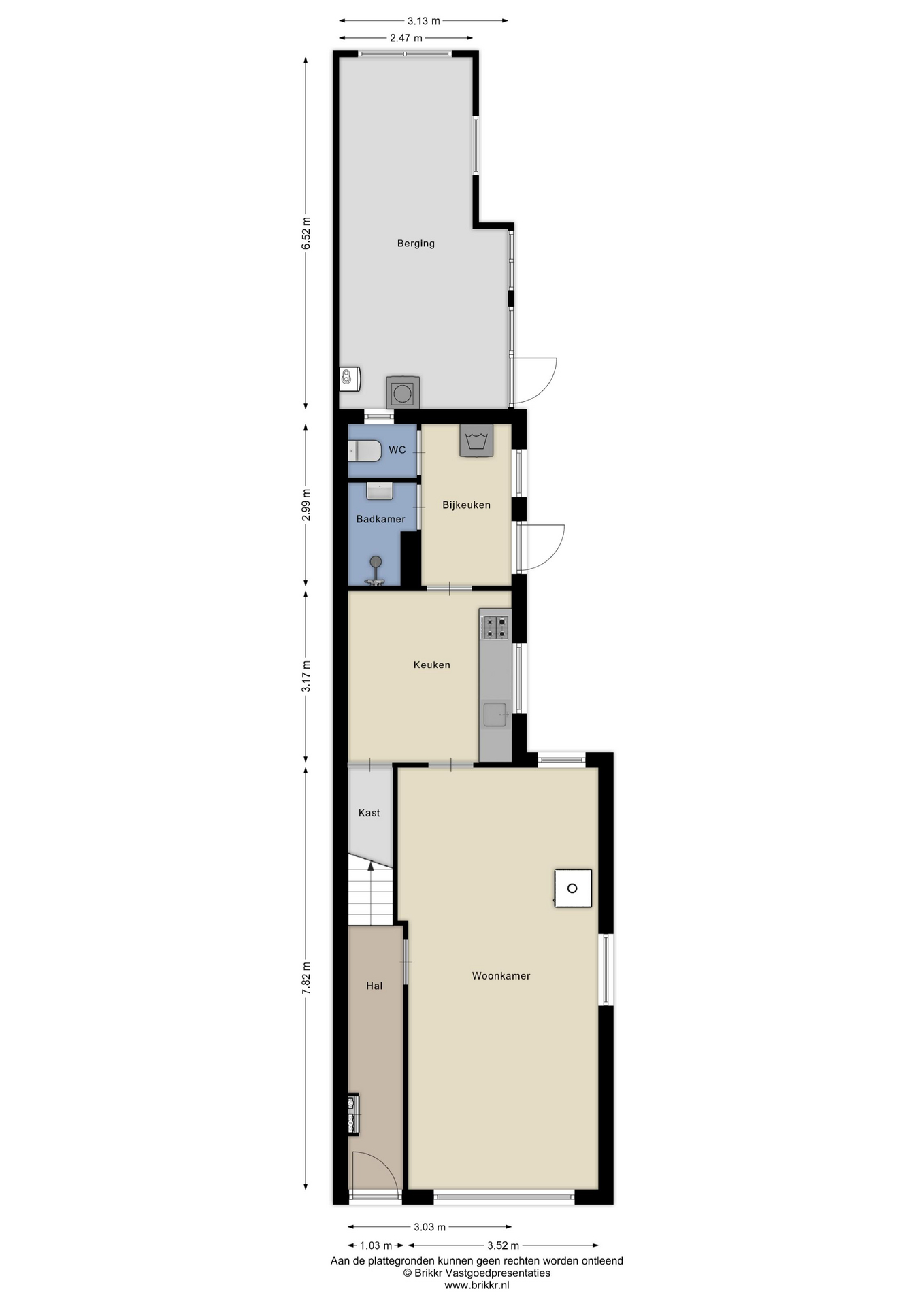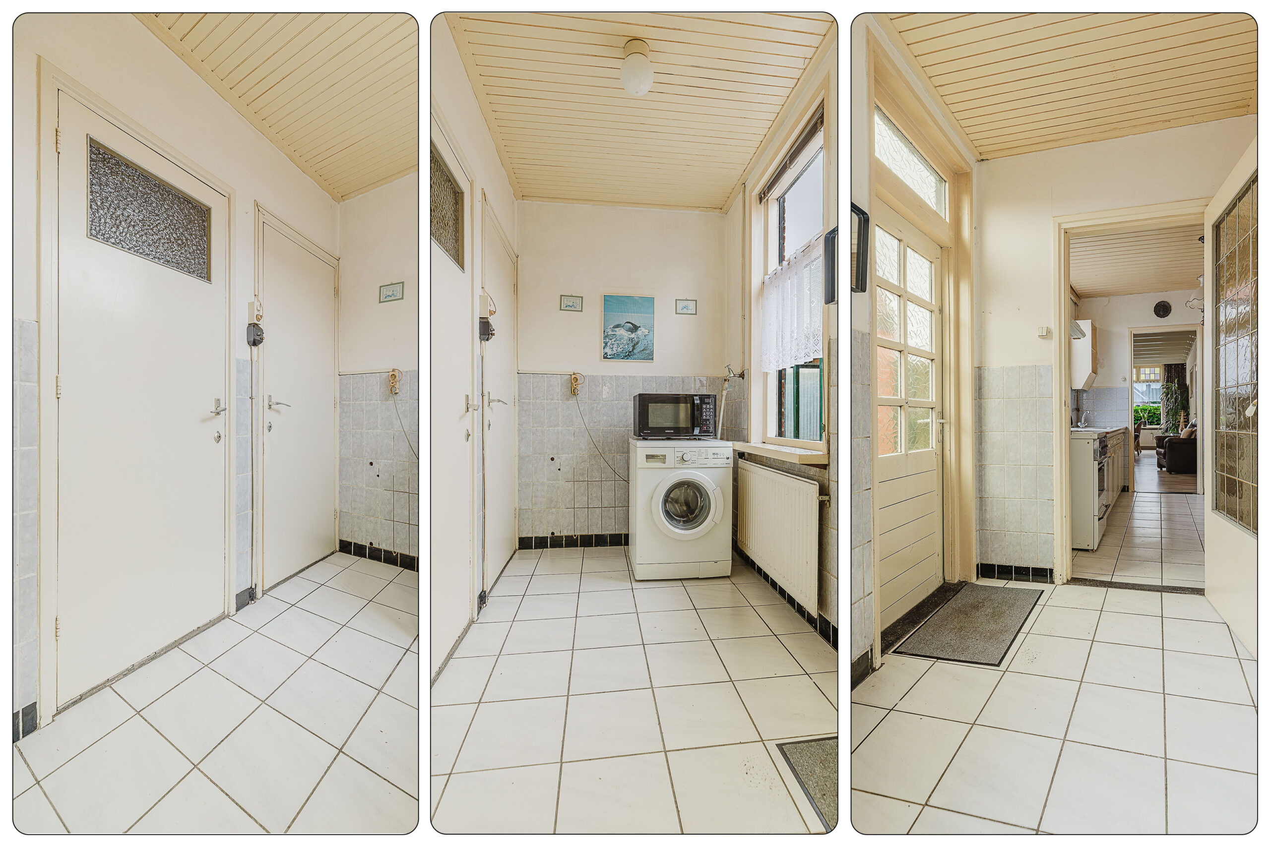 Achter de keuken bevindt zich een praktisch portaal met toegang tot het toilet, doucheruimte en tuin.