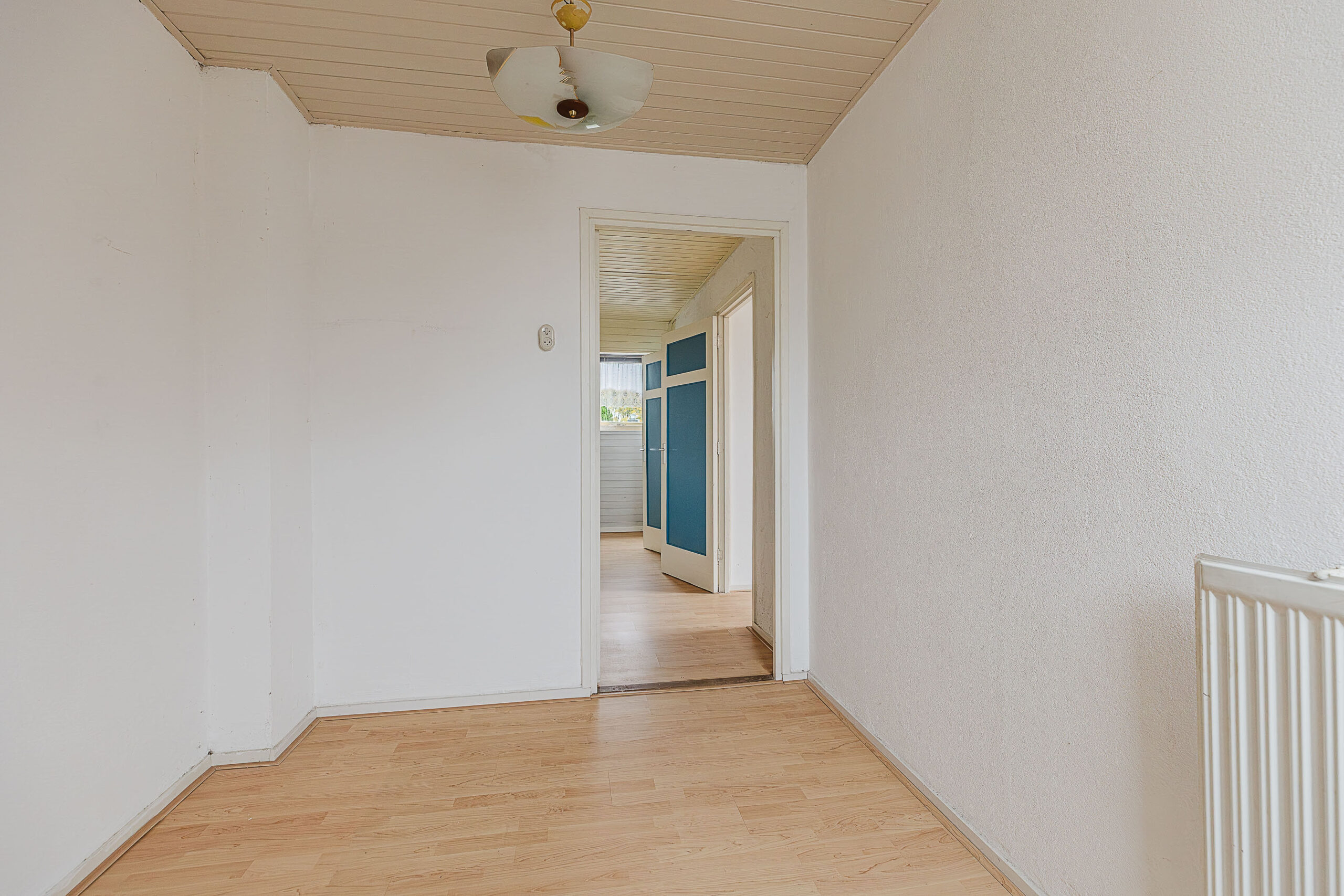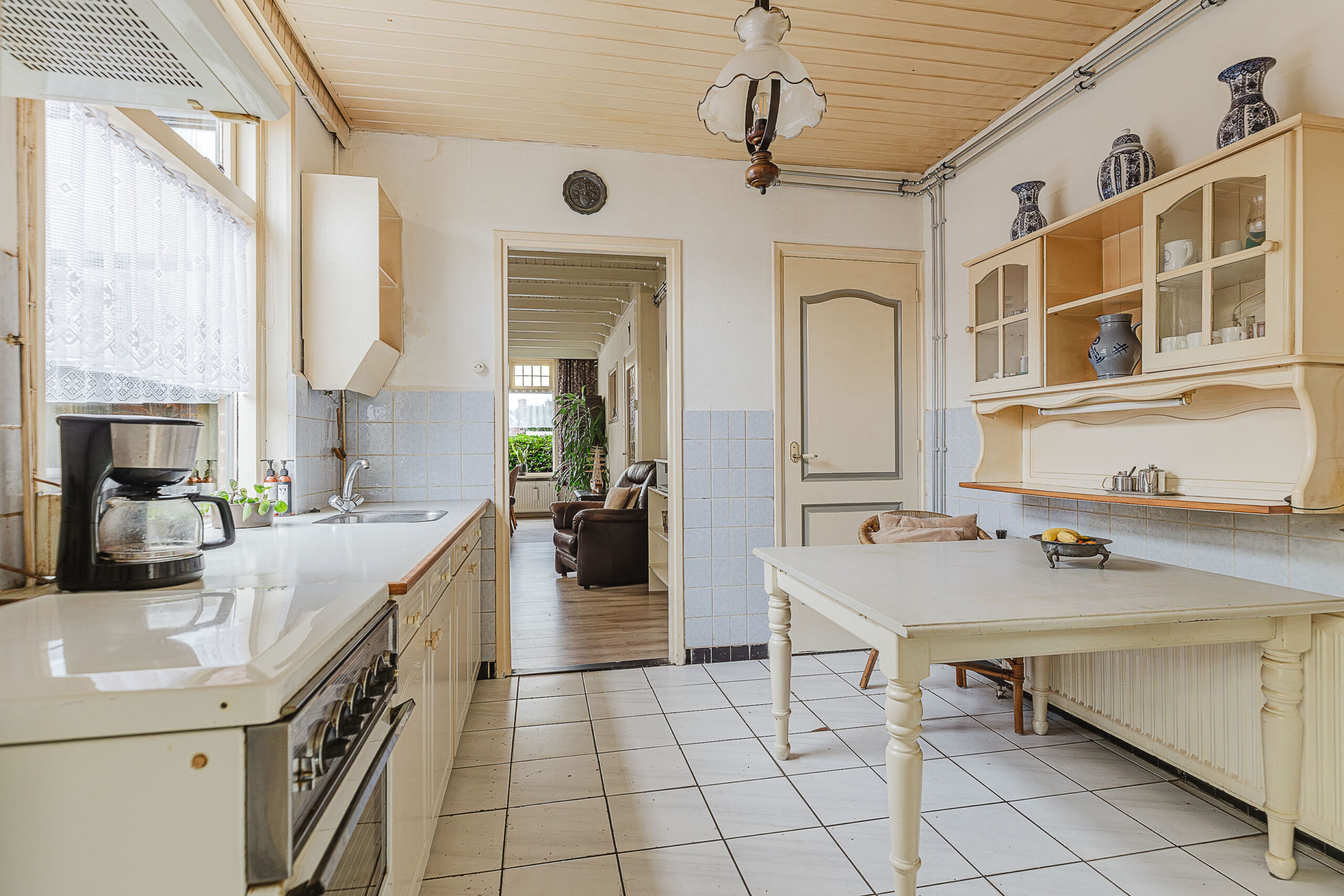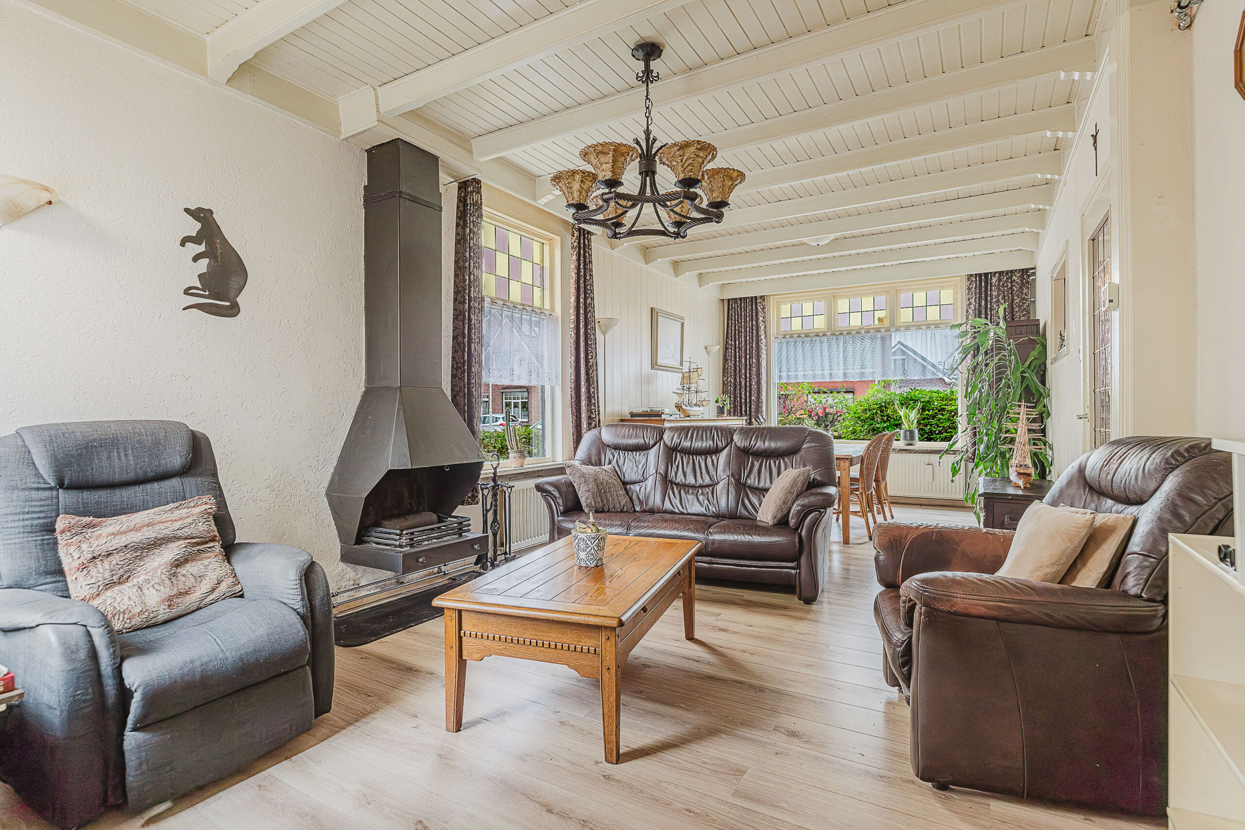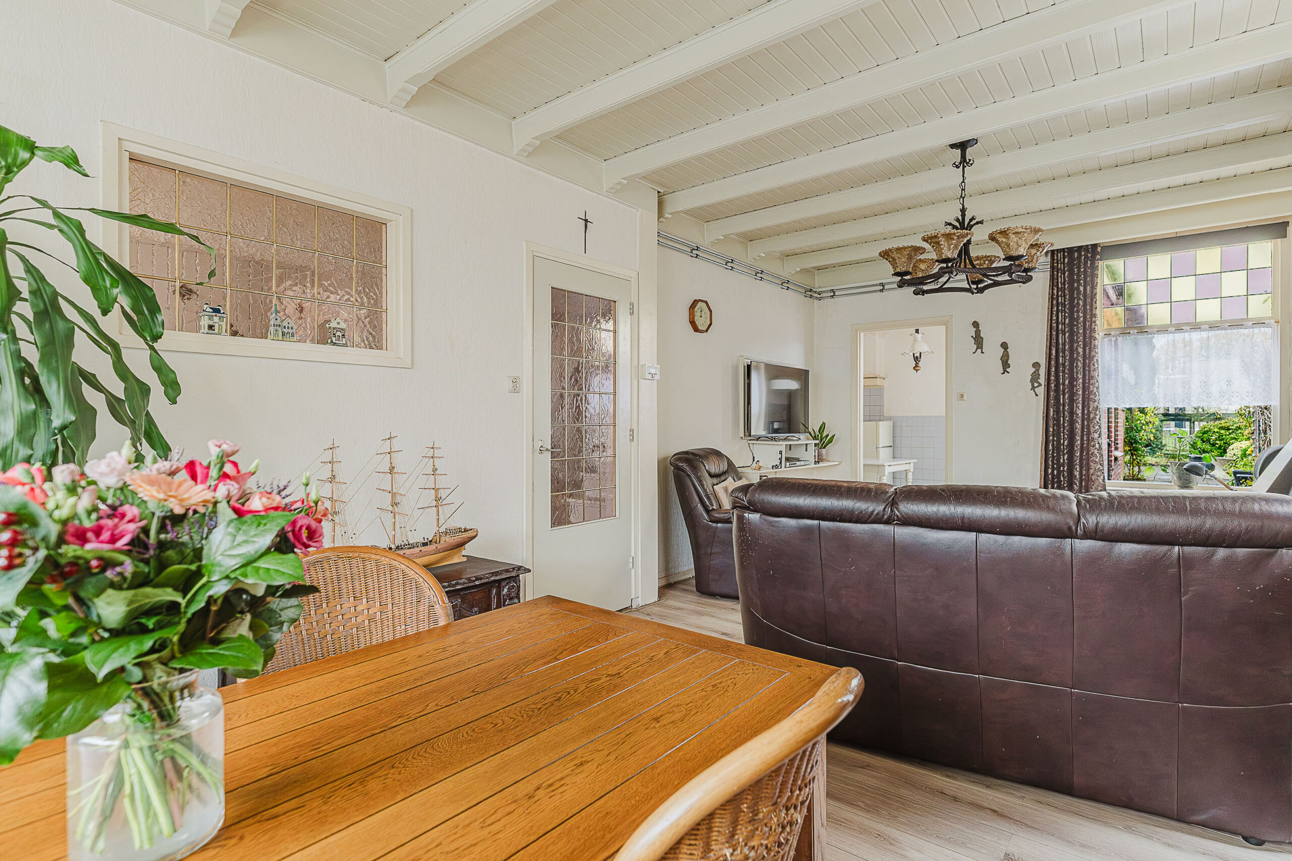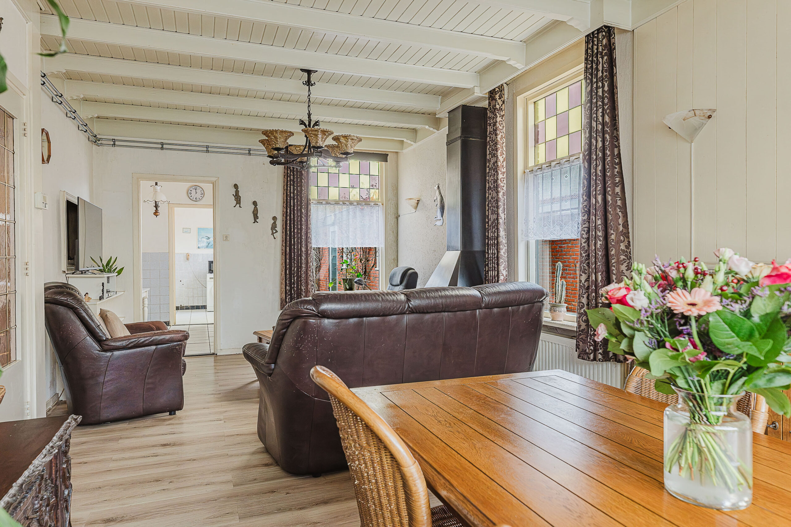 De woonkamer is licht en uitnodigend, met een prettige indeling en uitzicht over de voortuin en de rustige straat. Aansluitend vind je de uitbouw aan de achterzijde, waar zich de keuken bevindt. Deze ruimte biedt volop mogelijkheden om een moderne leefkeuken te creëren.